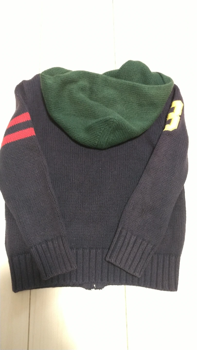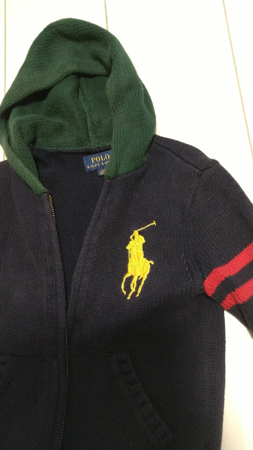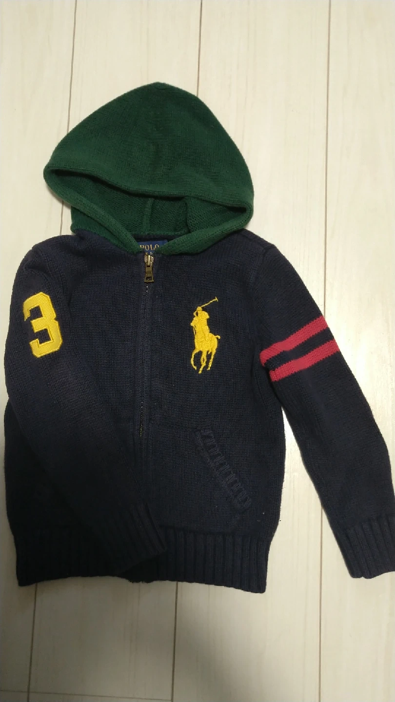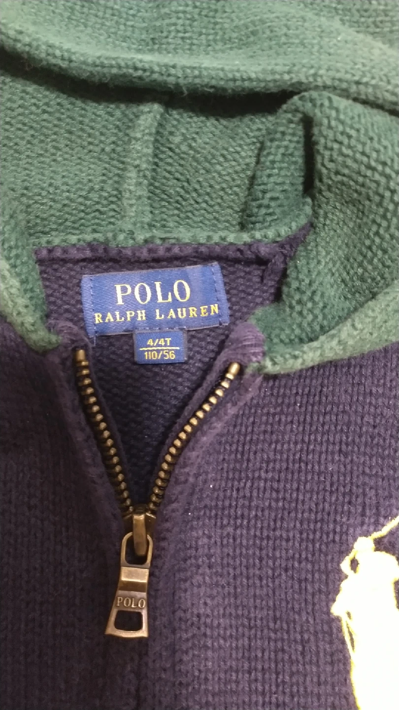 ポロラルフローレンのニットキッズパーカーです。 ・ブランド:ポロラルフローレン ・サイズ:4/4T(110/56) ・カラー:ネイビー、フードはモスグリーン ・デザイン:フード付き、ジップアップ、袖に赤いライン、胸に黄色いロゴ、腕に数字の「3」 目立った汚れやほつれ、傷はありませんが、複数回の洗濯による色あせと、使用感があります。 中古品であることご了承いただける方、ぜひご検討ください。 他にも子供服を出品しておりますので、まとめ買いご相談ください。