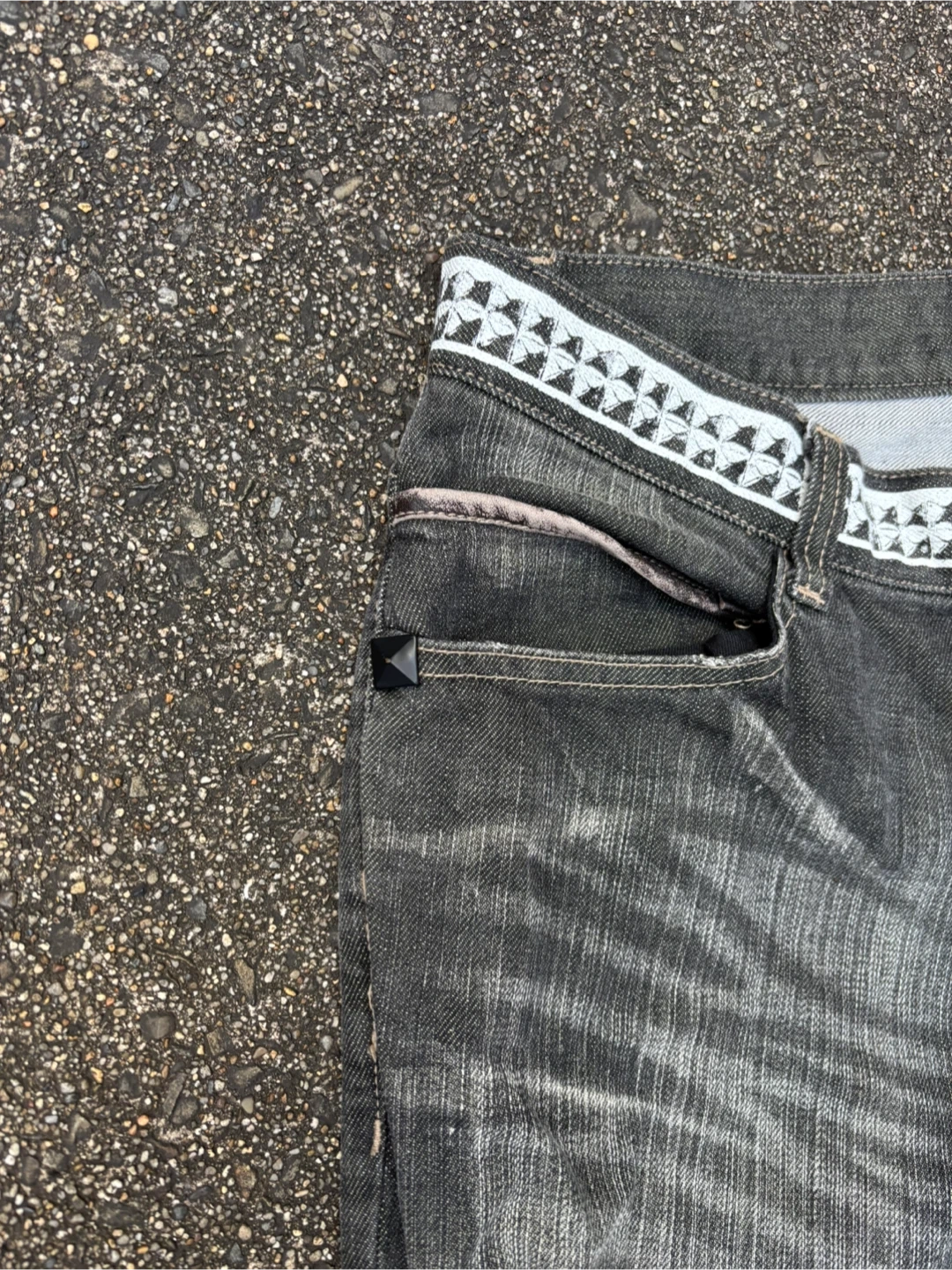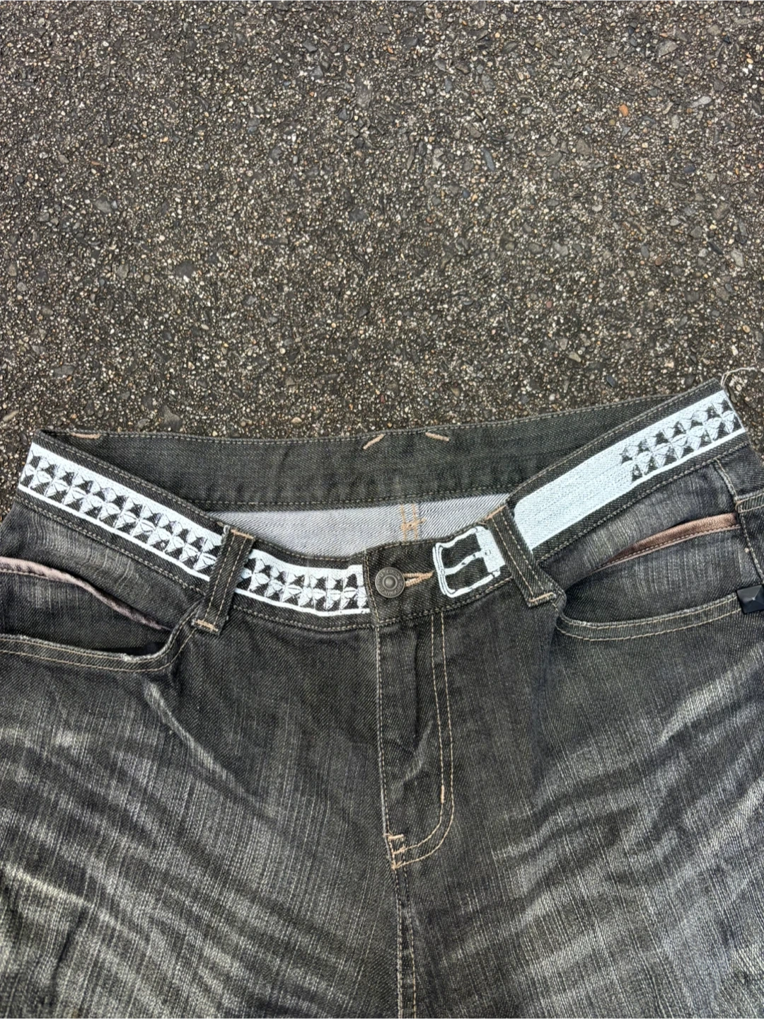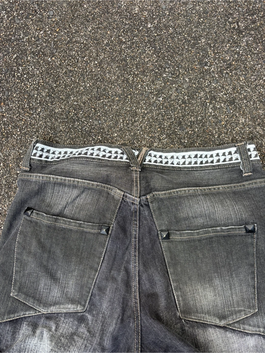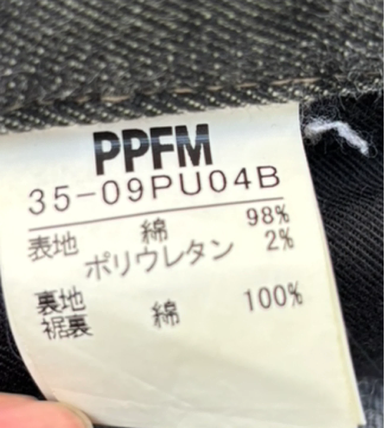 ★商品説明 PPFM デニムパンツ グレー y2k archive 平成 ギャル グランジ  ダークコア パンク お兄系 opium 腰パンで履いて裾をためる 履き方をするとかなり かっこいいです。 ベルト穴のところに白でベルトのデザインが かかれており他と被らないデザインです ★サイズ Lサイズ 総丈106cm 股上 30cm 股下76cm ワタリ幅 26cm 裾幅16cm ウエスト84cm 平置き42cm ★状態 多少の使用感はございますが大きく 目立つ汚れはなく問題なく着用可能です。