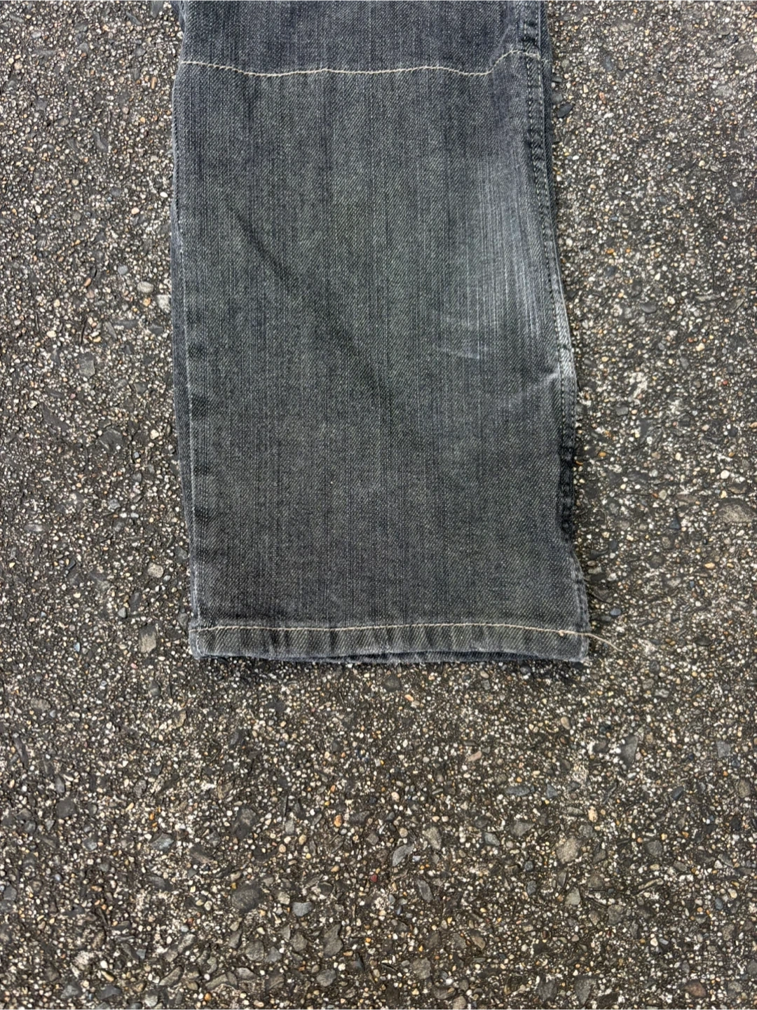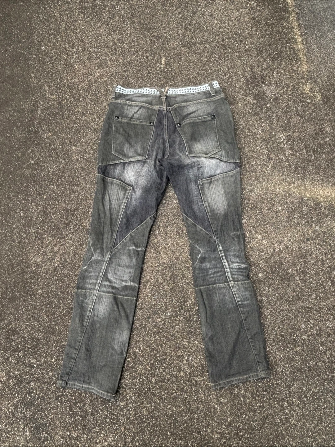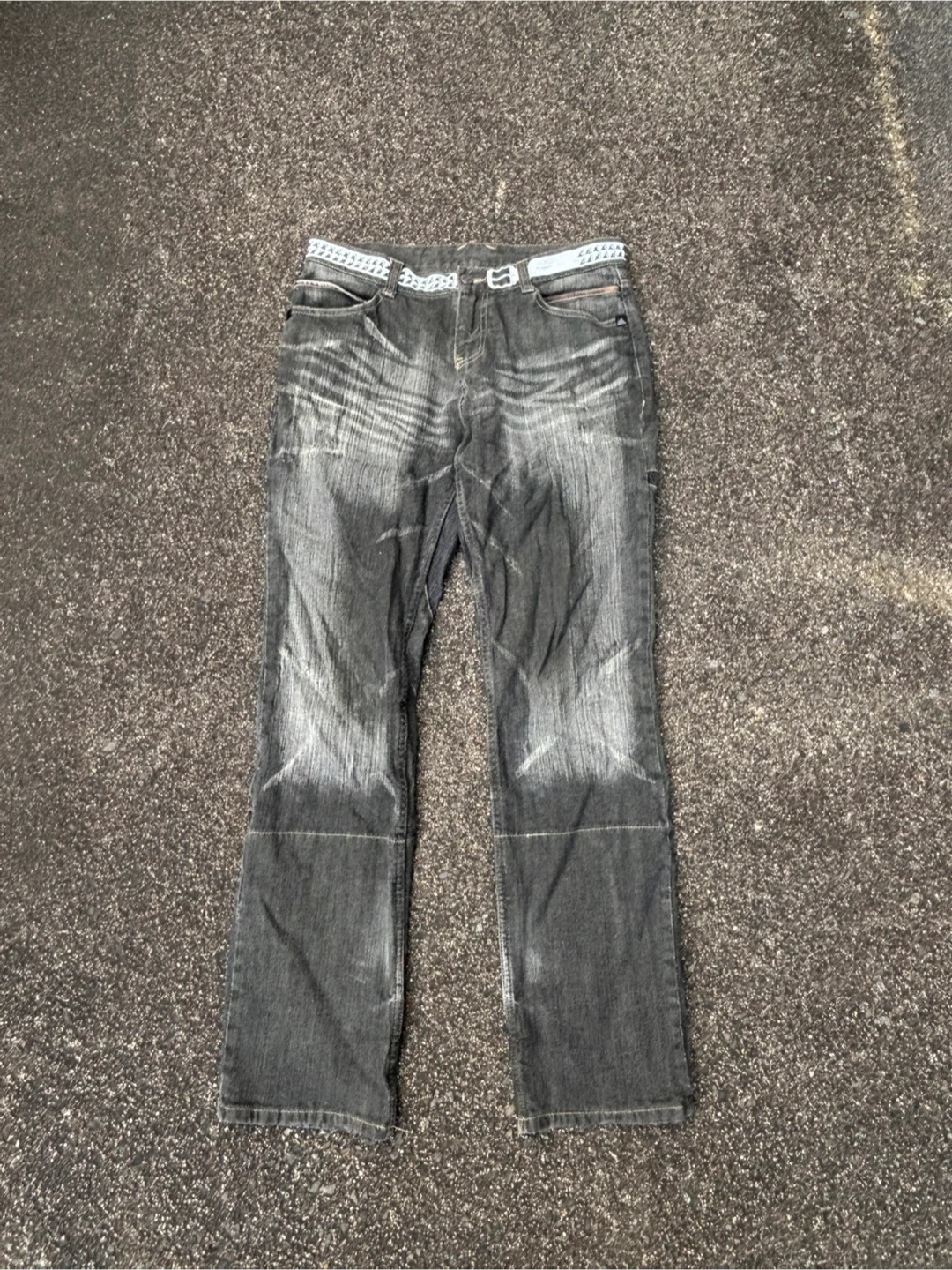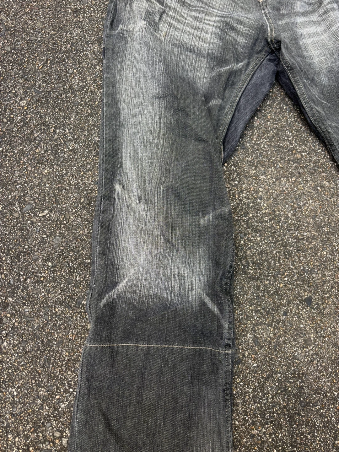 ★商品説明 PPFM デニムパンツ グレー y2k archive 平成 ギャル グランジ  ダークコア パンク お兄系 opium 腰パンで履いて裾をためる 履き方をするとかなり かっこいいです。 ベルト穴のところに白でベルトのデザインが かかれており他と被らないデザインです ★サイズ Lサイズ 総丈106cm 股上 30cm 股下76cm ワタリ幅 26cm 裾幅16cm ウエスト84cm 平置き42cm ★状態 多少の使用感はございますが大きく 目立つ汚れはなく問題なく着用可能です。
