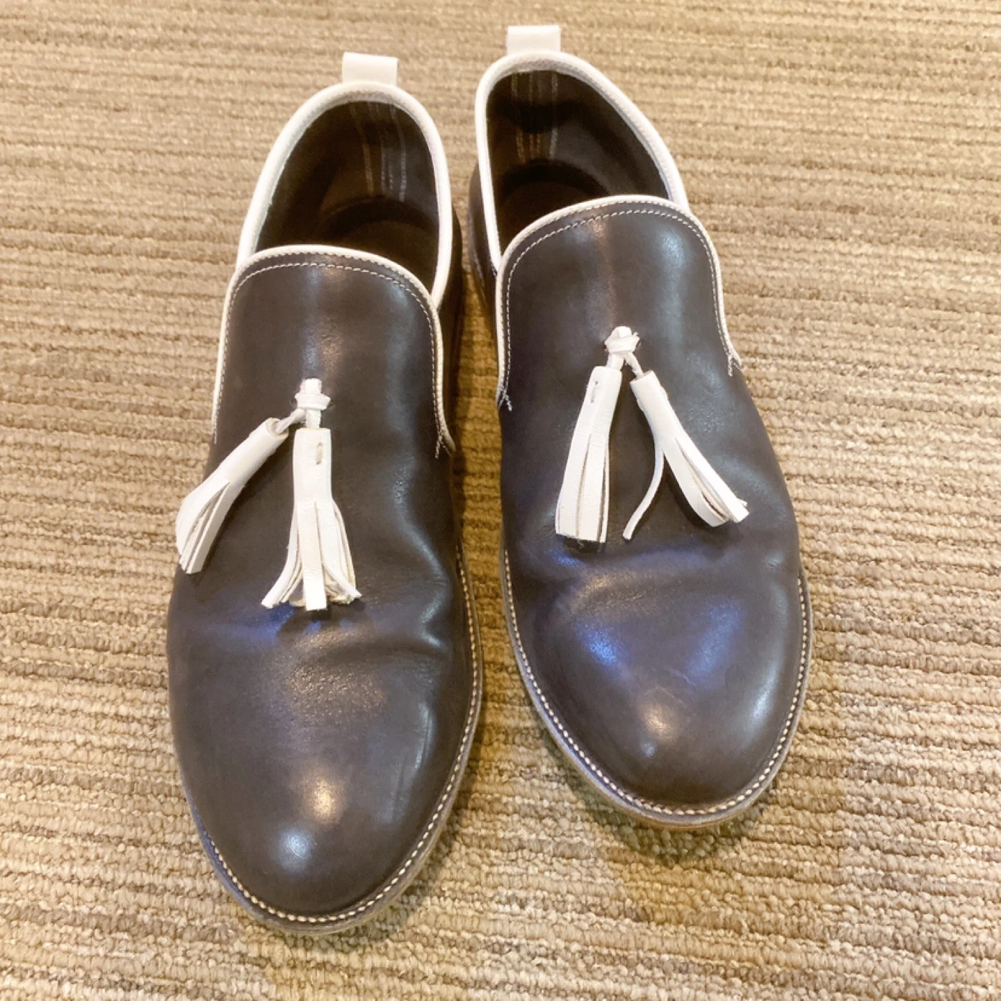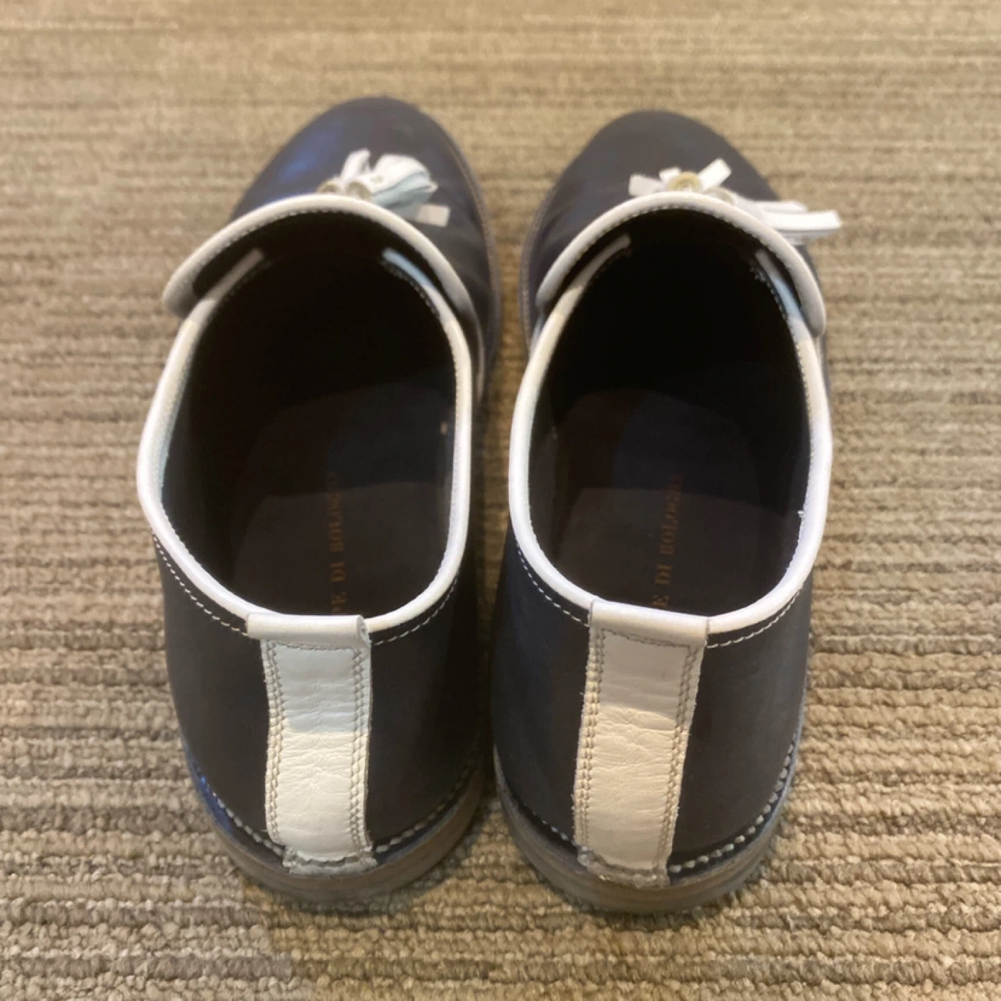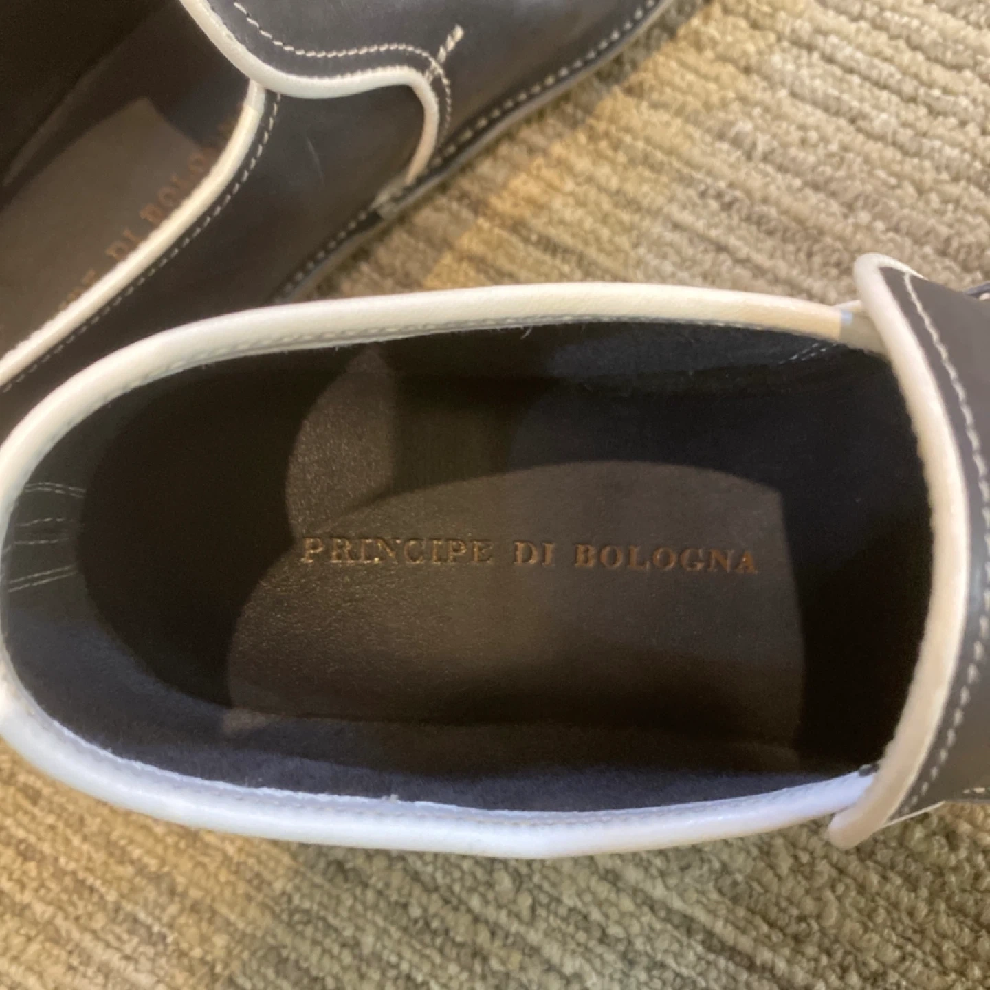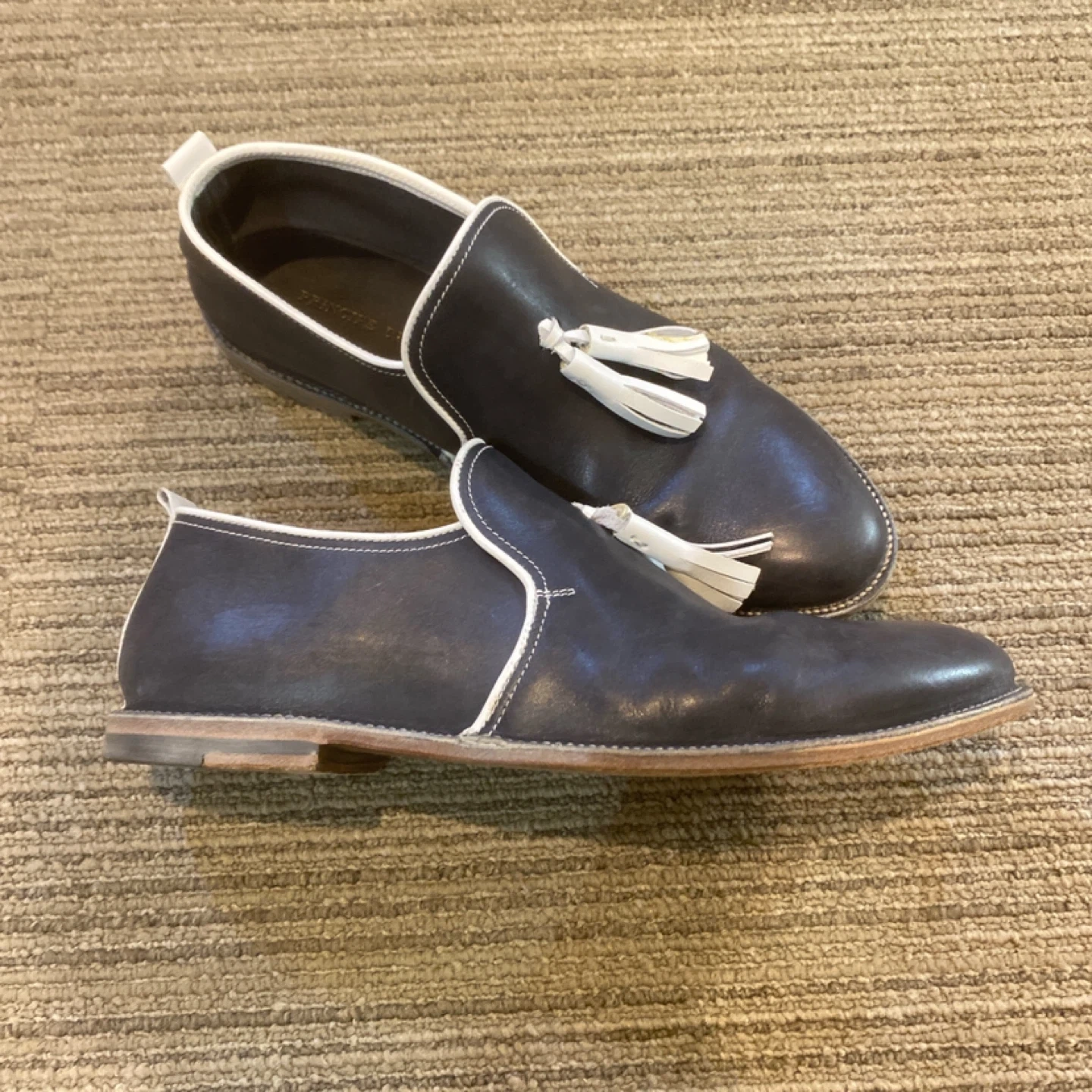 PRINCIPE DI BOLOGNA  プリンチぺ ディ ボローニャ ネイビータッセルスリッポン アッシュペーフランス  サイズ38 (24cm前後くらい) 柔らかい革を使用してあります。 デザインも素敵で気に入っていて、1度履いたのですが、サイズが合わず残念ながら出品させていただきます。 落ち着いたネイビーの色と白のアクセントが大人っぽく爽やかさを演出してくれます。 正装にはもちろん、カジュアルにも使える1足です。 箱なしイタリア製 個人保管なので、 神経質な方はご確認の上、お願い致します☺︎ タバコは吸いません
