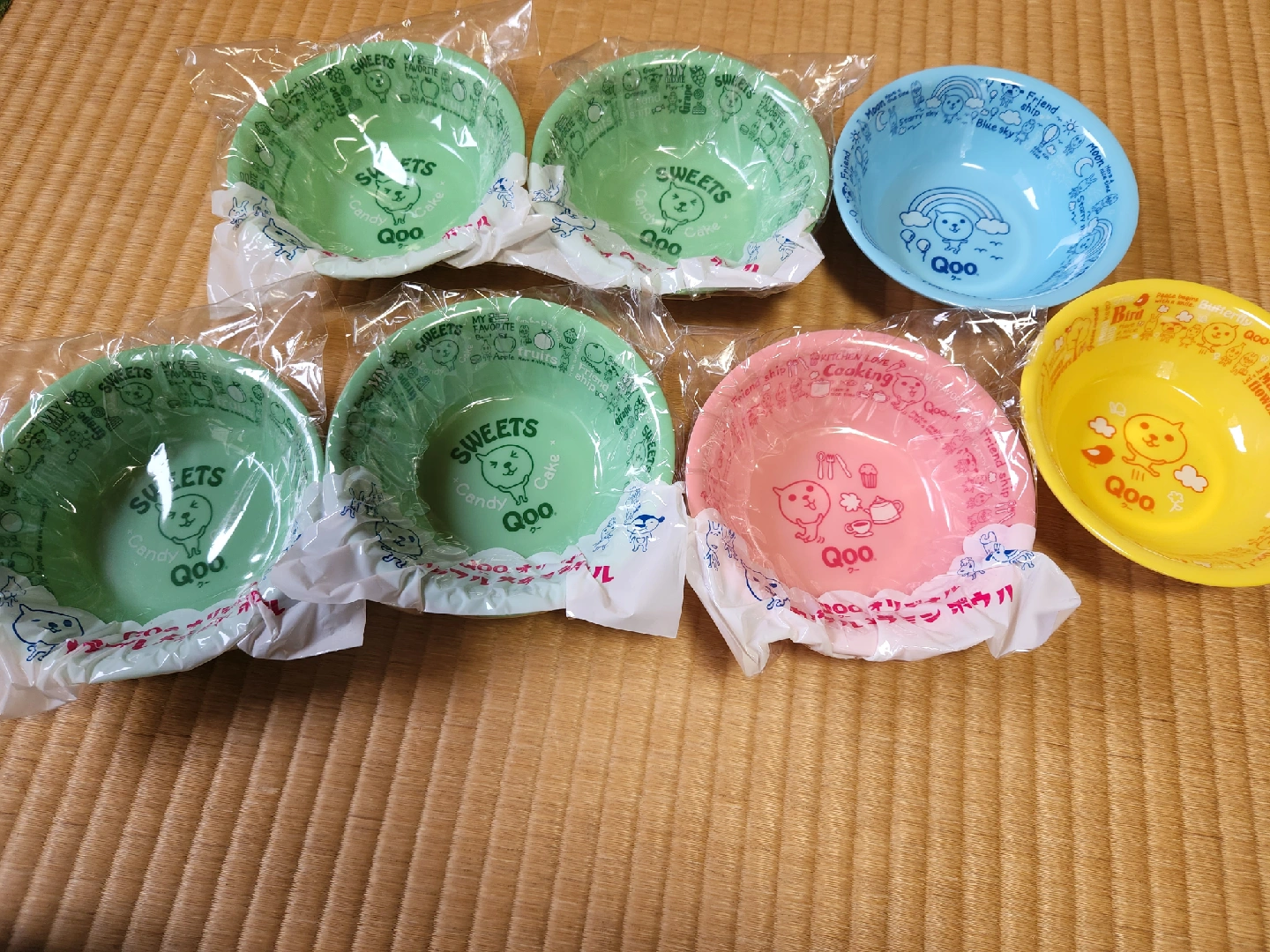Qooのオリジナルメラミンボウルです ・色:緑、青、ピンク、黄色 ・状態:未使用 中古品であることご了承ください 袋がないのもありますが、未使用なので 状態はよいです!