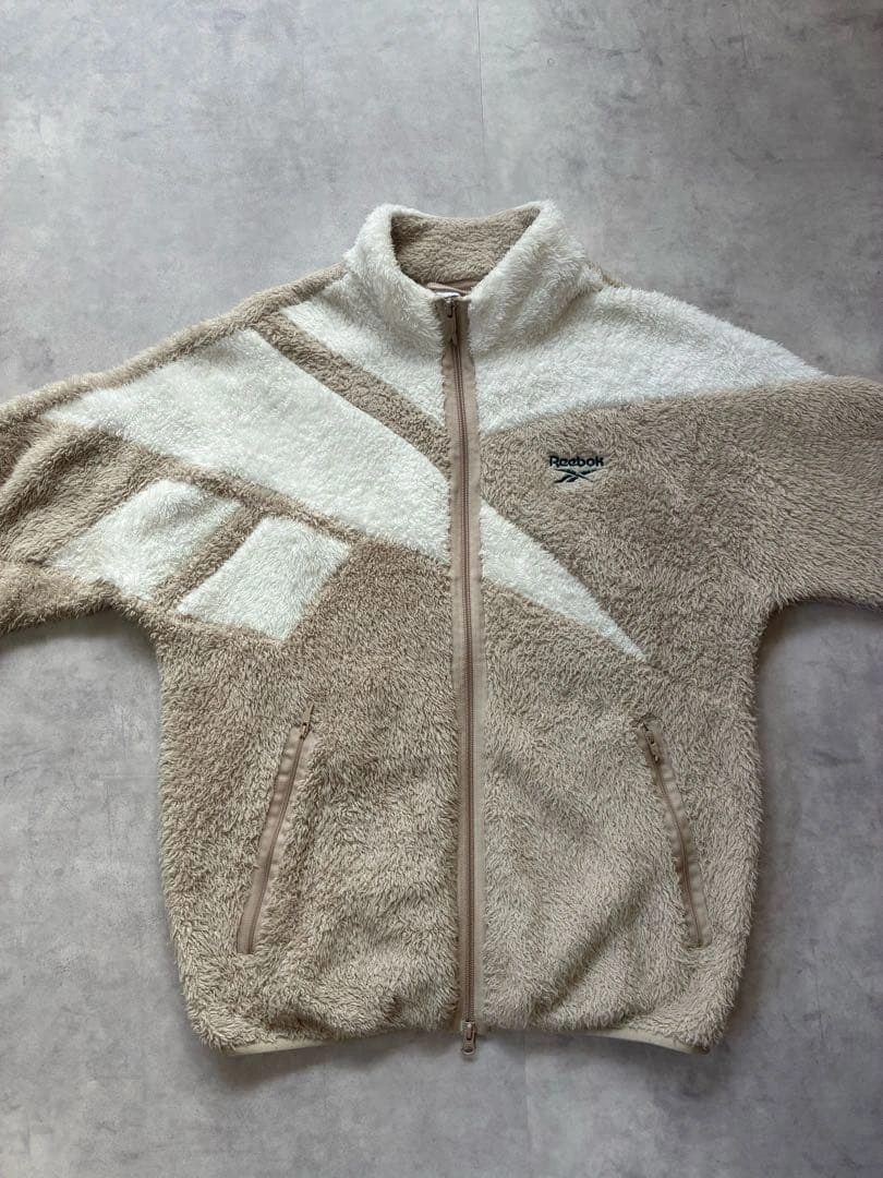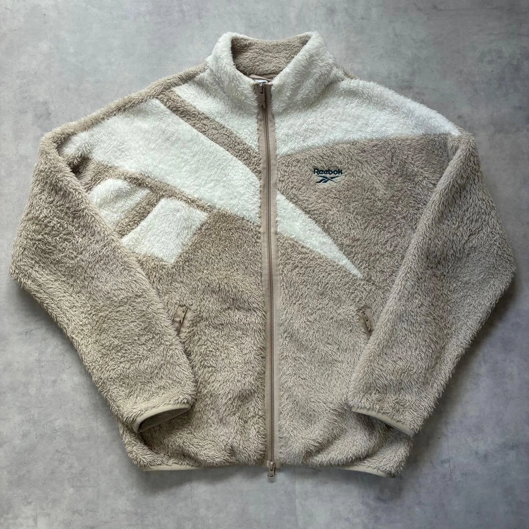 リーボックのボアジャケットです。 大きいロゴが特徴で、ファスナーもロゴ入りでかわいいと思います。 柔らかいボアで着心地が良いです。裾の部分が締まっているので、風を通しにくく冬にも使えると思います。 トレンドの短丈とダブルジップです。 毛玉がちらほらありますので、ご確認ください。 身幅…60cm 着丈…66cm 裄丈…79cm(ラグラン) ご希望の方はお気軽にご連絡ください。
