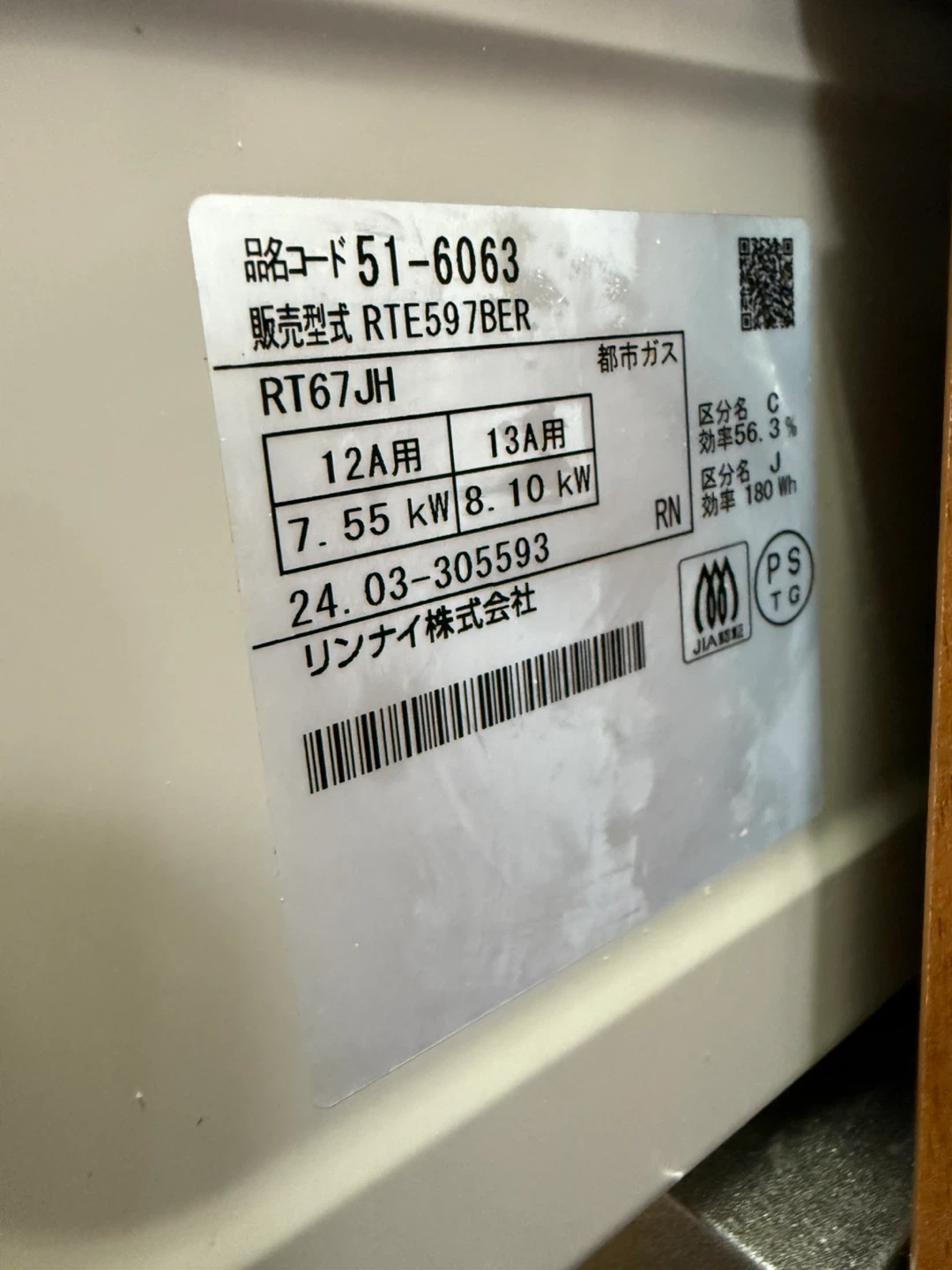 【商品名】 ・Rinnai(リンナイ)ガスコンロ RTE597BER 都市ガス用 2023年製 ※ホース、コンロの電池付きに加えて、山崎産業のコンロ奥隙間ラック(品番:4783)もお付けします。 比較的新しい年式のものでございます。 おおよそのサイズ:幅596mm×奥行452mm×高さ218mm 【特徴】 ・信頼のブランド「Rinnai」のガスコンロ。 ・型番 RTE597BER(片焼グリル・右側強化力) ・都市ガス対応、キッチンにぴったりのデザイン。 ・高火力&省エネ設計で、料理がスムーズに! 【状態】 ・動作確認済みで問題なく使用可能です。 ・2年弱の使用に伴う多少の傷や汚れはありますが、一般的な掃除を施しているため、状態は悪くないと思います。 ただ、完美品を求める方、神経質な方はご購入をお控えください。 【その他】 ・快適な料理生活をサポートするガスコンロ。 ・ガスコンロをお探しの方、必見です! ・お値引き交渉にも柔軟に対応いたしますので、お気軽にご相談ください。 ご購入後のキャルセルは受け付けておりませんので、よくご確認頂き、お間違えのないようにご購入をお願いします。 また、商品すり替え防止などの為、返品や交換は致しかねますのでご了承下さい。宜しくお願い致します。 気になる点があれば、質問もお待ちしております! お早めにどうぞ! 【受け渡し場所】 場所を設定させてしておりますが、お気軽にご相談頂ければと思います。