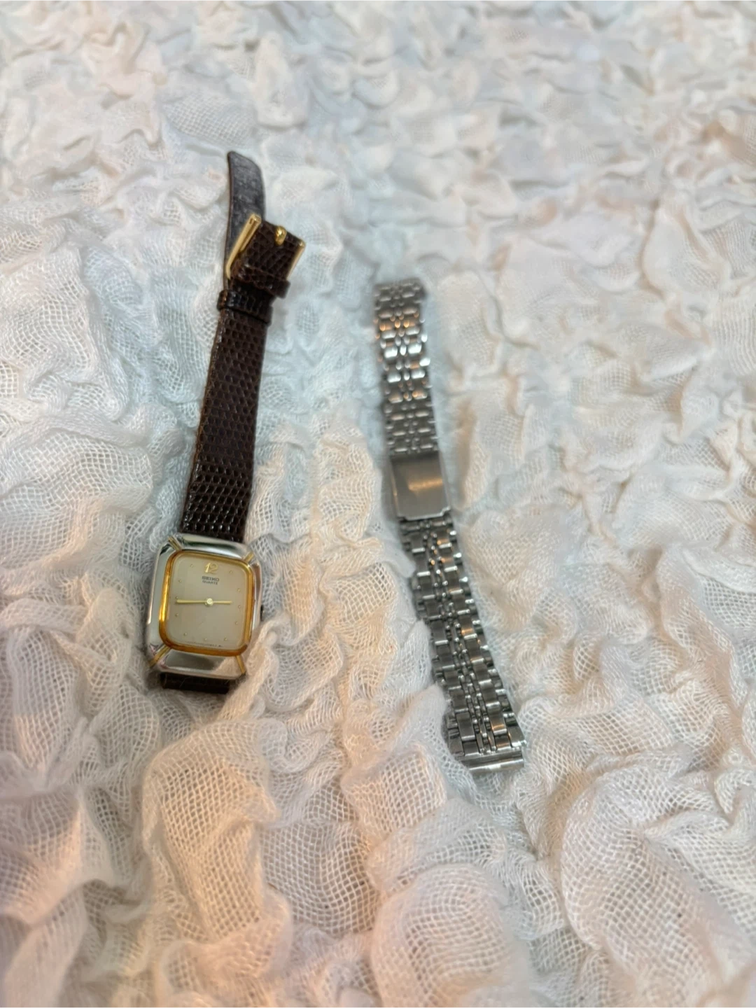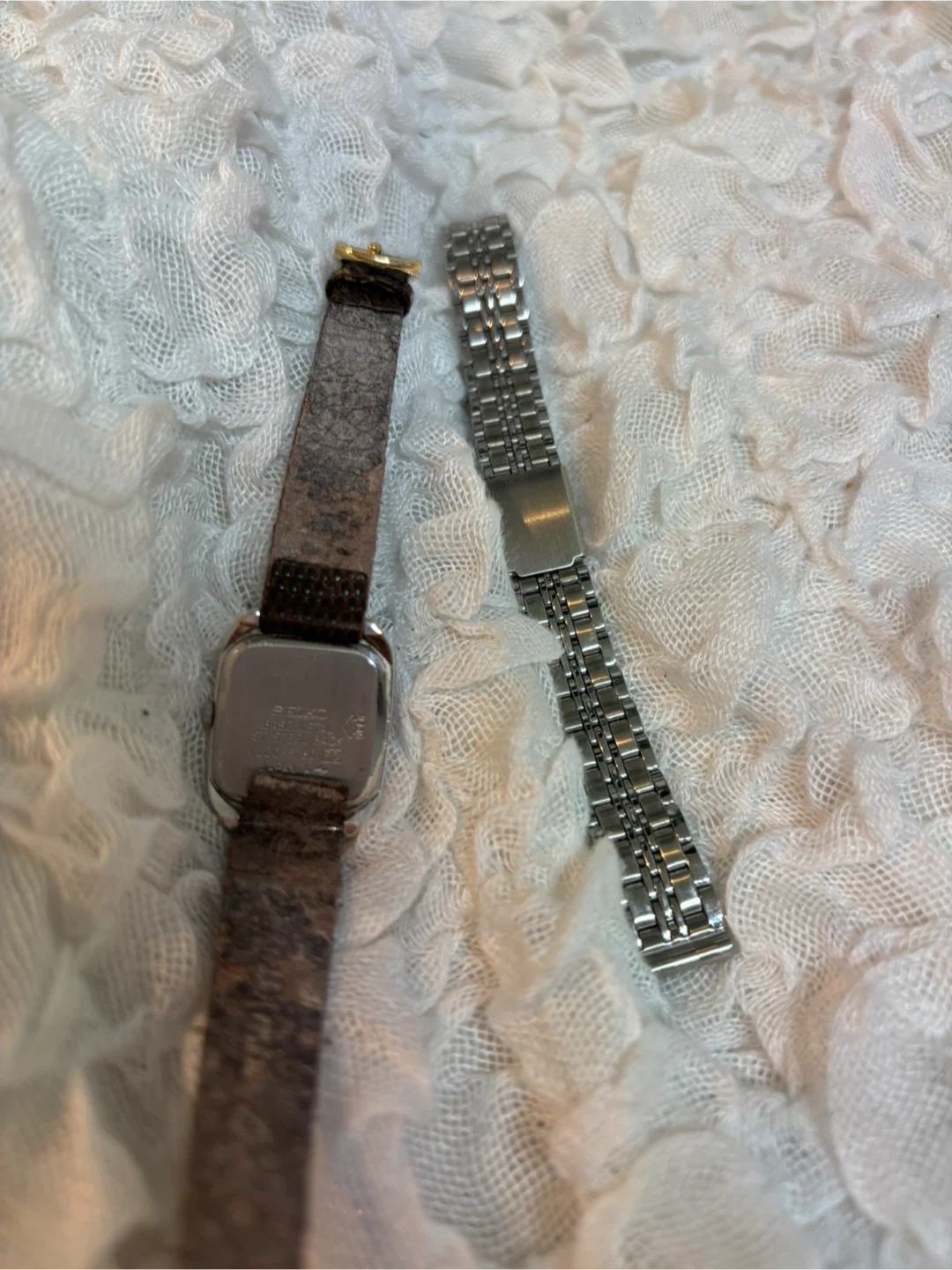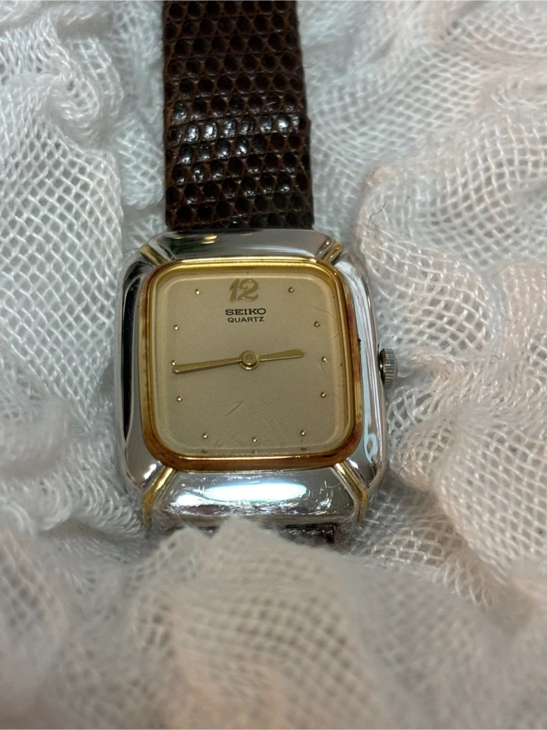 SEIKOのレディース腕時計 クォーツ式 電池が切れたままの状態で長期保管してました。電池交換すれば動くかもしれませんが保証はできないのでジャンク品とします。 本体一部金属パーツに変色あり。 ガラス面を含めて全体的に小傷があります。 現在付いているベルトの経年劣化が酷いので時計サイズに対応するブレスバンドをお付けします。 現状でのお渡しになります。 神経質なかたはご遠慮下さい。