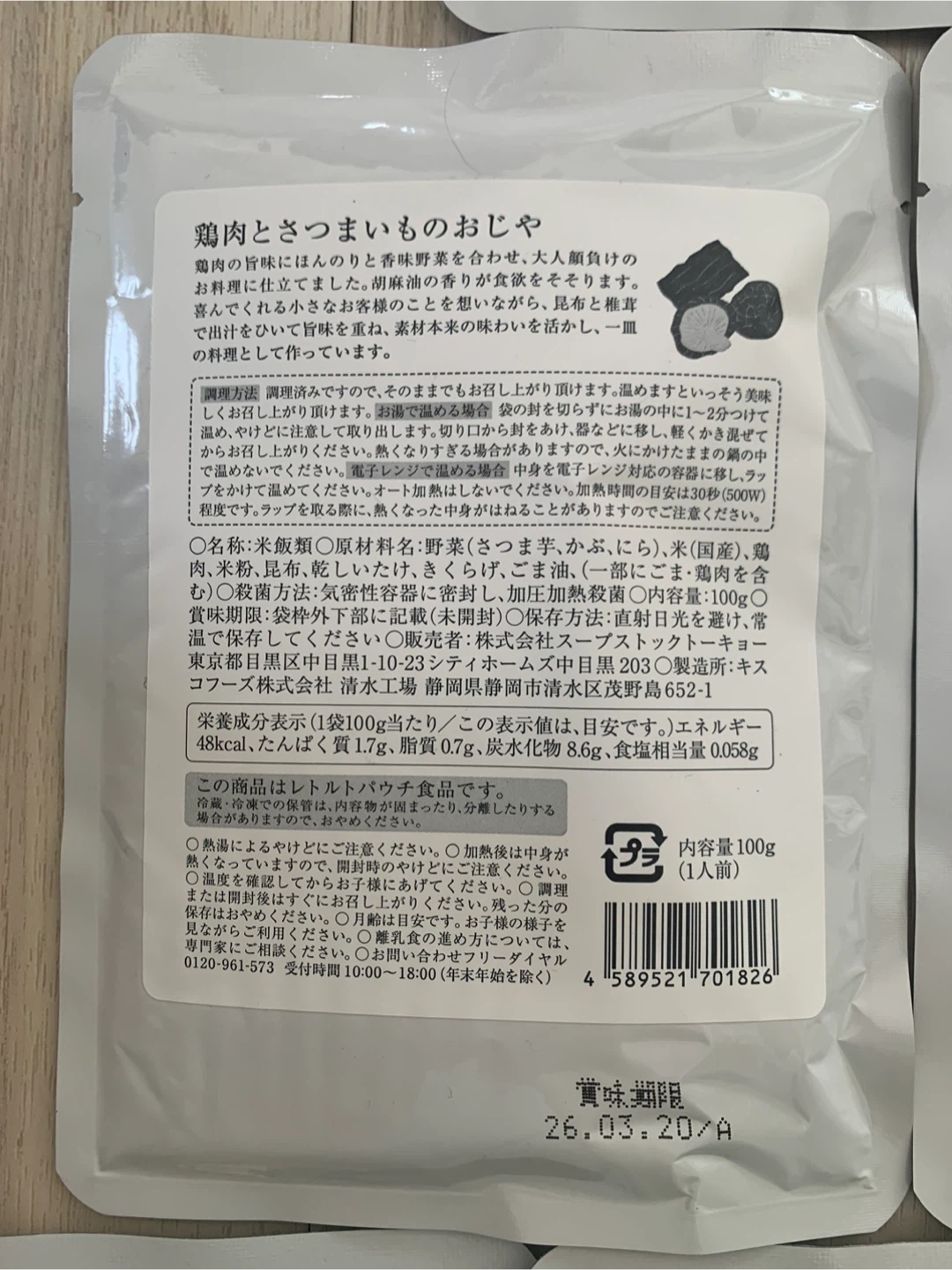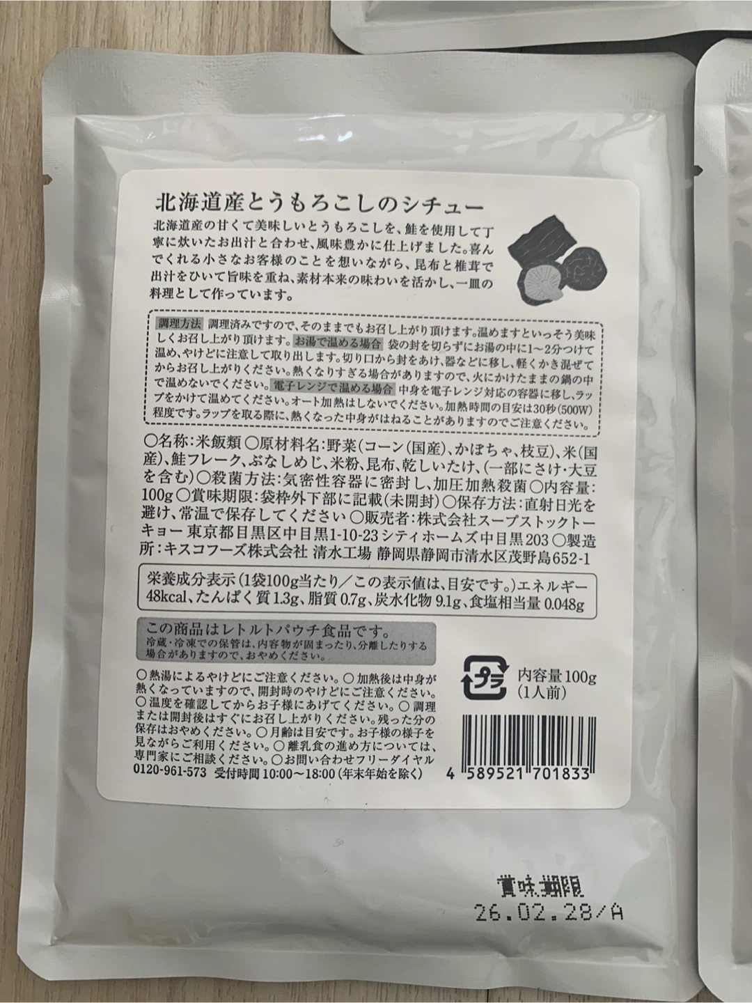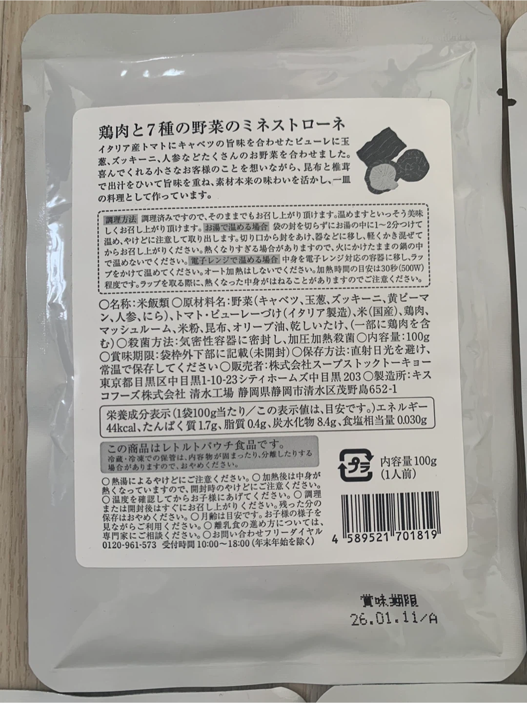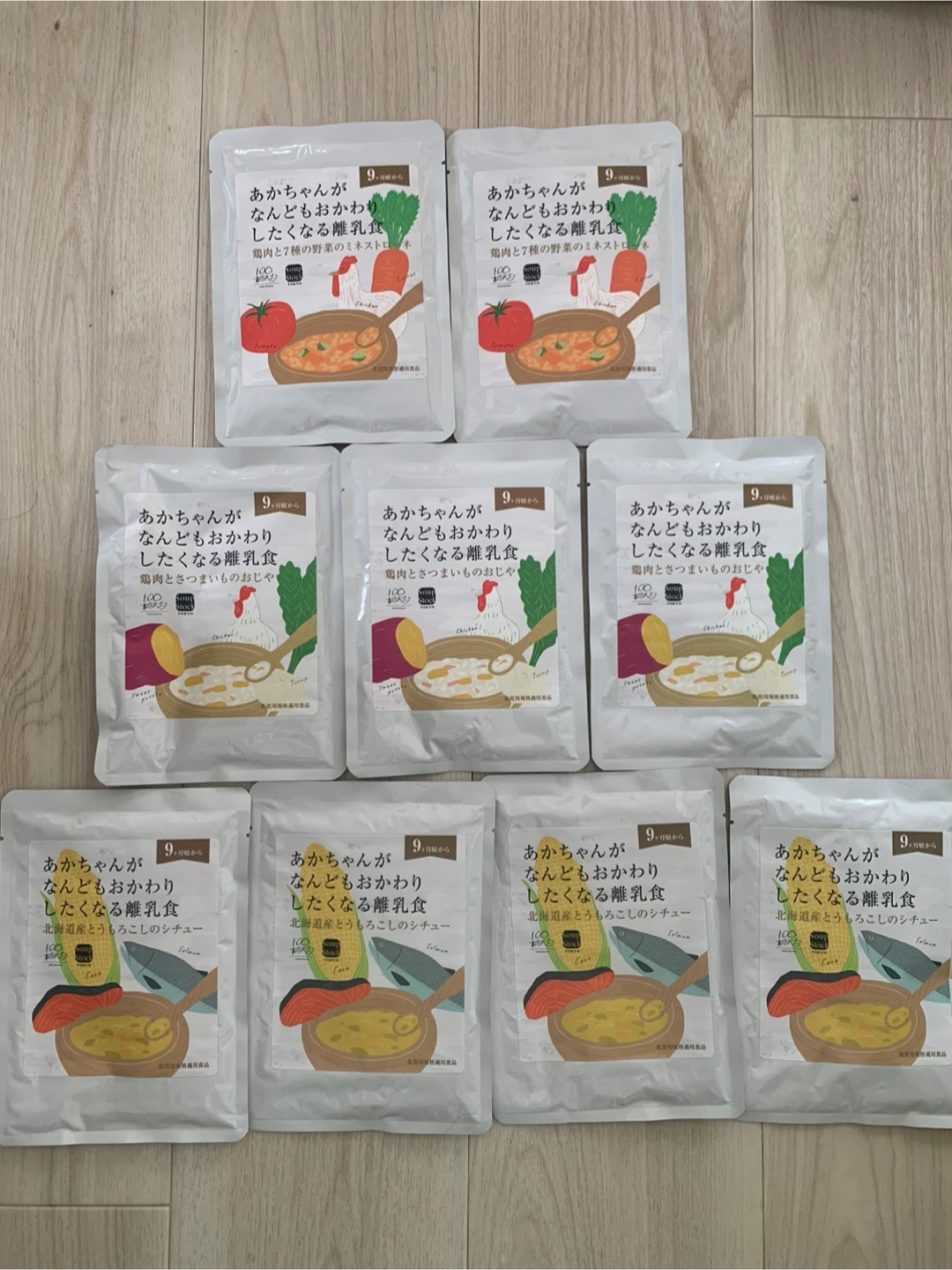 Soup Stock Tokyoの離乳食セットです。 対象月齢: 9ヶ月頃から あかちゃんがなんどもおかわりしたくなる離乳食セット(計9点) ・鶏肉と7種の野菜のミネストローネ ×2 ・鶏肉とさつまいものおじや ×3 ・北海道産とうもろこしのシチュー ×4 賞味期限: 2026年1月〜3月 (詳細は写真をご覧ください) 添加物が入っておらず赤ちゃんに安心して与えられます。うちの子どもも気に入ってよく食べていました。ストック多めに持っていた残りを出品いたします。 自宅保管の旨、ご理解いただけますようお願いいたします。 ▪️オフィシャルサイトより詳細ご覧いただけます https://ec.soup-stock-tokyo.com/pages/babyfood