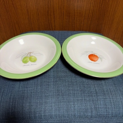 BEAUTY STATE の果実のイラストが施された、緑の縁取りの皿2枚セットです。 カレーやシチュー等スープにピッタリのお皿です。 長年普段は使っていない倉庫(自宅内)の食器棚にあったものです。 あくまでも中古品ですのでご了承いただいた上でご購入ください。少し使用感あります。 お取引成立後はノークレームノーリターンでお願い致します 直接に取引を希望します。 受け渡しですが場所日時によりますがプラスでお値段いただけましたら横浜市近郊、世田谷区、目黒区、渋谷区近郊であればご指定の場所付近にお持ちすることも可能です。黄ばみや欠けなどはありませんが素人保管の為その点ご理解いただける方でお願いします。