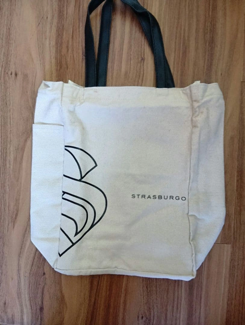STRASBURGOのアイボリートートバッグです。 - ブランド: STRASBURGO - 色: アイボリー - デザイン: グラフィックプリント - ハンドルの色: ブラック - 素材: コットン 内ポケット1 サイドにペットボトルポケット有り 新品未使用ですが…出品にあたりチェックしたところ長期保管によりあまり目立ちませんが薄いシミらしきものがありましたのでお安く出品します。 31×22×11 ご希望の方はお気軽にご連絡ください。
