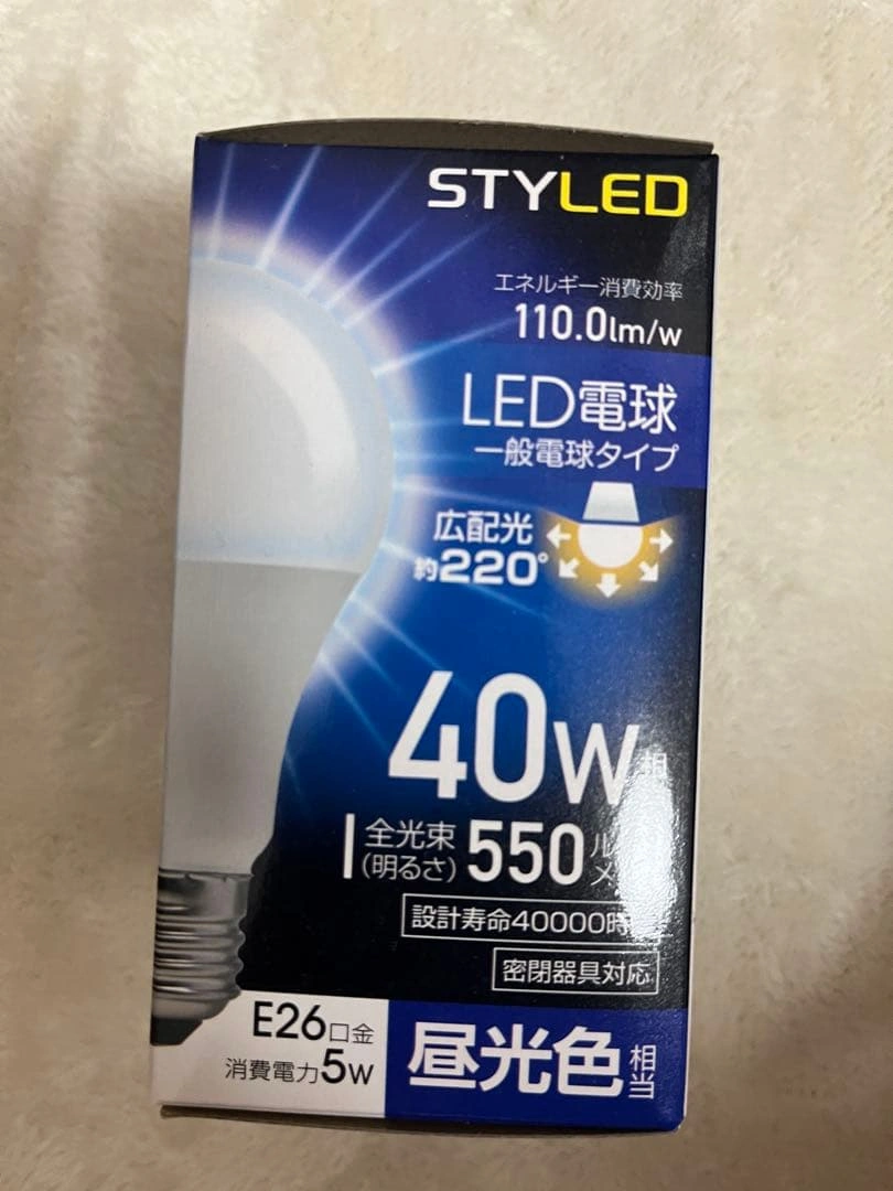 【高効率】 エネルギー消費効率は110.0lm/Wで、消費電力はわずか5Wながら、550ルーメンの明るさを実現。 【長寿命】 設計寿命は40000時間と長く、頻繁な交換が不要です。 【広範囲な配光】 約220度の広い配光角で、部屋全体を均一に照らします。 - ブランド: STYLED - 型番: LED電球 - 消費電力: 5W - 光束: 550ルーメン - 相当ワット数: 40W - 口金: E26 - 色温度: 昼光色 - 寿命: 40000時間 - 配光角: 約220度 ご覧いただきありがとうございます。