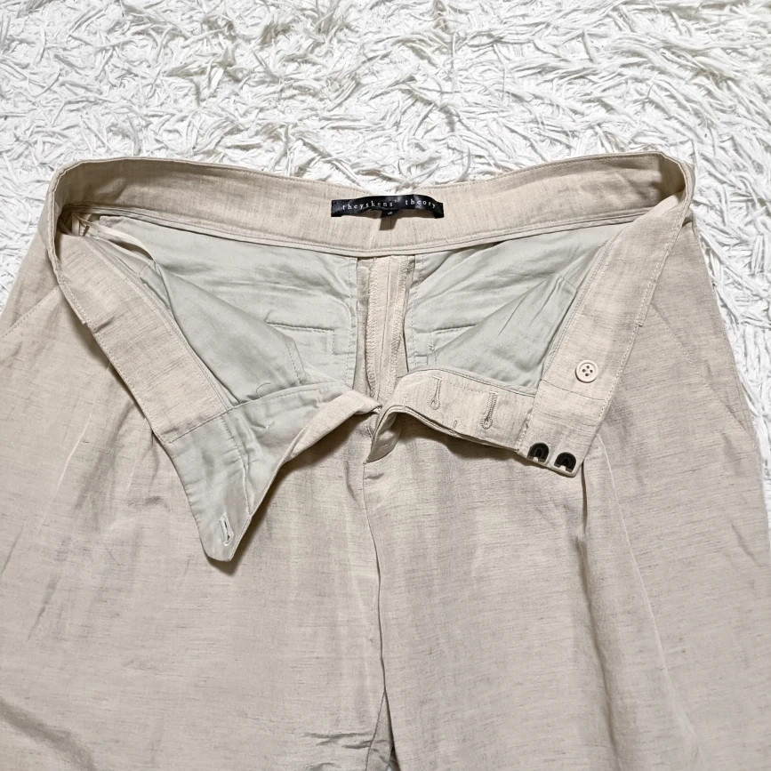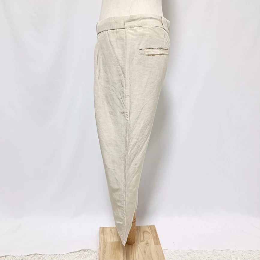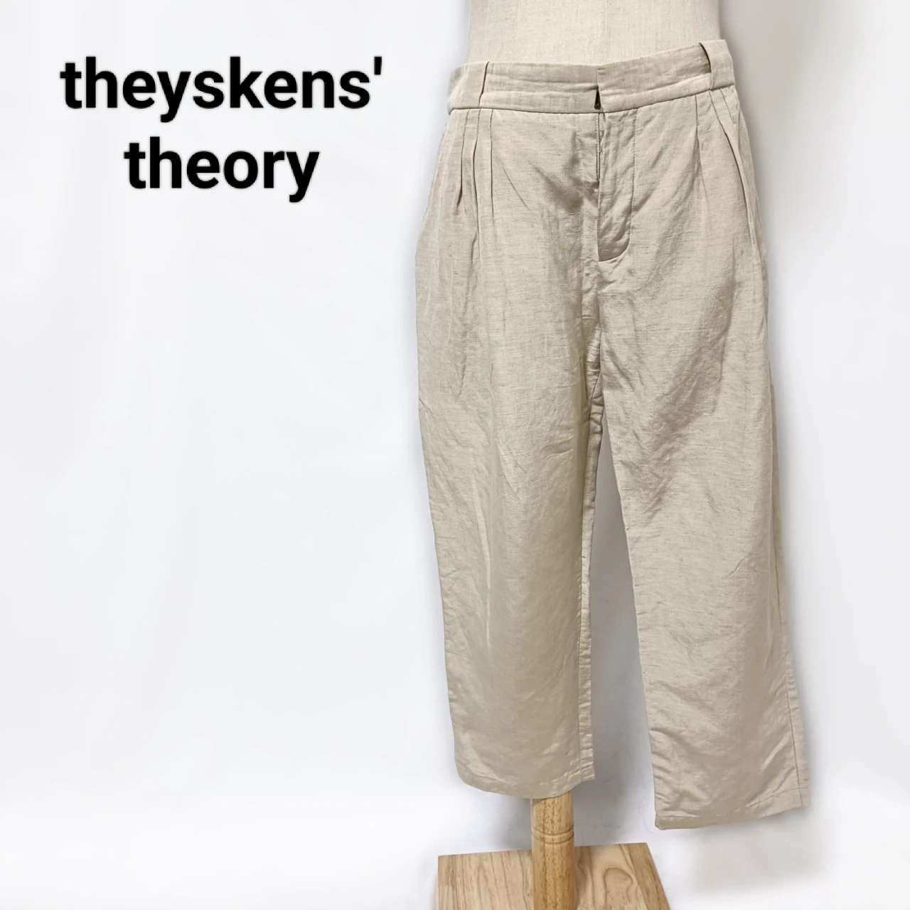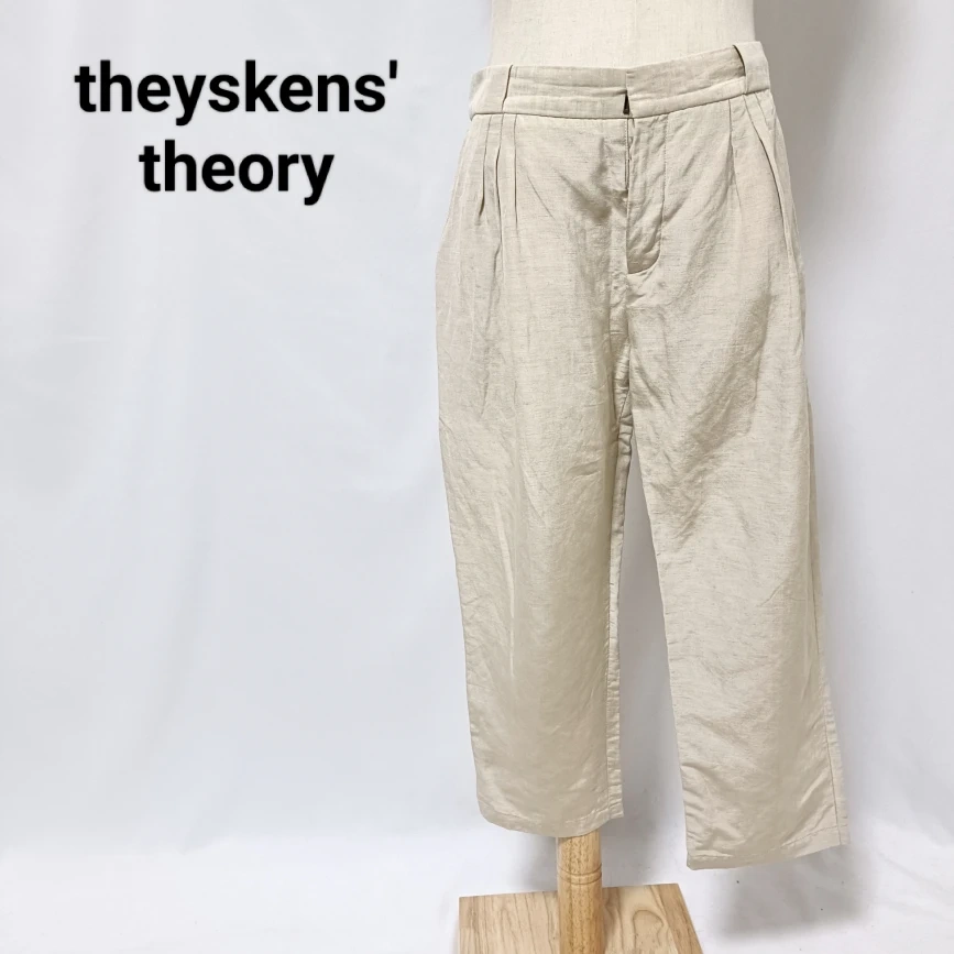 ご覧いただきありがとうございます! theyskens' theory(ティスケンス・セオリー)の上質なクロップドパンツです。 リネンのシャリ感と通気性の良さに加え、シルク特有の上品な控えめな光沢感と滑らかさを兼ね備えており、カジュアルすぎず、オフィスやきれいめなスタイルにも最適です。 □商品名□ theyskens' theory リネンシルク クロップドパンツ ベージュ 2 □ブランド□ theyskens' theory ティスケンスセオリー □表記サイズ□ 2 □実寸サイズ(cm) □ 【平置きサイズ】 ウエスト:40 着丈:77 ヒップ:50 わたり幅:30 股上 :28 股下:4 ※実寸につきまして多少の誤差はご了承ください。 ※表記サイズだけではなく実寸のサイズをご確認ください。 □カラー□ ベージュ □素材□ 麻58% 絹 42% □コンディション□ またぞよろしくお願い致します。 □商品管理番号□ II3-S-557