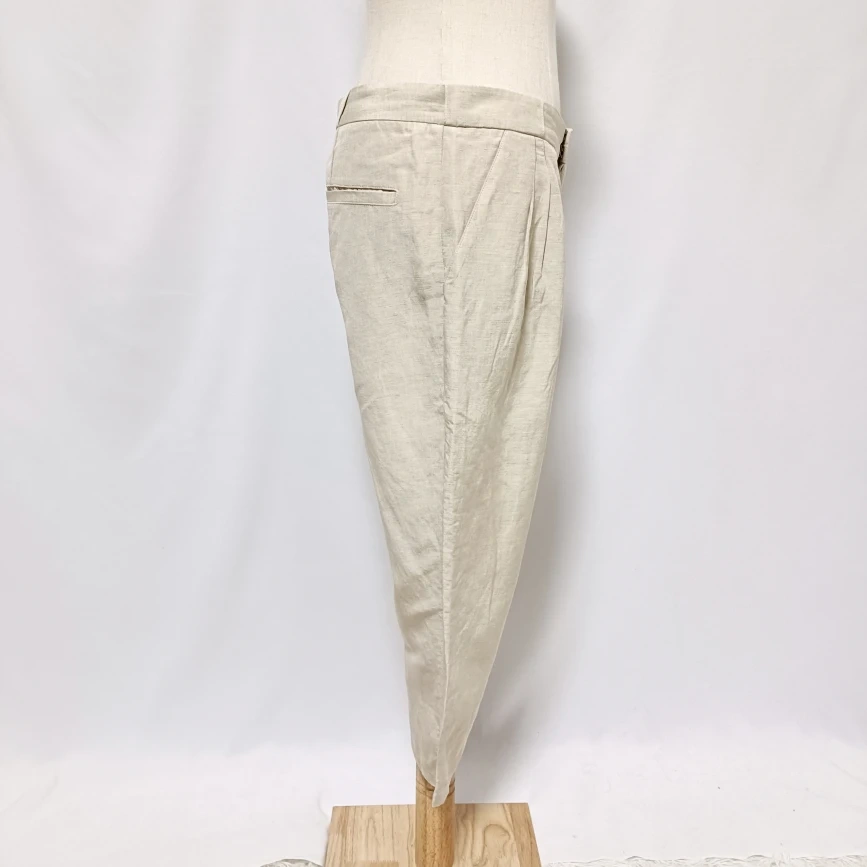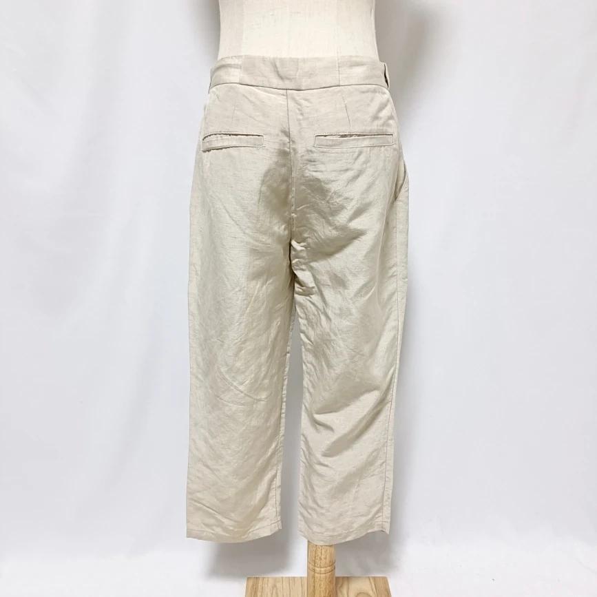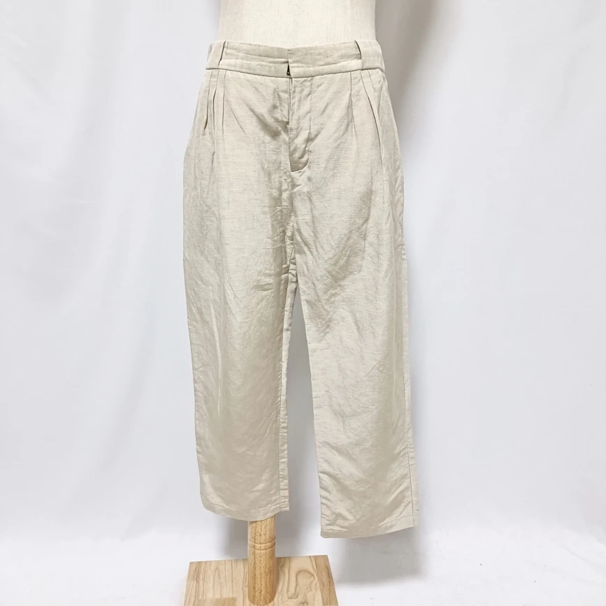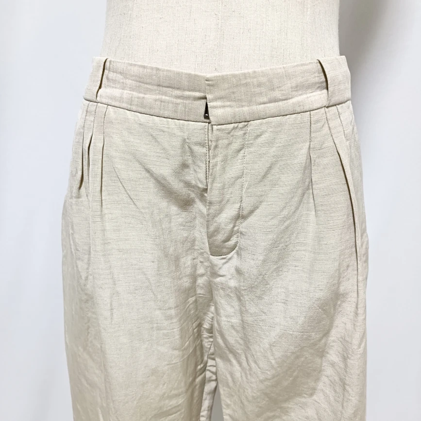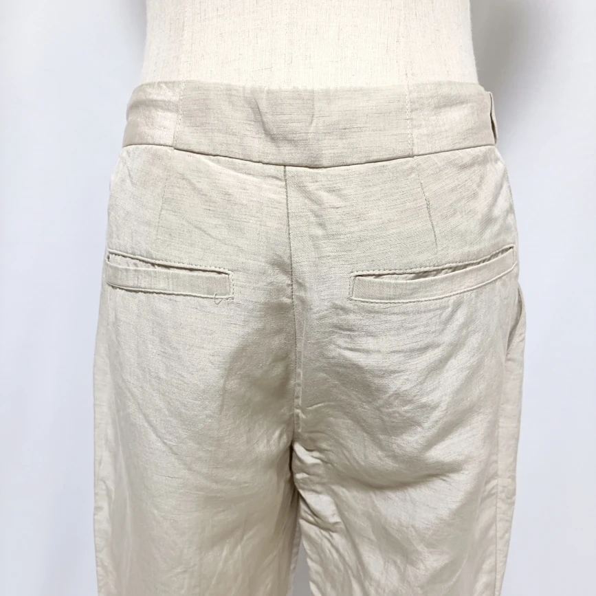 ご覧いただきありがとうございます! theyskens' theory(ティスケンス・セオリー)の上質なクロップドパンツです。 リネンのシャリ感と通気性の良さに加え、シルク特有の上品な控えめな光沢感と滑らかさを兼ね備えており、カジュアルすぎず、オフィスやきれいめなスタイルにも最適です。 □商品名□ theyskens' theory リネンシルク クロップドパンツ ベージュ 2 □ブランド□ theyskens' theory ティスケンスセオリー □表記サイズ□ 2 □実寸サイズ(cm) □ 【平置きサイズ】 ウエスト:40 着丈:77 ヒップ:50 わたり幅:30 股上 :28 股下:4 ※実寸につきまして多少の誤差はご了承ください。 ※表記サイズだけではなく実寸のサイズをご確認ください。 □カラー□ ベージュ □素材□ 麻58% 絹 42% □コンディション□ またぞよろしくお願い致します。 □商品管理番号□ II3-S-557
