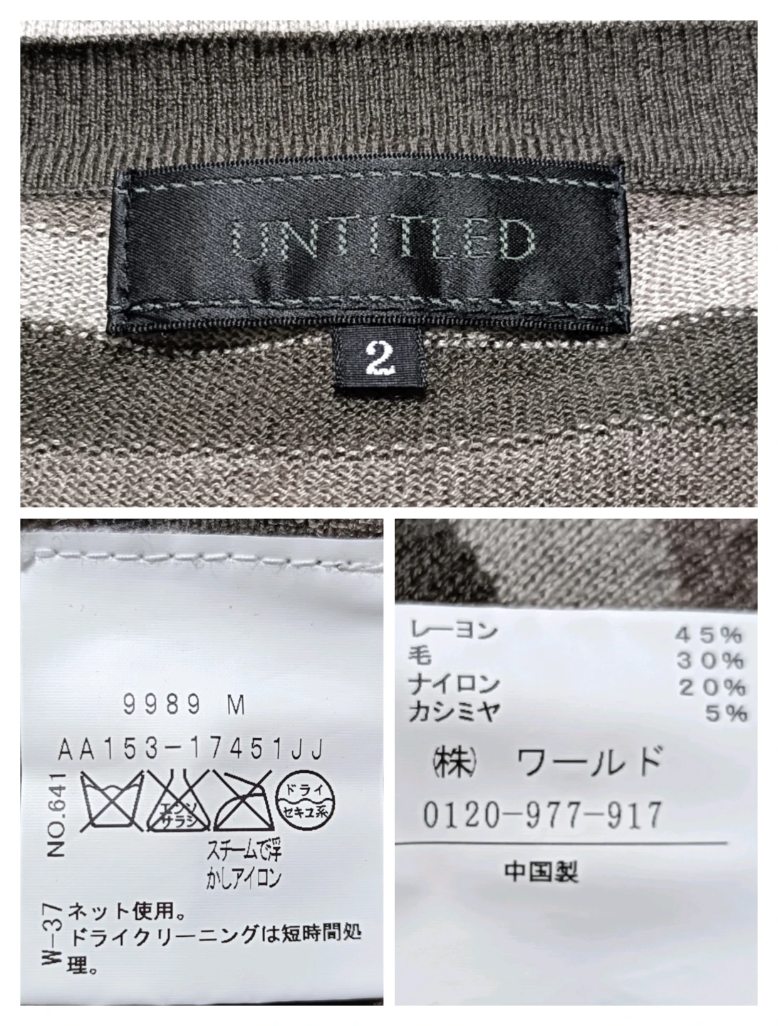 ご覧いただきありがとうございます! ​UNTITLED(アンタイトル)の、カシミヤ混のボーダーニットソー(チュニック丈)です。 ​肌触りが良く、落ち着いたカラーリングのボーダー柄は、これからの季節に大活躍する一枚です。 □商品名□ ​​【UNTITLED】アンタイトル ニット ボーダー チュニック丈 カシミヤ混 2 □ブランド□ UNTITLED アンタイトル □表記サイズ□ 2 (Mサイズ相当) □実寸サイズ(cm) □ 着丈:61 身幅:42 袖丈:63 ※実寸につきまして多少の誤差はご了承ください。 ※表記サイズだけではなく実寸のサイズをご確認ください。 □カラー□ グレー系・ブラウン系のマルチボーダー柄 □素材□ ​レーヨン45% 毛30% ナイロン20% カシミヤ5% □コンディション□ 目立った汚れやダメージなど特にございません。 ※汚れはできる限り写真にて掲載しております。まずは画像をご確認ください。 どうぞよろしくお願い致します。 □商品管理番号□ CC1-R-5605
