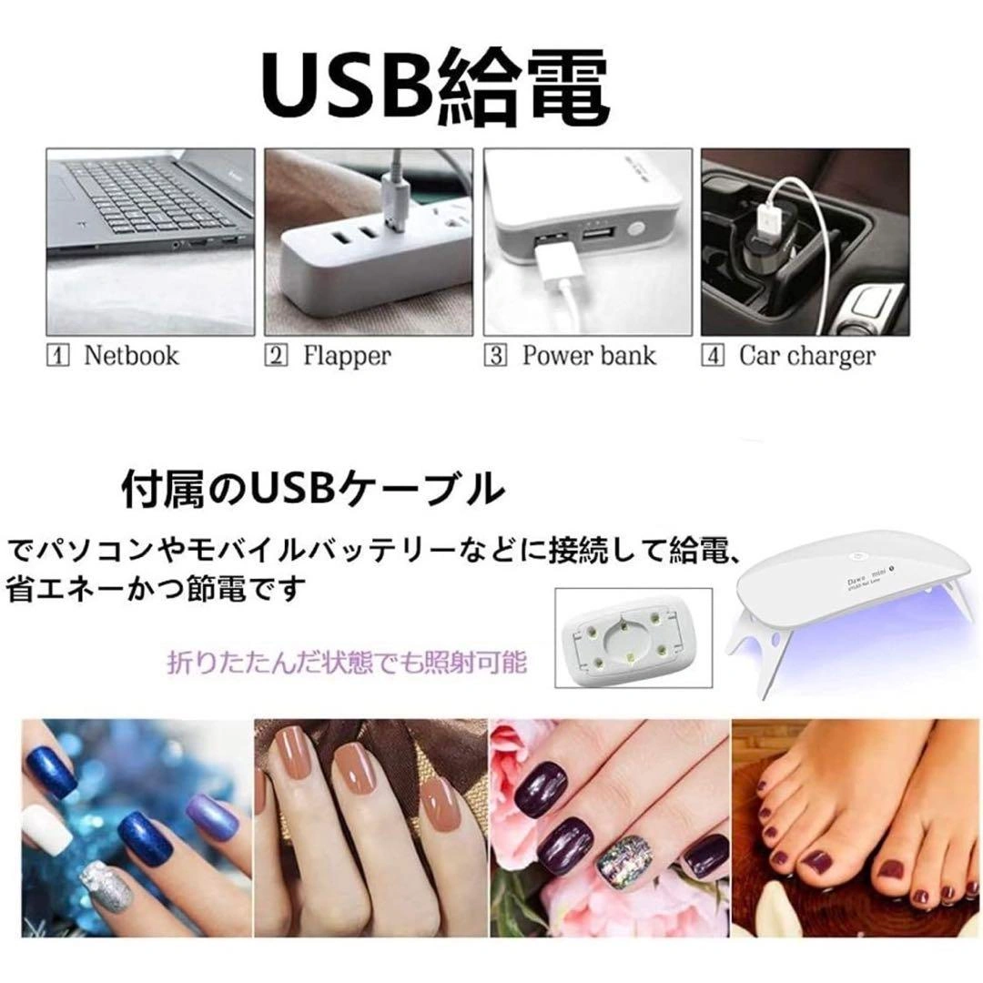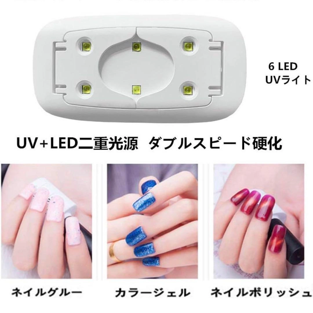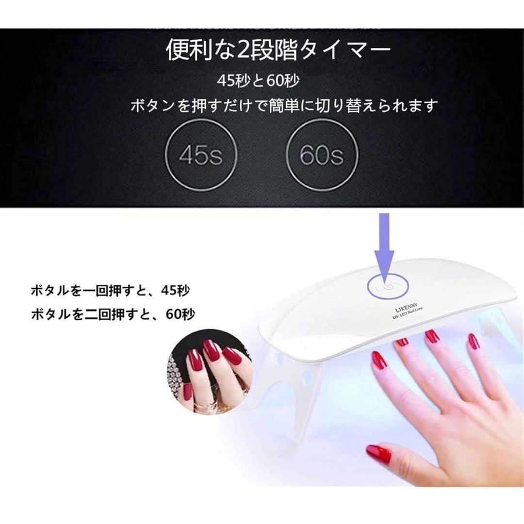 ジェルネイル用のUV+LEDランプです。軽くてコンパクトなので持ち運びにも便利です。 本体は美品ですが、USBケーブルに傷汚れがございます。 【主な材質】:ABS 樹脂 適用種類:UVレジン、UV硬化樹脂、UV接着剤、ジェルネイル用ジェルが硬化します。 【パッケージ】本体*1、USBケーブル*1、日本語取扱説明書*1。 【UV+LED二重光源】6w最速ダブル光源技 術を採用し、ダブルスピード硬化・ダブルパワー機能で硬化速度が2倍を速くなります。痛みを軽減し、色素を薄め、手が黒くなる心配もなく、手と目に優しいです。 【2段階タイマー】照射時間が45秒・60秒の2段階があり、ボタンを押すだけで簡単に切り替えられます。ボタンを一回押すと、45秒の照射時間が設定、ボタンを二回押すと、60秒の照射時間が設定できます。 【usb給電】付属のUSBケーブルでパソコンやモバイルバッテリーなどに接続して給電可能です。 【携帯便利】全体に小さくて、折りたたみ収納できて場所を取らないです。コンパクトな携帯型なので、ご家庭でサロンをお楽しみいただけます。 ご希望の方はお気軽にご連絡ください。