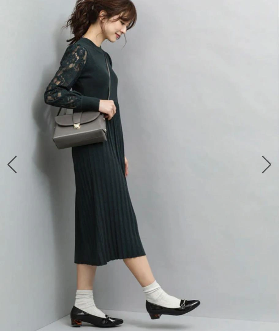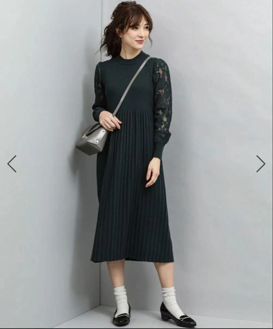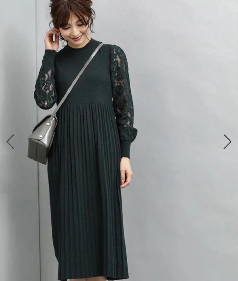 VIS 袖レースプリーツニットワンピース ヴィス モスグリーン