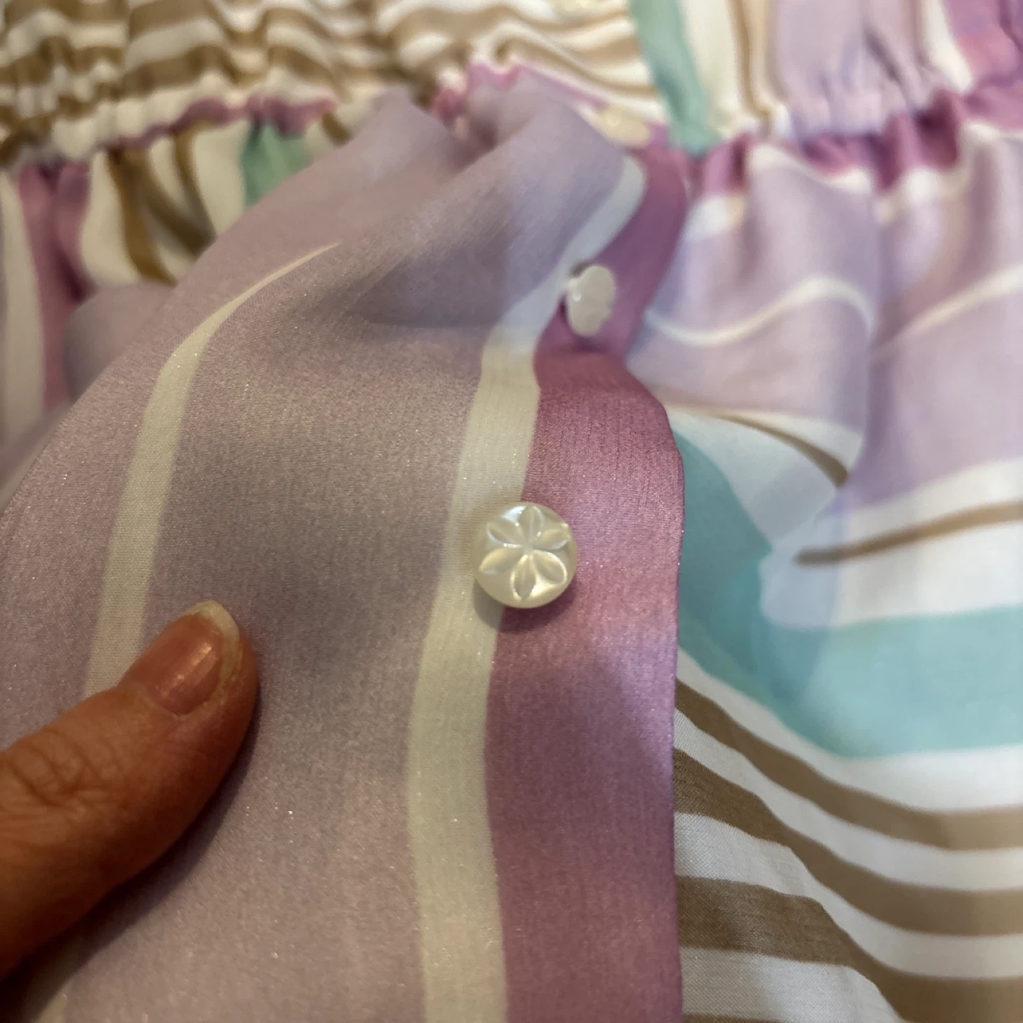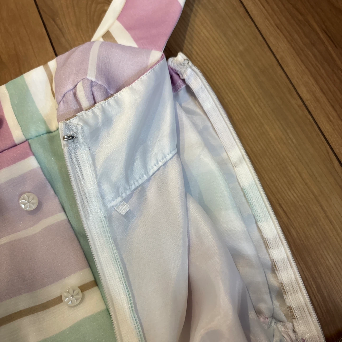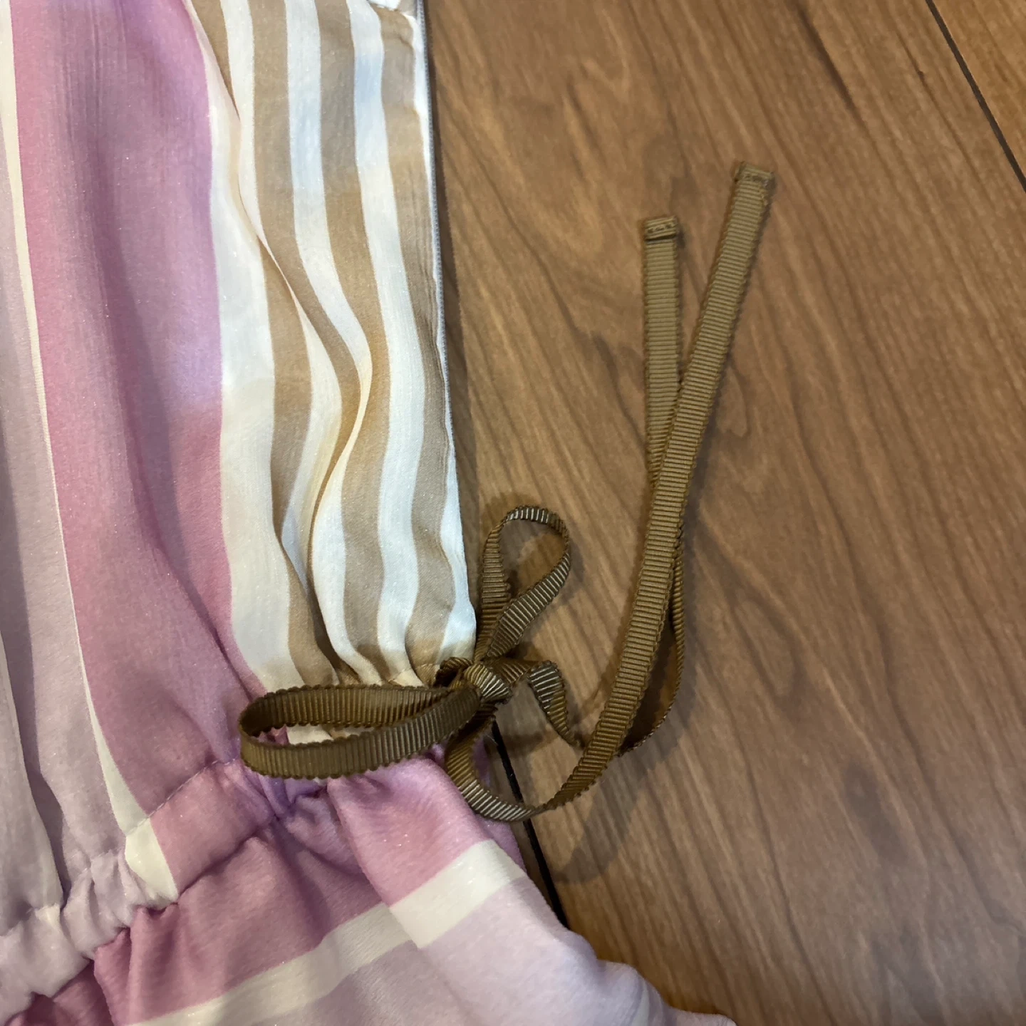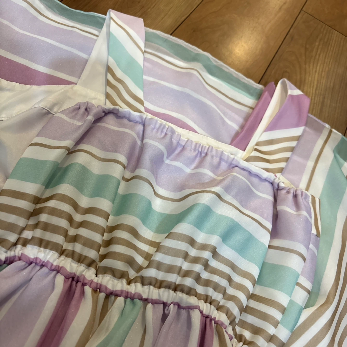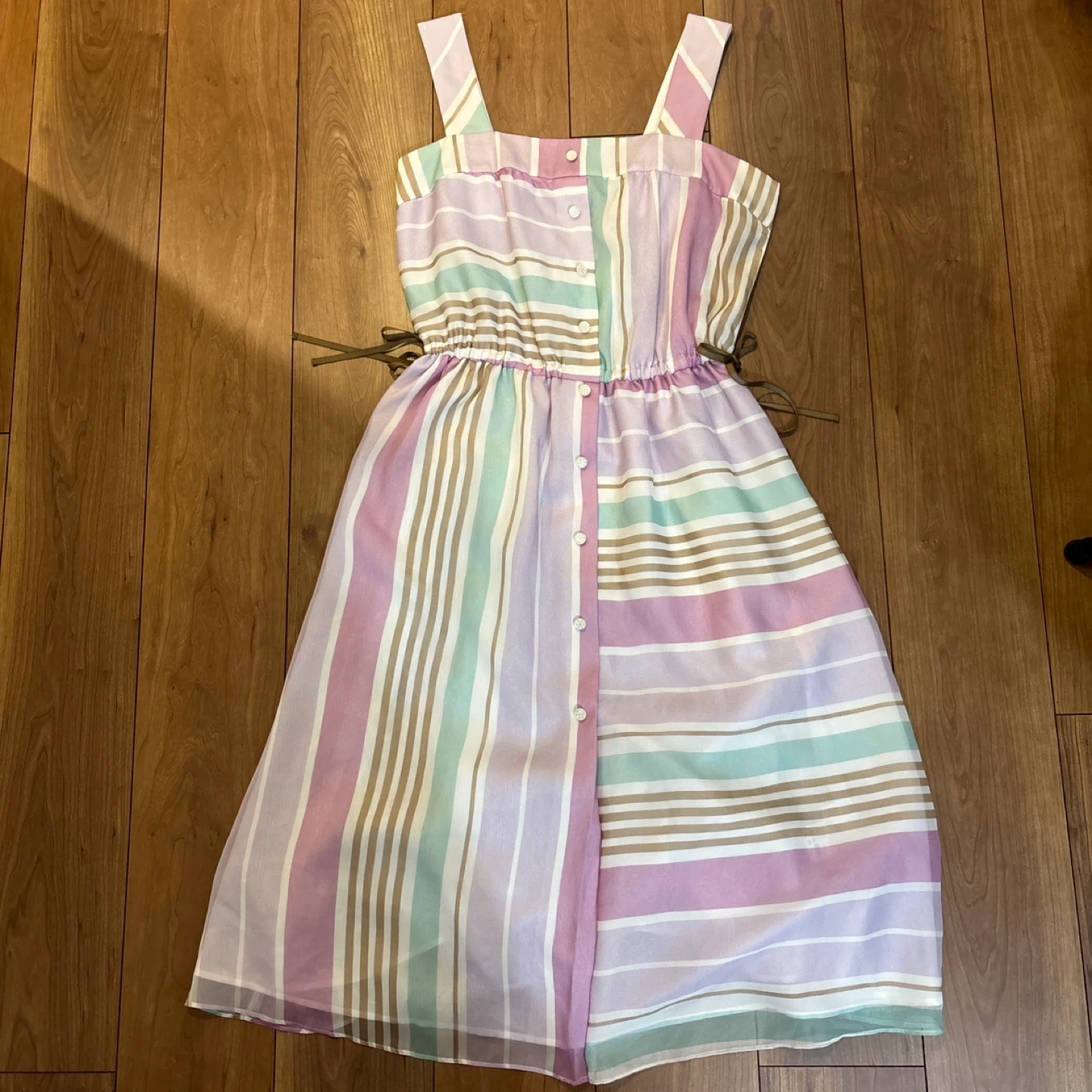 ストライプ柄のワンピースです。 ・色:ピンク、白、ミントグリーン、ベージュなどのストライプ ・デザイン:ボタンダウン、ウエストに紐付き ・状態:使用感少なめ ご不明点があればお気軽にご連絡ください。 とっても可愛い柄でお気に入りでしたが1回も着ずに何年か経ってしまったので出品いたします。