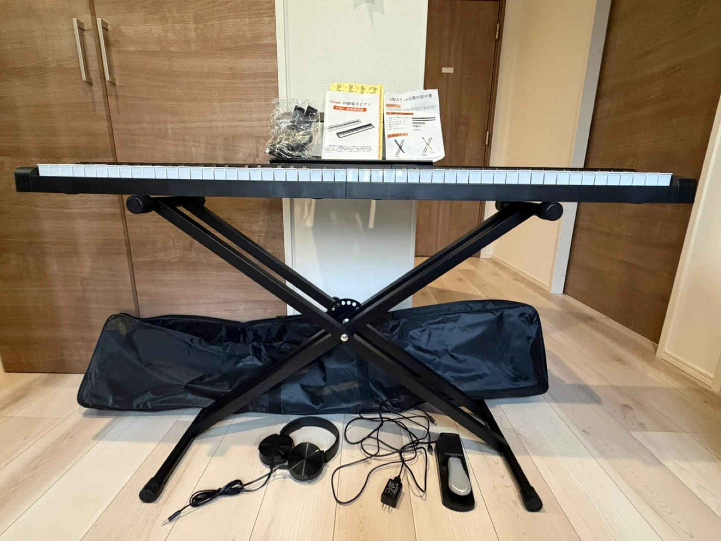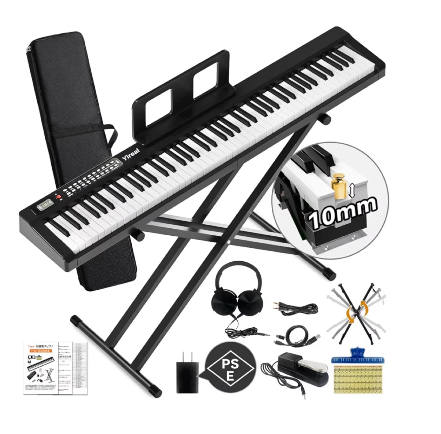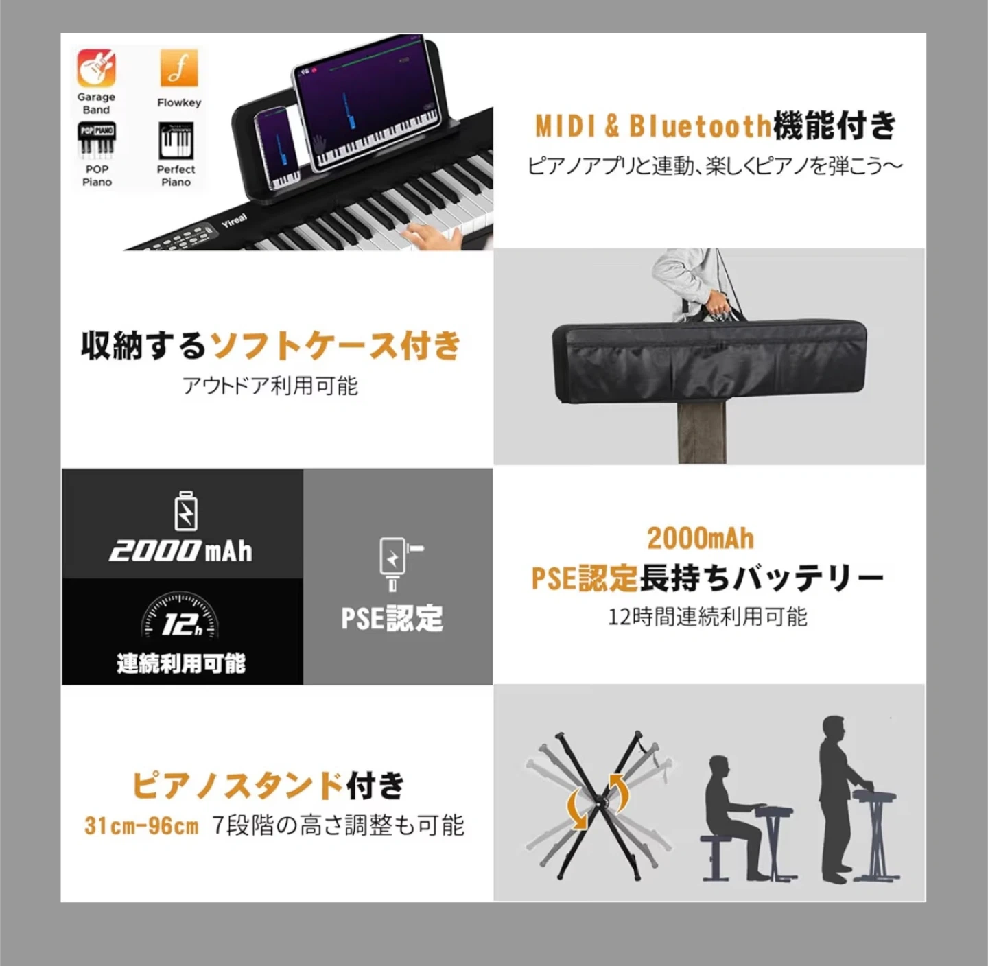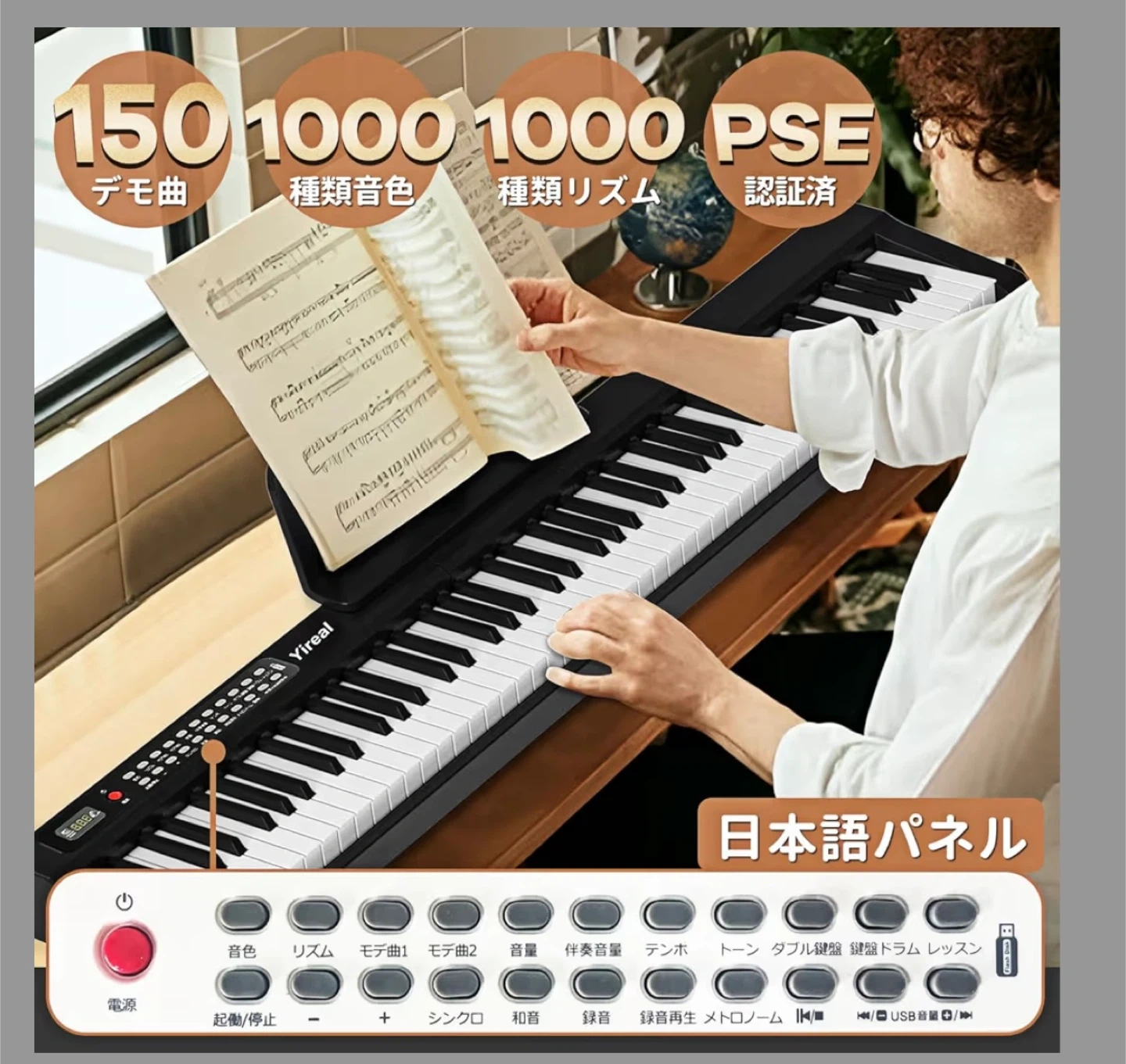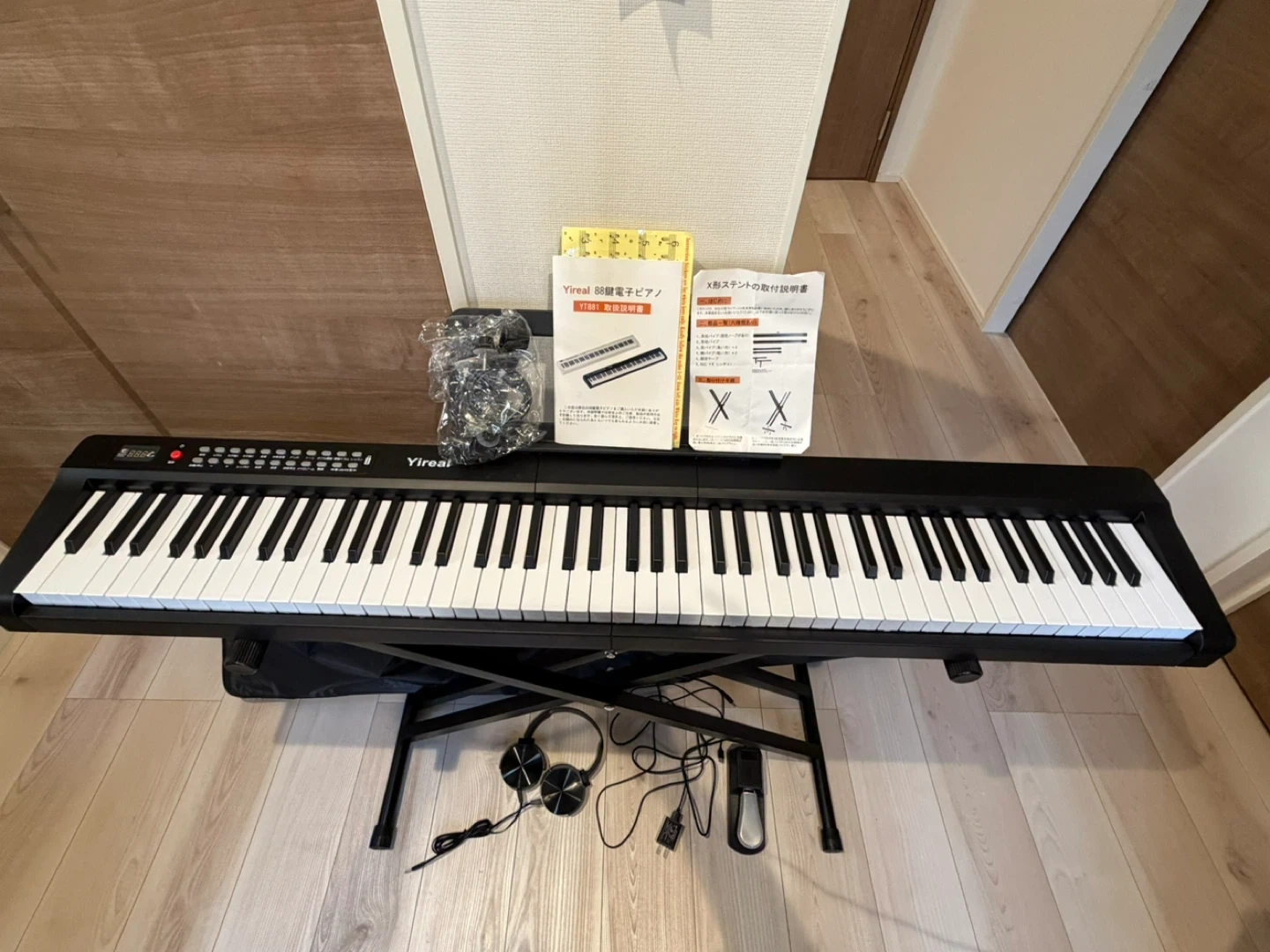 Yirealの電子ピアノです 【情報】 ブランド:Yireal 型番:YT881 種類:電子ピアノ 【付属品】 スタンド、ヘッドホン、ペダル、ソフトケース、説明書、電源アダプター 中古品であることご了承ください 使用しましたが、触った程度です。 タッチが合わなくて弾きこなせなかったので手放すことにしました。 音色がたくさんあります。 ヘッドホンは未使用です。 もし不明な点があれば、なんでも聞いてください!