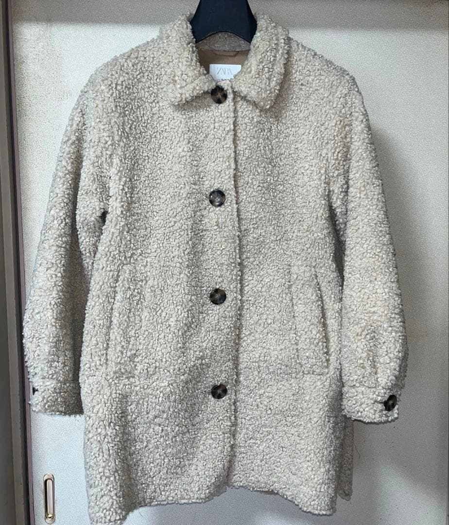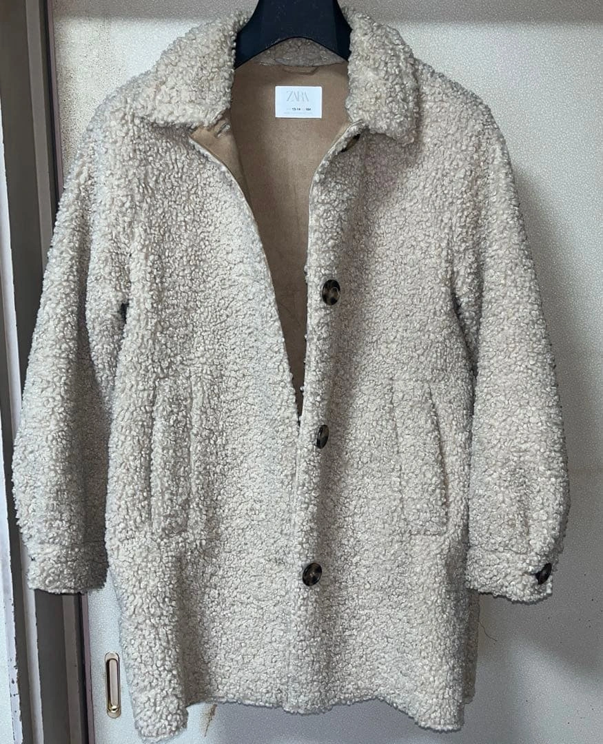 ボア素材のクリーム色コートです。13-14歳向け、ボタンとポケットが付いています。 ブランド: ZARA サイズ: 13-14歳 (164cm) 色: クリーム色 素材: ボア素材 デザイン: ボタン付き、ポケットあり ご覧いただきありがとうございます。 5回ほど着用、短時間の外出で使用しました。 使用後はクローゼットで保管してます。 とてもかわいいデザインで暖かくデザインも飽きません。 長く着用できます。 着丈は後ろ襟中央から寸法して81センチです。 多少の誤差はご了承ください。 画像7.8枚目がインナーの状態です。 ピーチスキンタイプで肌触りもいいです!