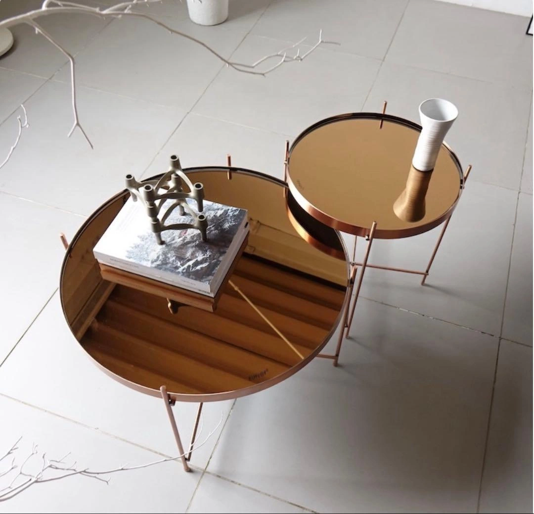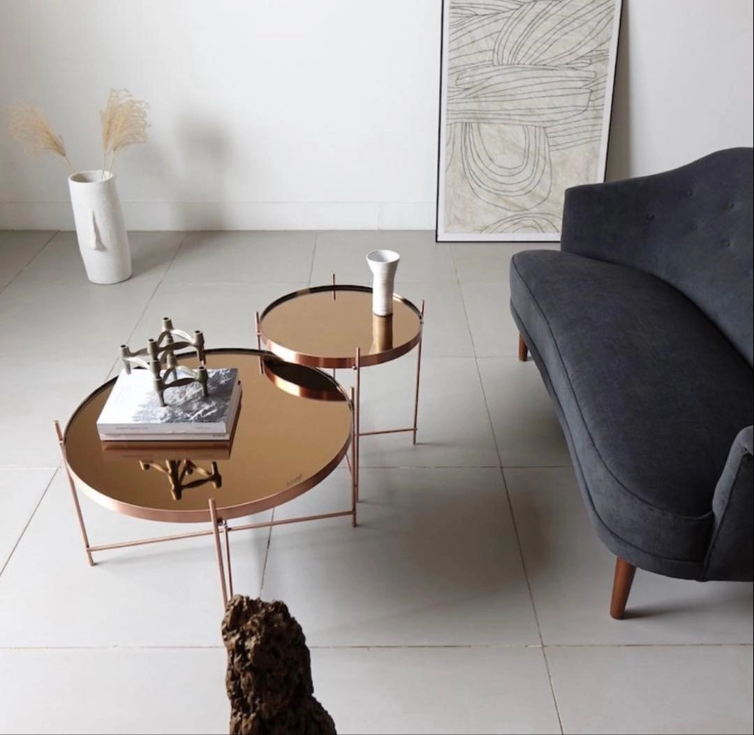 オランダ発、人気のインテリアブランドZuiver / ザイファーのコーヒーテーブル大小セットです。 小傷・使用感等ありますが(画像参照ください)、使用に差し支える大きなダメージ等なく、まだまだご使用いただけるコンディションかと思います。 メーカー : Zuiver / ザイファー サイズ : Large/ 62.5 x 40 Small/43 x 45cm カラー:コッパー 重量 : Large / 7.2kg Small 3.8kG 価格 : 73,400(税込) Zuiverのベストセラーであるキューピッドシリーズの銅メッキ加工サイドテーブルです。 華奢でモダンな折りたたみフレームに取り外しが簡単なコッパー 銅鏡強化ガラスの天板。 銅鏡強化ガラスは乗せたものや周りの空間が天板に映り込み、植物やオブジェを乗せると素敵なコントラストを映し出してくれます。 ・取り外し可能な銅鏡強化ガラス ・折り畳み式の鉄製(銅メッキ)フレーム(厚み10 mm) ご希望の方はお気軽にご連絡ください。
