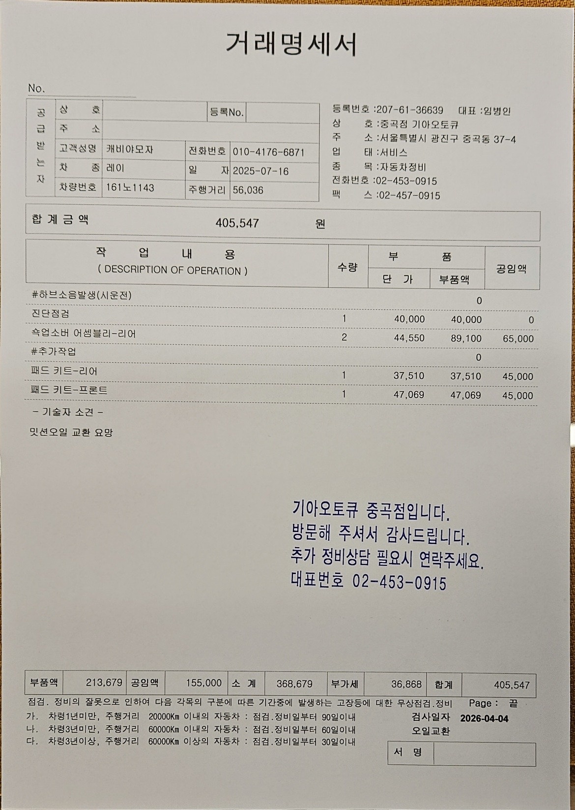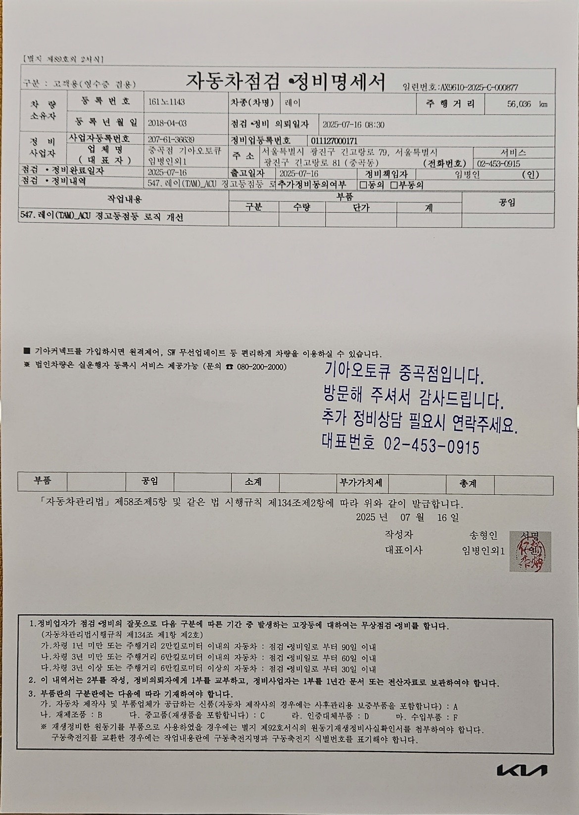 아빠의 부탁으로 글올립니다. 2018년4월 레이밴 고급형 무사고차입니다. 회사에서 판매하기로 결정하고 어제(7월16일) 중곡동 기아오토큐서비스에 점검하고 조수석 뒷소음이 있어서 뒷쇼바 양쪽을 교체했읍니다.(운전석은 괜잖았지만 밸런스때문) 브레이크패드도 앞,뒤 교환하였고 리콜부분도 함께했읍니다. 당장 정비해야할부분은 없읍니다. 정비내역 사진첨부요. 새로운 차주님께서 기분좋게 잘타시라고 내일 실내세탁,외관광택 작업예약해두었고 차는 아차산역 3번출구 약 200미터 집에있으니 미리 시간약속하면 보실수있읍니다. 궁금하신점은 0️⃣1️⃣0️⃣ 4️⃣1️⃣7️⃣6️⃣ 6️⃣8️⃣7️⃣1️⃣ 언제든 통화가능하지만 차금액은 조정이 안되니 참고하시고 가격이 부담스러우시면 전화안주시면 좋겠읍니다. 그만큼 차가 좋다는이야기고 60만원이상의 차정비와 실내세탁 외관광택을 제공하기때문입니다. 좋은분이 주인되시길 기다려봅니다.