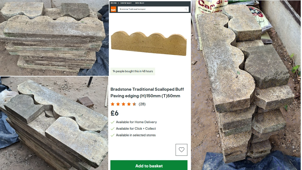 0 reviewsScalloped Paving Edge Edging Stone Border for Garden / Patio / Path / Lawn / Allotment Size: (H)150mm (T)50mm Price as above for all 23x full + free 2x offcuts. Good Condition - just needs a good clean. Collection Only.