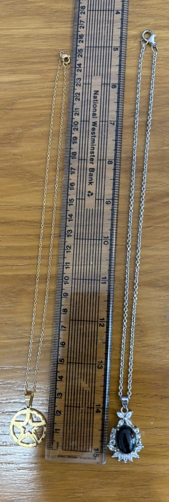 0 reviews2 x necklace and pendants .one gold plated and otherone is silver colour. They just used few times . They are like a new .£5 for both.