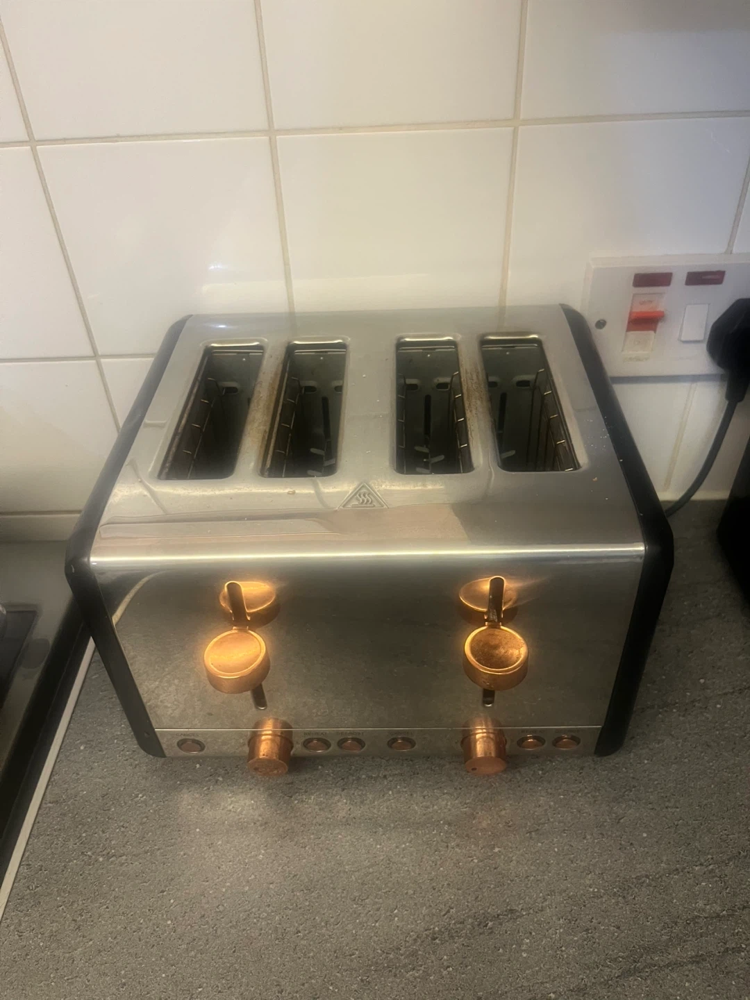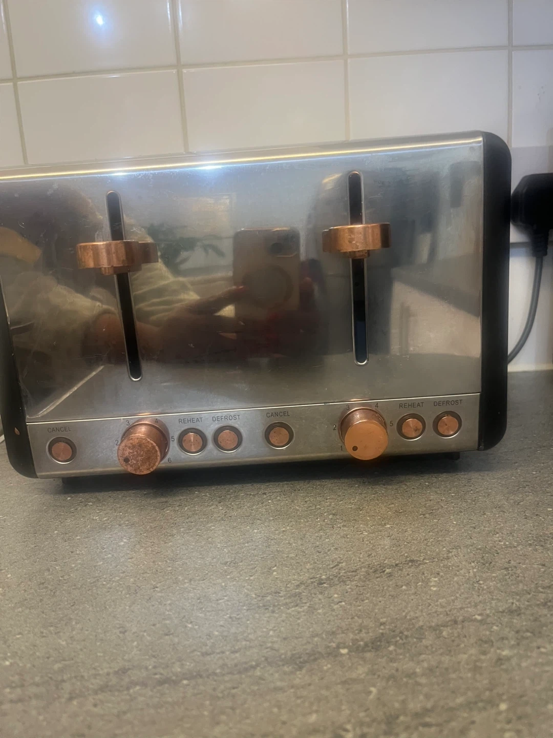 3 reviews4-slice toaster. It has a stainless steel finish with copper accents.