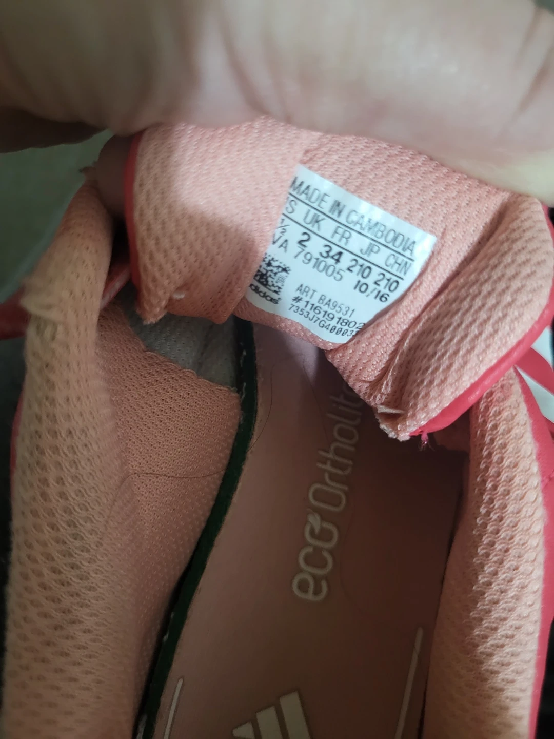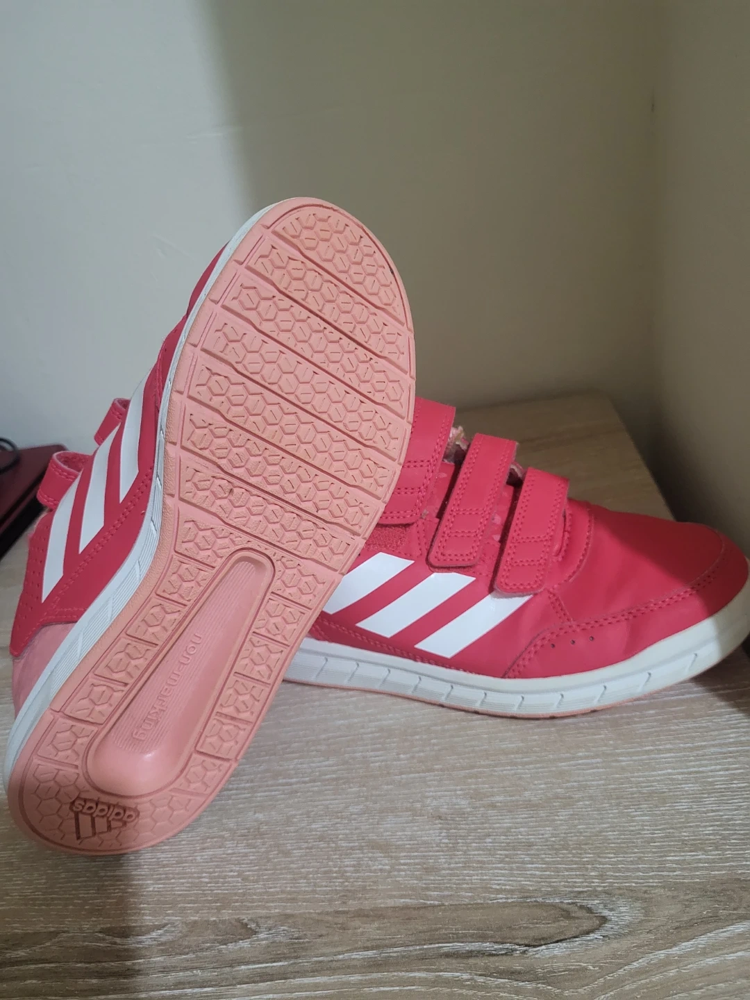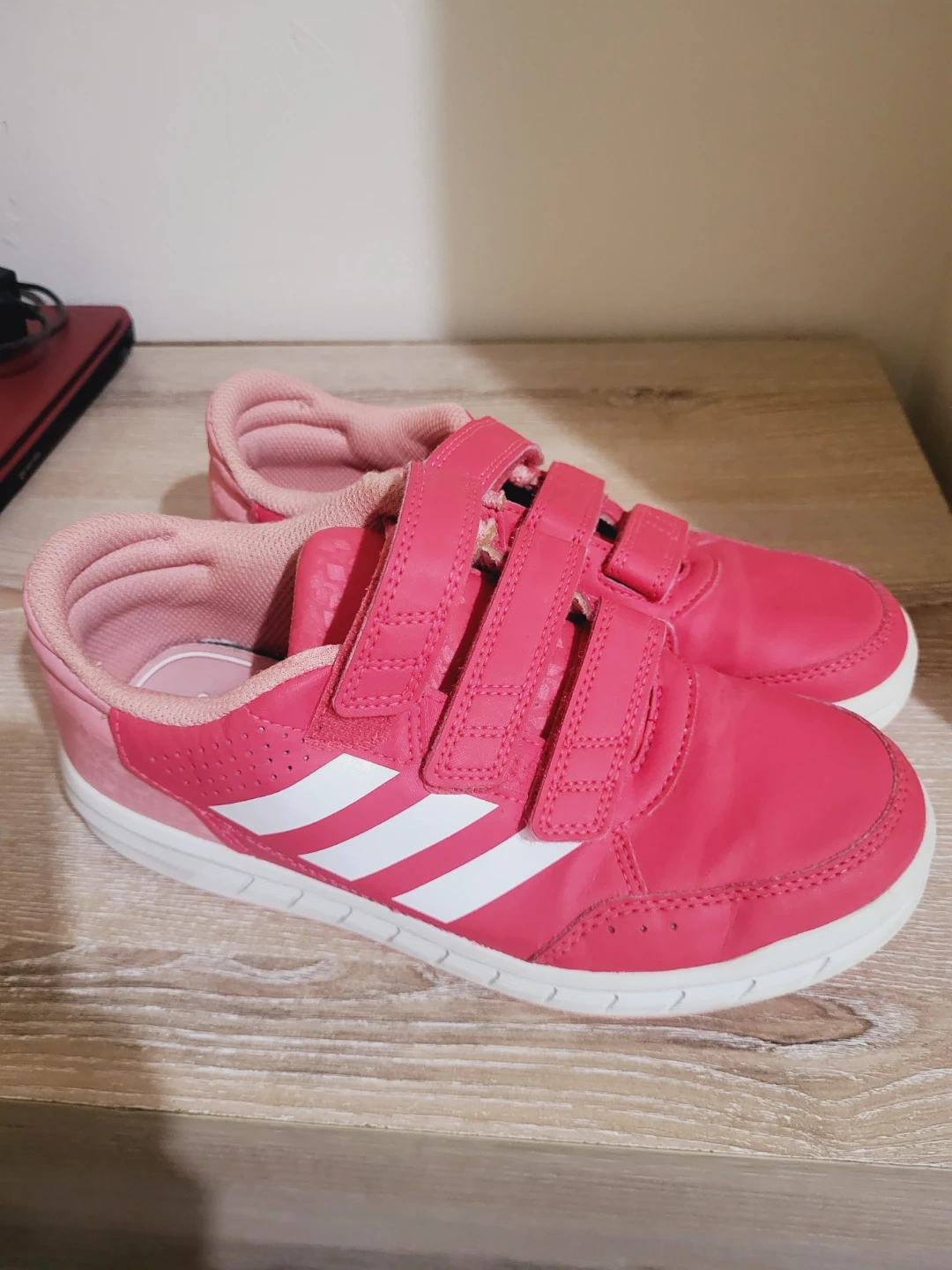 0 reviewsHere are some Adidas pink trainers in a size UK 2. They have white stripes on the side and a velcro fastening. They are in good condition and ready for a new home. Collection only please.