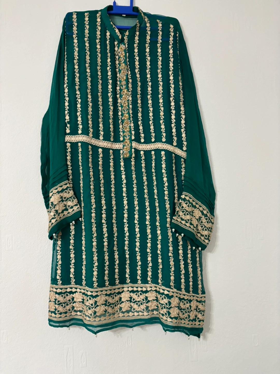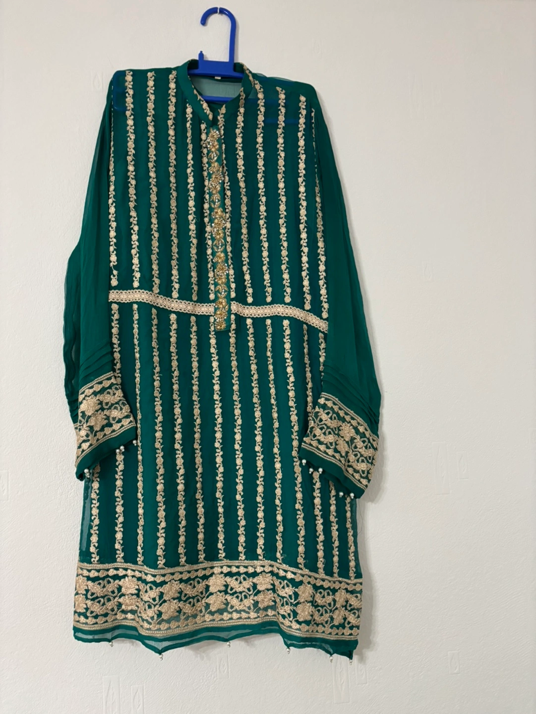 1 reviewBeautiful teal Kurtha Size medium. Features gold embroidery and embellishments. Long sleeves. Elegant and stylish.
