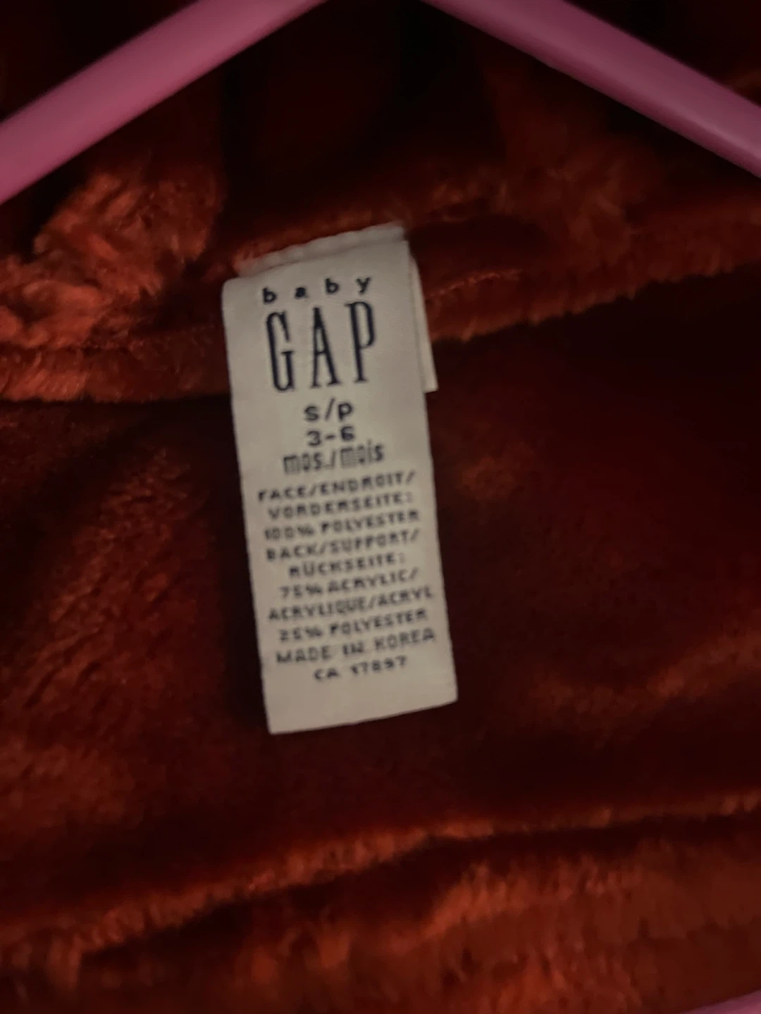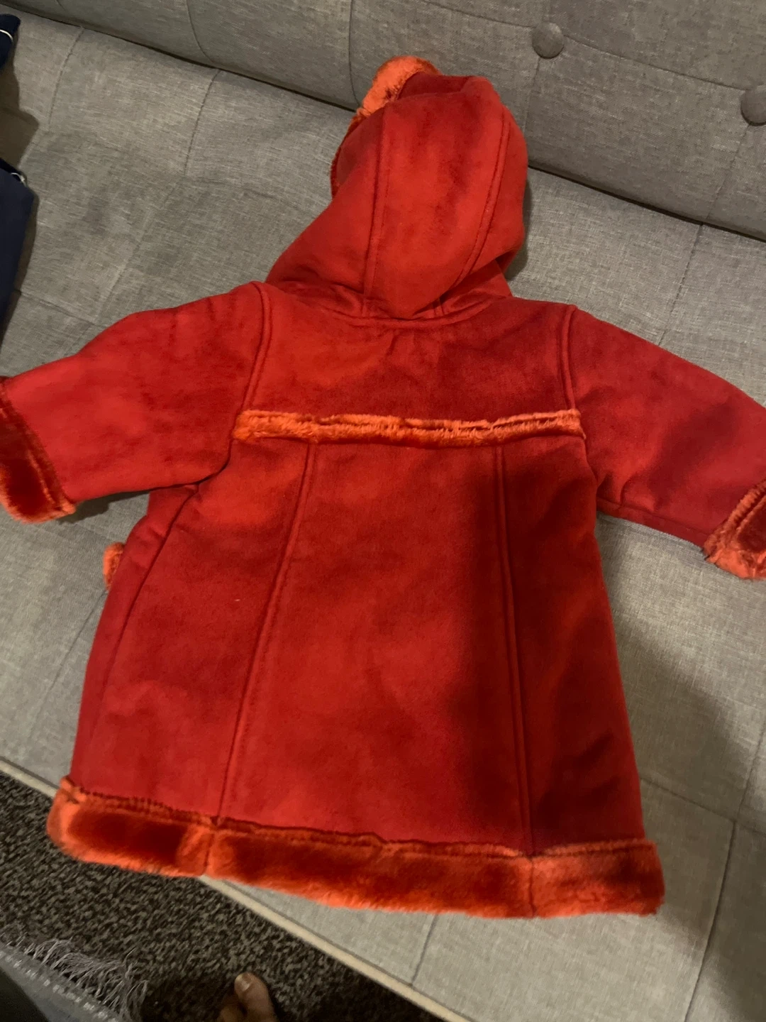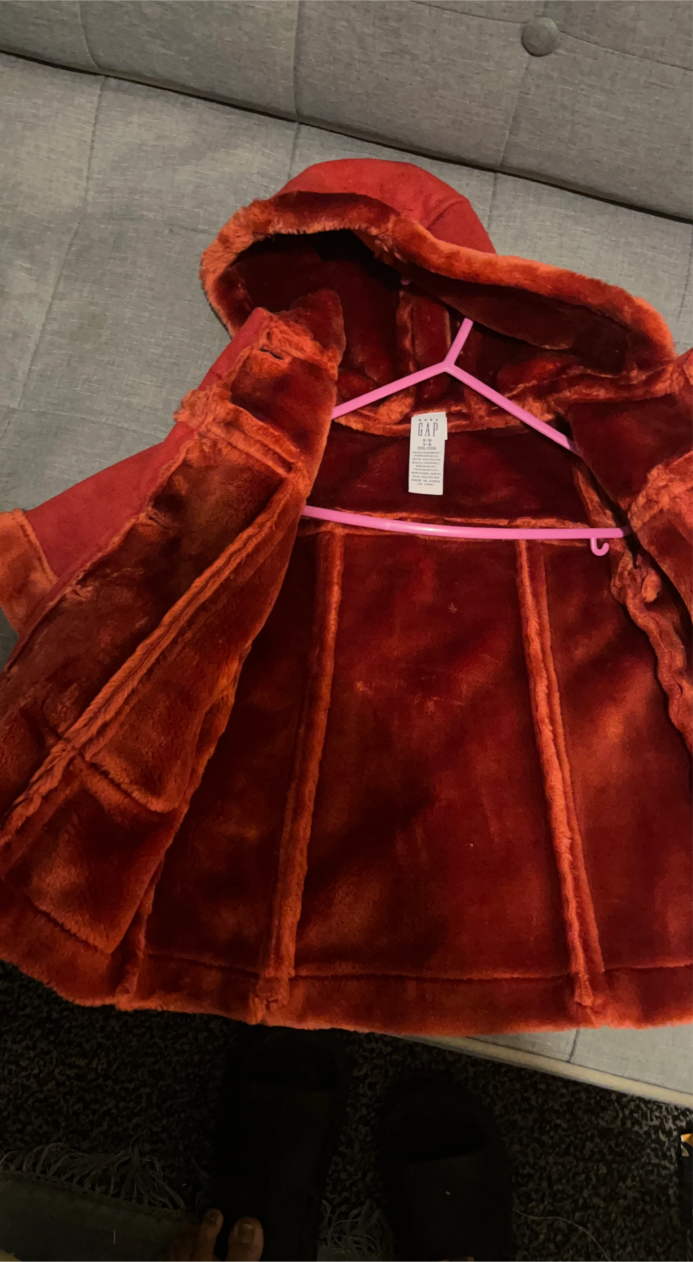 2 reviewsHere's a lovely red hooded coat from Baby Gap. It's a size 3-6 months and features a soft faux fur lining. The outer material is made from polyester and acrylic.