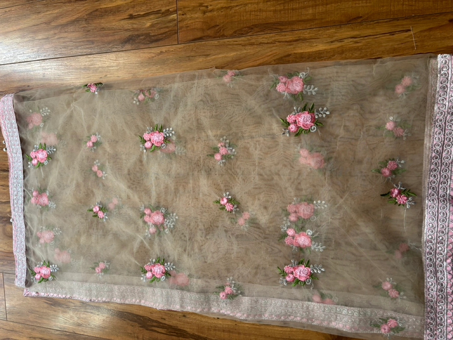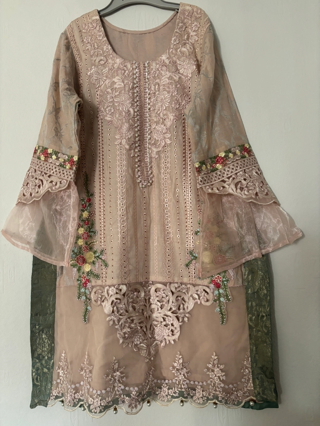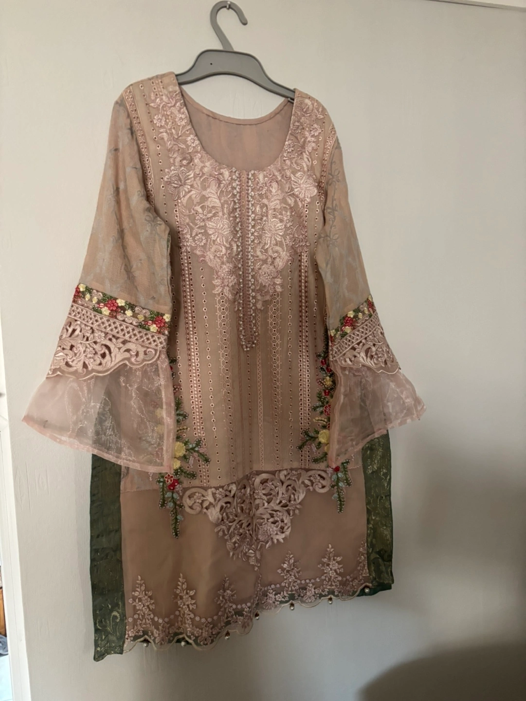 1 reviewStunning two piece suit. Features a delicate embroidered kameez with bell sleeves and intricate detailing. Matching embroidered dupatta. Green and pink accents. Gorgeous outfit for special occasions.