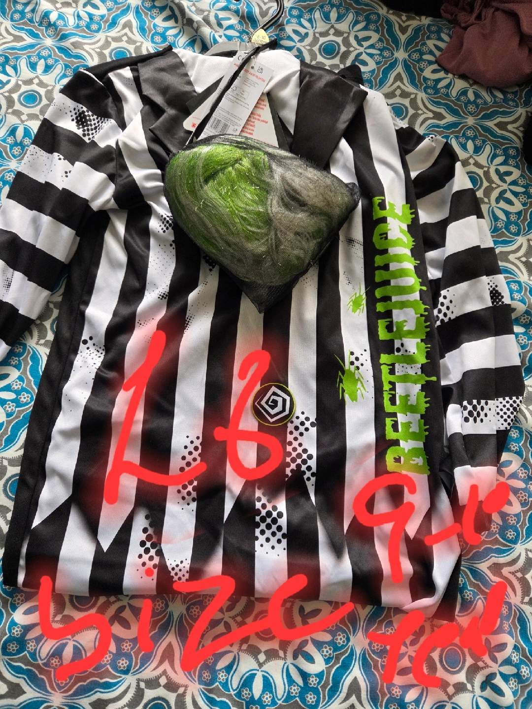 Beetlejuice costume with wig included. The costume is black and white striped with green 'Beetlejuice' writing down the side. Size ZC