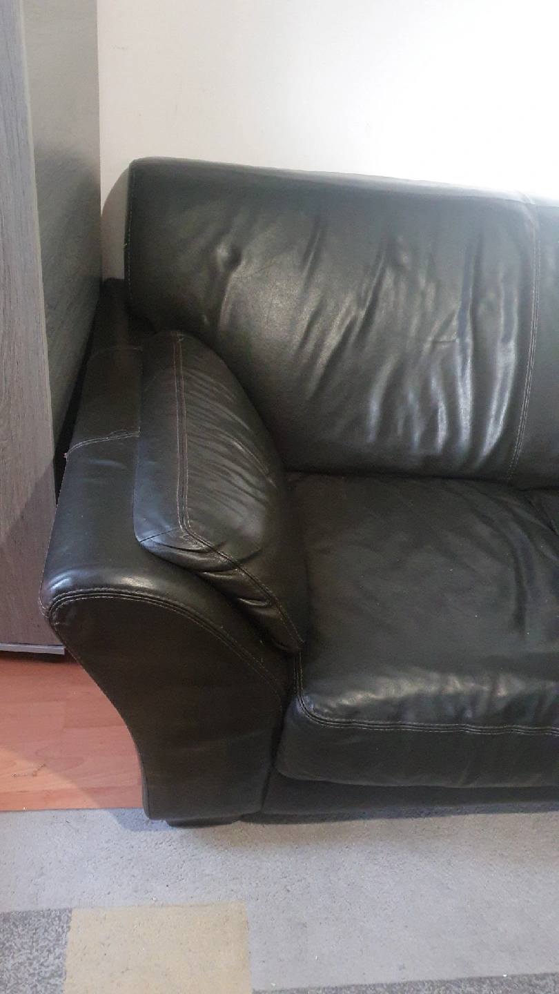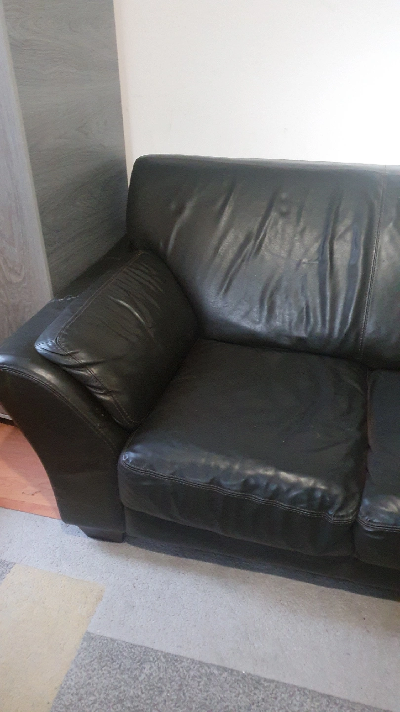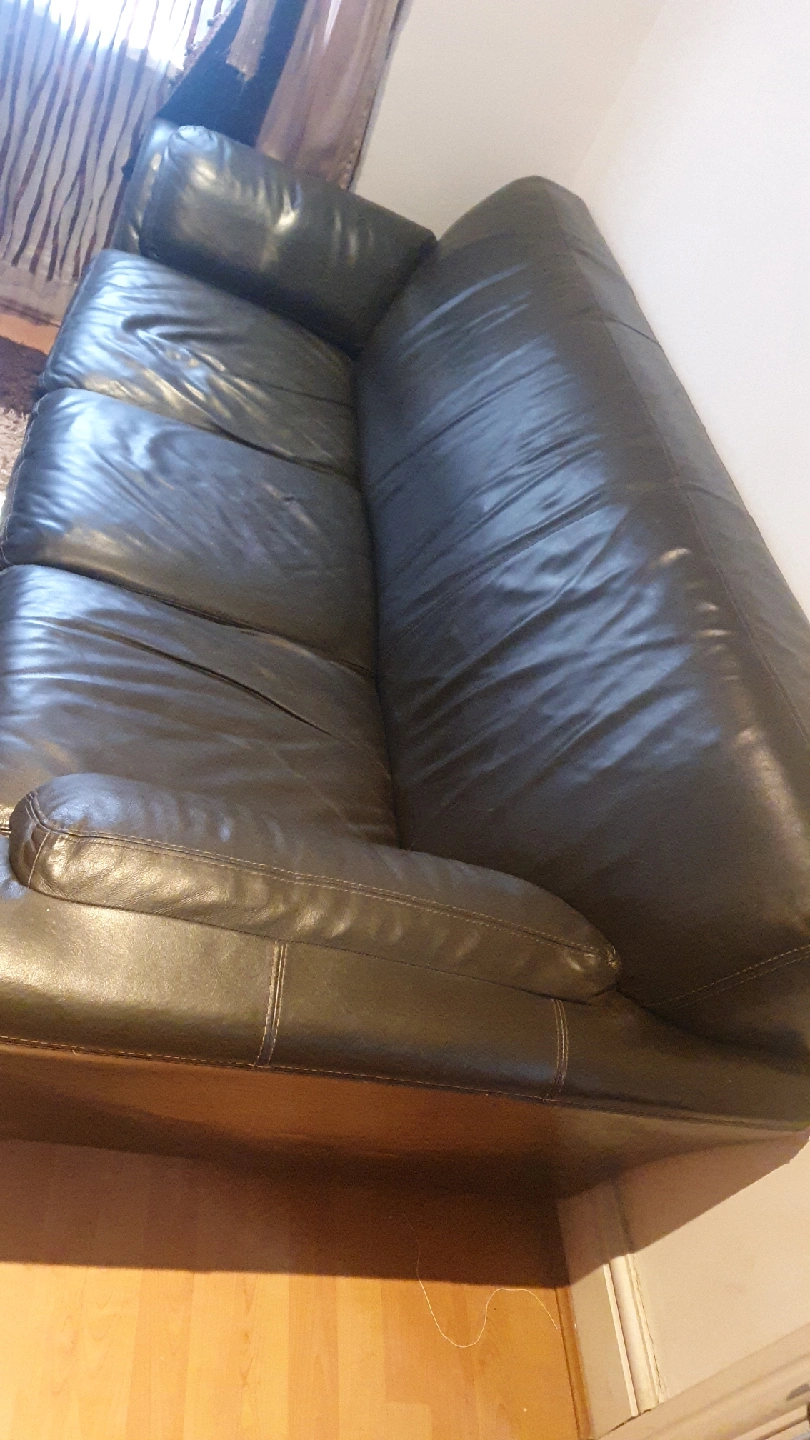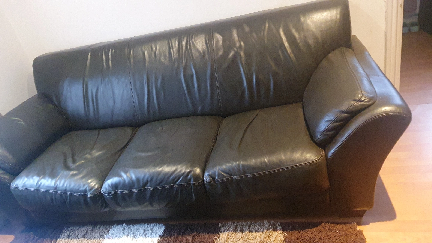 5 reviewsSelling a used black leather sofa. It's a three-seater and 2 seater and it's its would be perfect for a living room. It does show some signs of wear, as you can see in the photos, but it's still got plenty of life left in it a tiny little hole in 3 seater,s open to sensible offer please