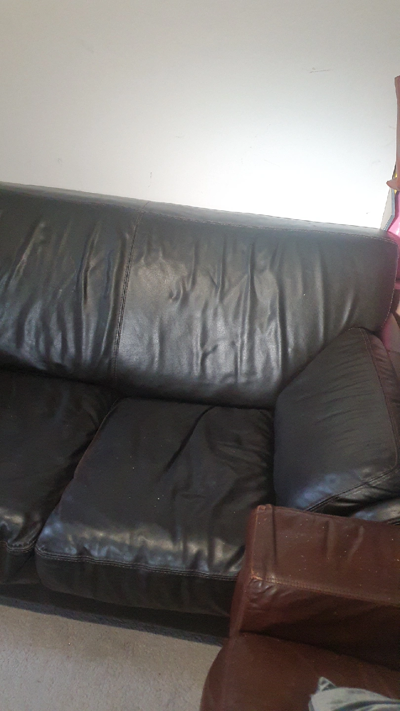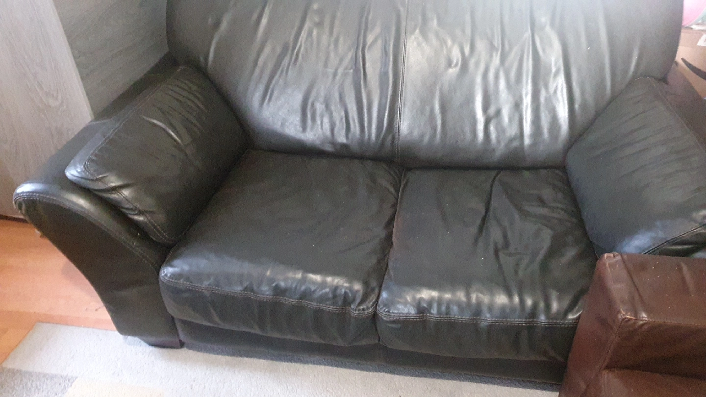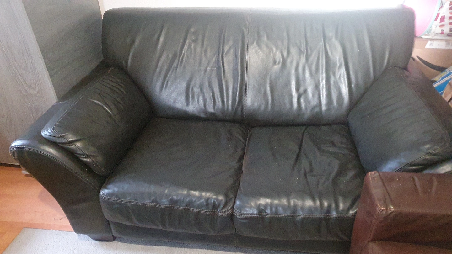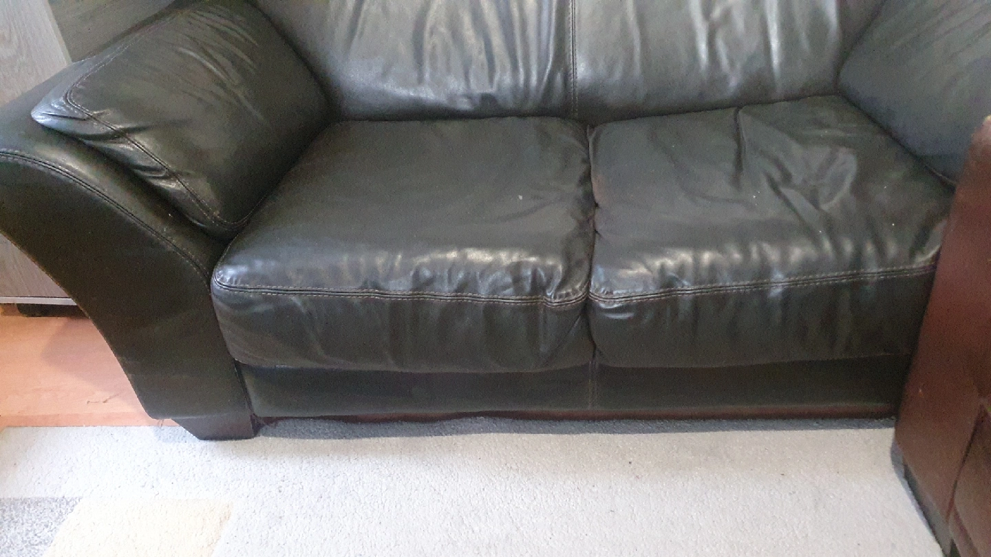 5 reviewsSelling a used black leather sofa. It's a three-seater and 2 seater and it's its would be perfect for a living room. It does show some signs of wear, as you can see in the photos, but it's still got plenty of life left in it a tiny little hole in 3 seater,s open to sensible offer please