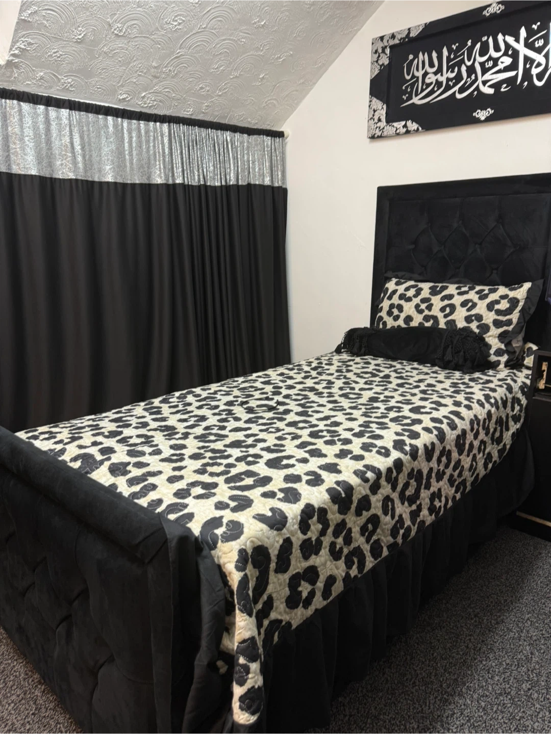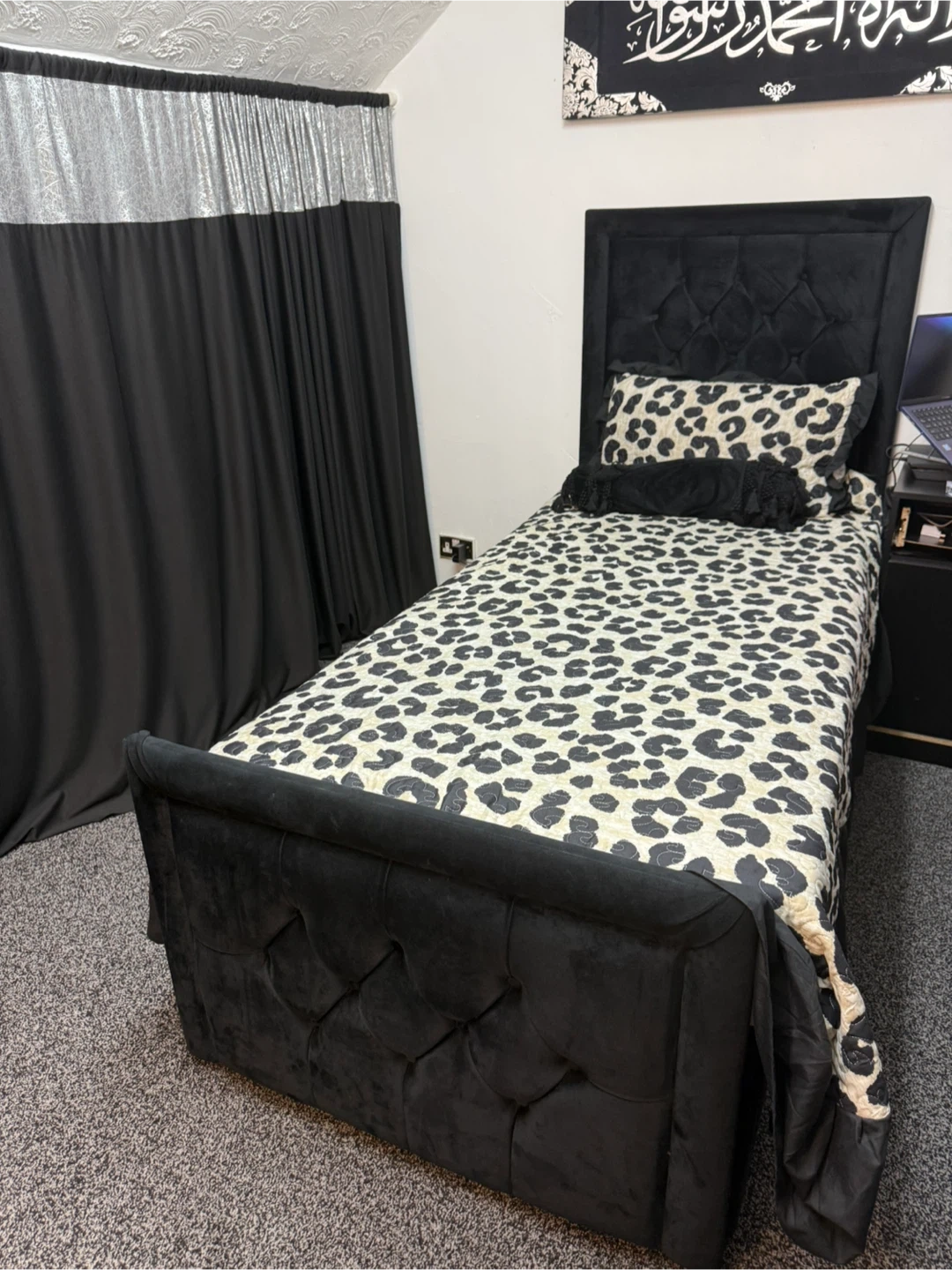 1 reviewSelling a lovely black velvet single bed frame. It's in great condition and would look fab in any bedroom. The bed features a stylish headboard and footboard, adding a touch of elegance to your space. With storage and mattress.