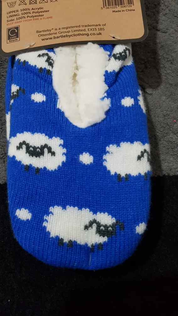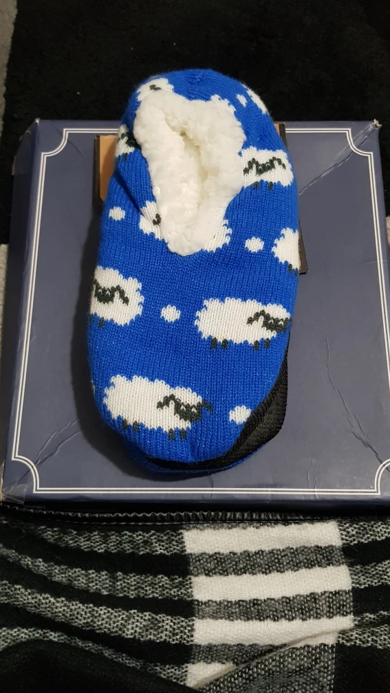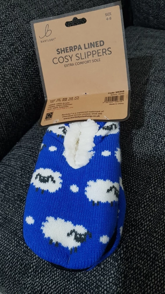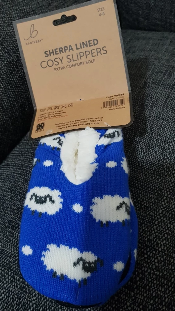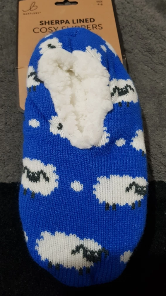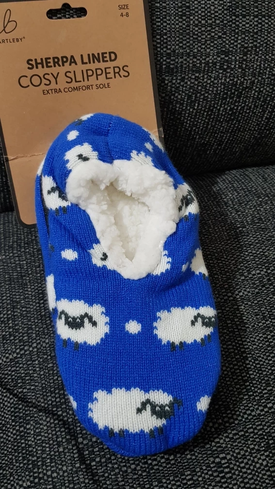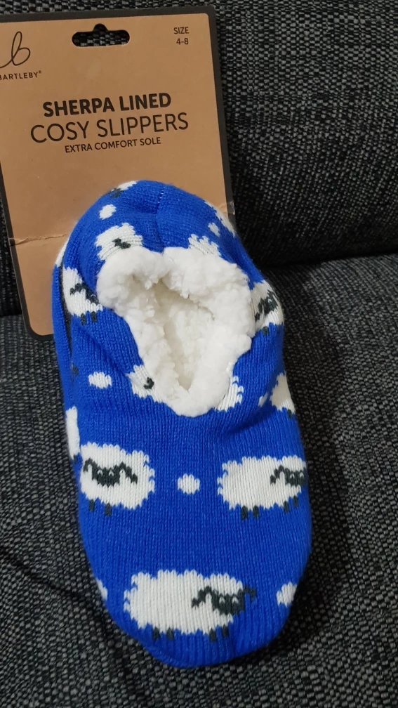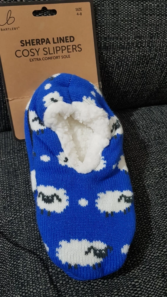 0 reviewsBrand new with tags Sherpa Lined Cosy Slippers. Extra comfort sole. Colour: Blue and White printed Size : 4- 8 Brand: Bartleby