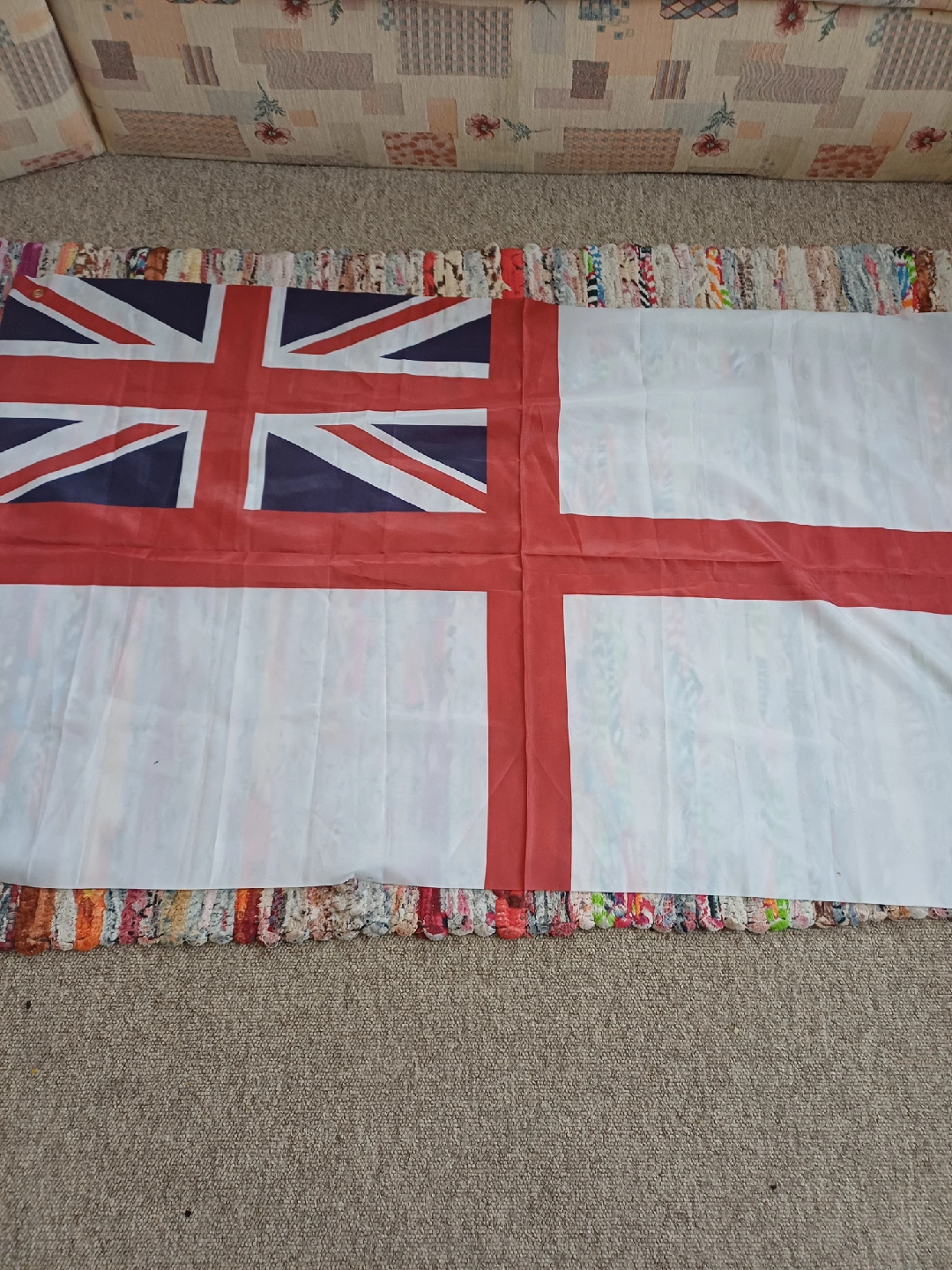 243 reviewsHere's a British White Ensign flag. It's in good condition and would be great for anyone interested in naval history or British culture very big the flag is lieing on my lounge floor