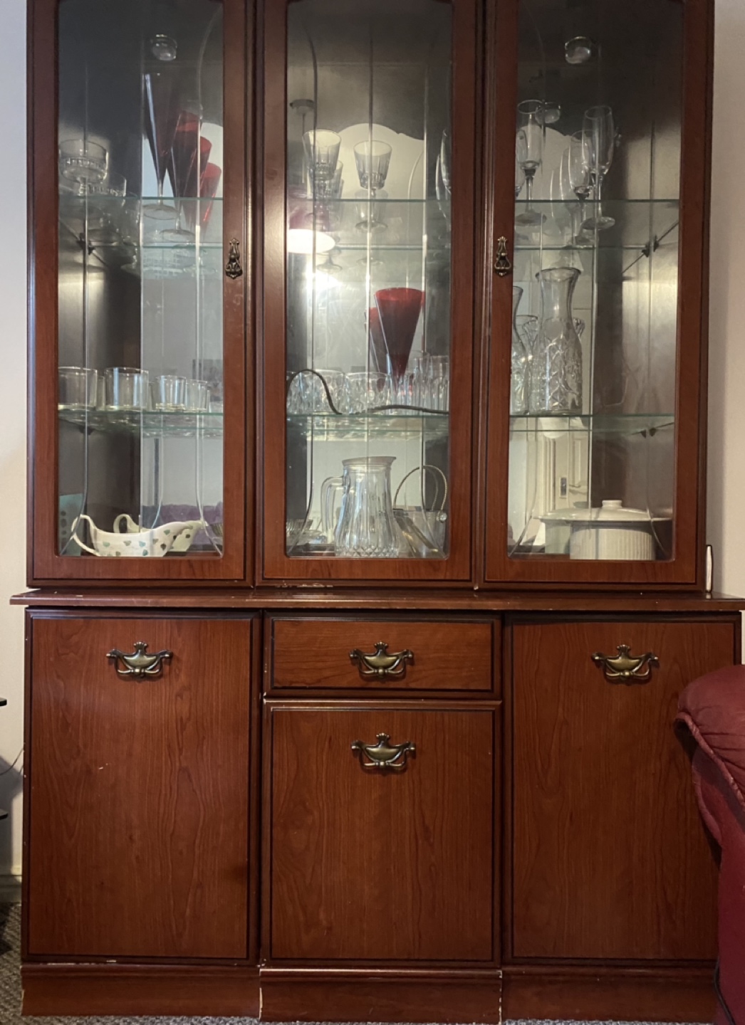 0 reviewsWooden and glass cabinet Big mirror behind the shelves Lots of storage I want to free up space