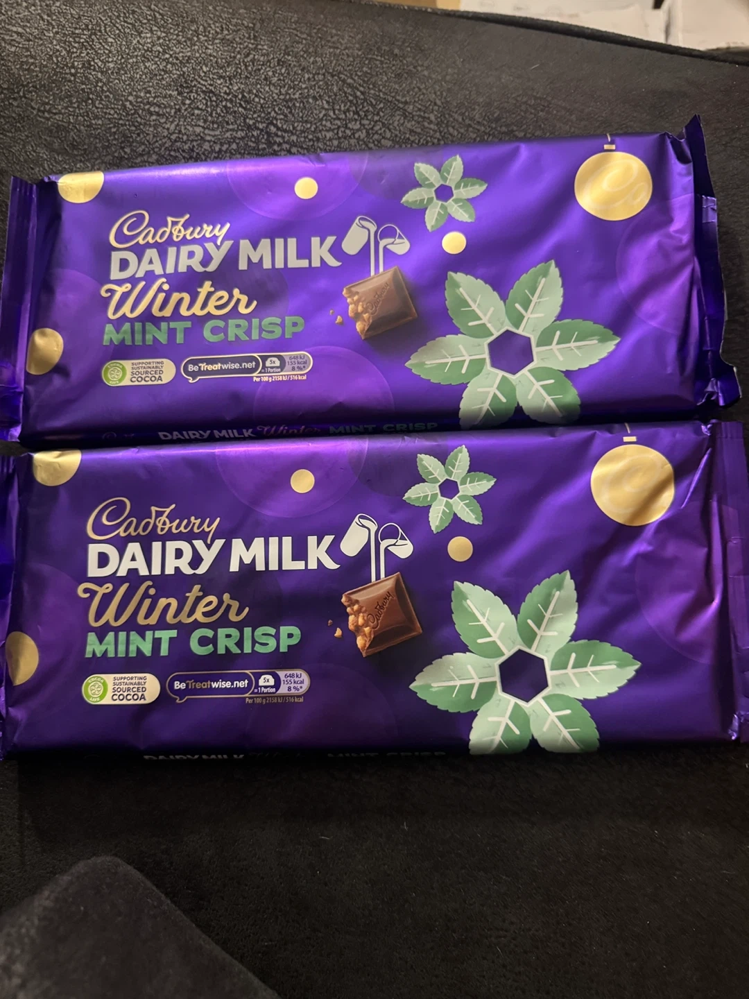 14 reviewsTwo Cadbury Dairy Milk Winter Mint Crisp chocolate bars for sale. They're perfect for a festive treat! Each portion is 155 kcal. Enjoy the taste of sustainably sourced cocoa in these delicious bars 360g