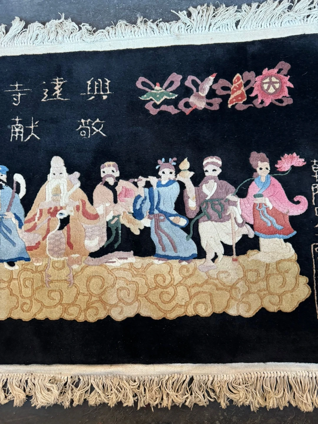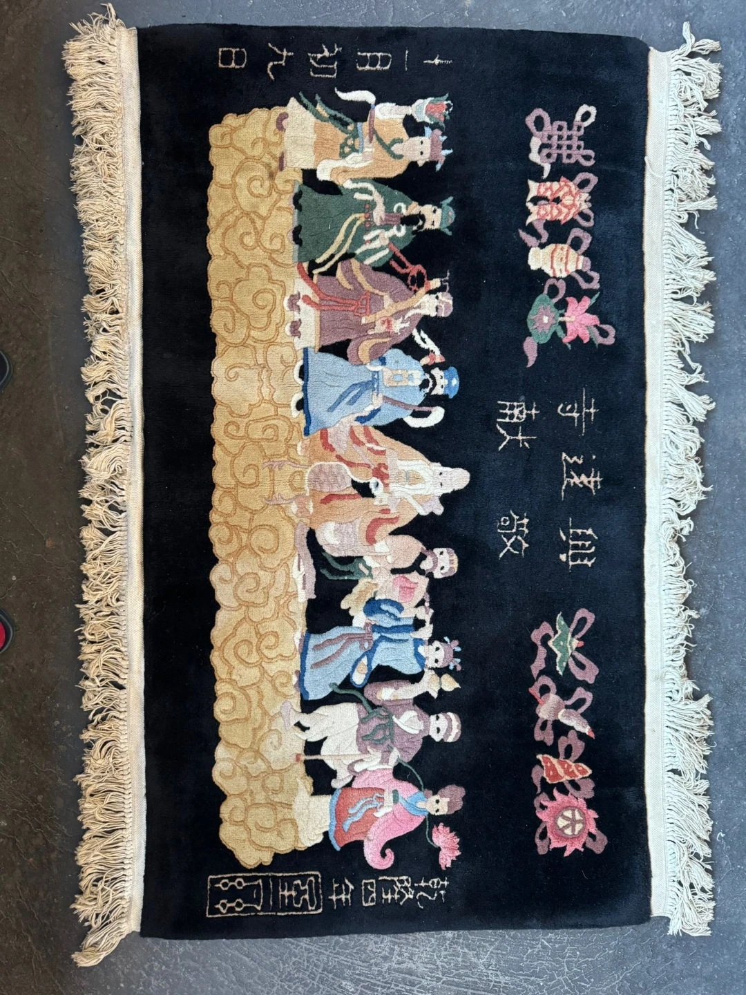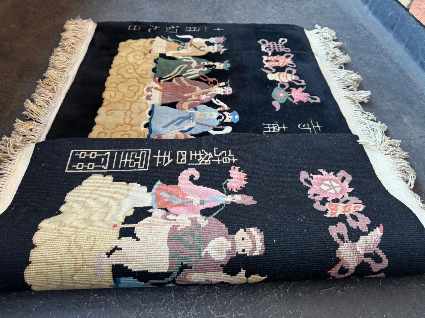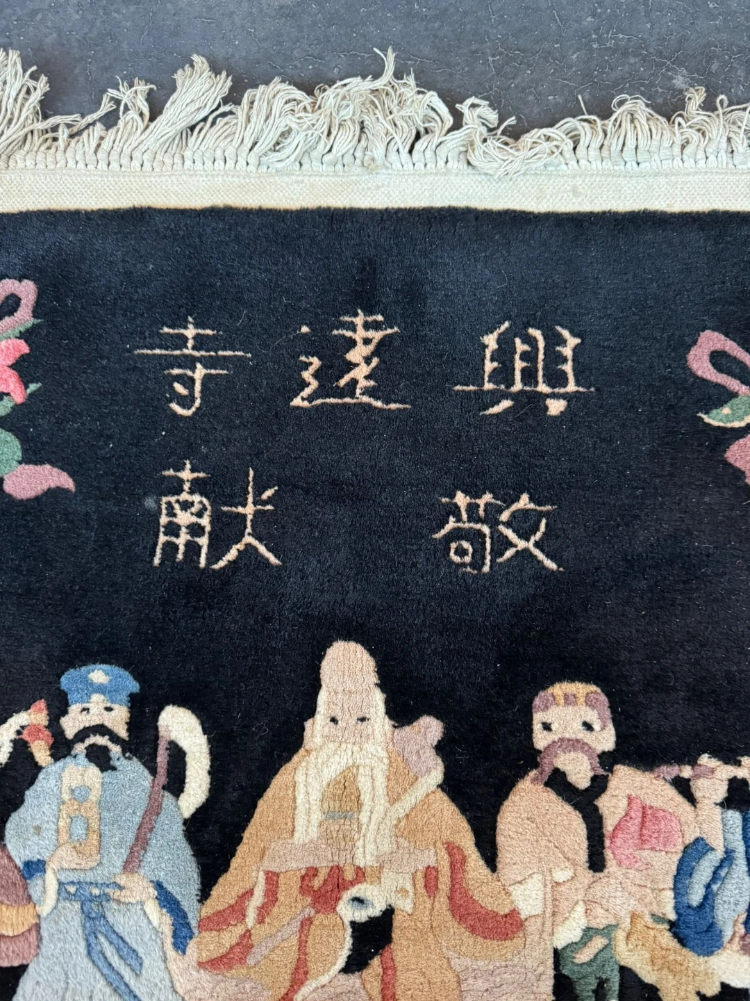 5 reviews. Chinese handmade wool rug with signature. Very good condition. It features a detailed design with figures and Chinese characters. Perfect for adding a touch of culture to your home.