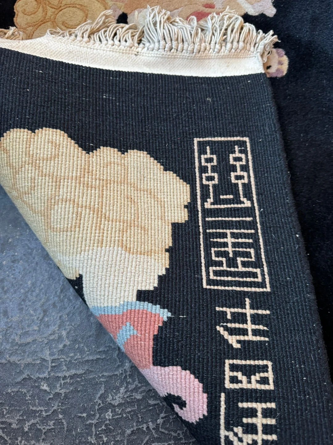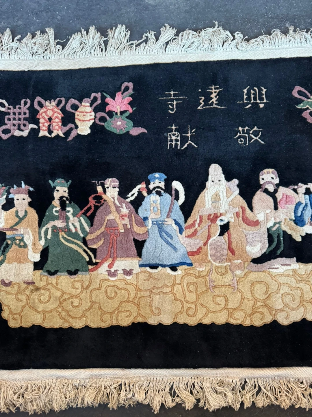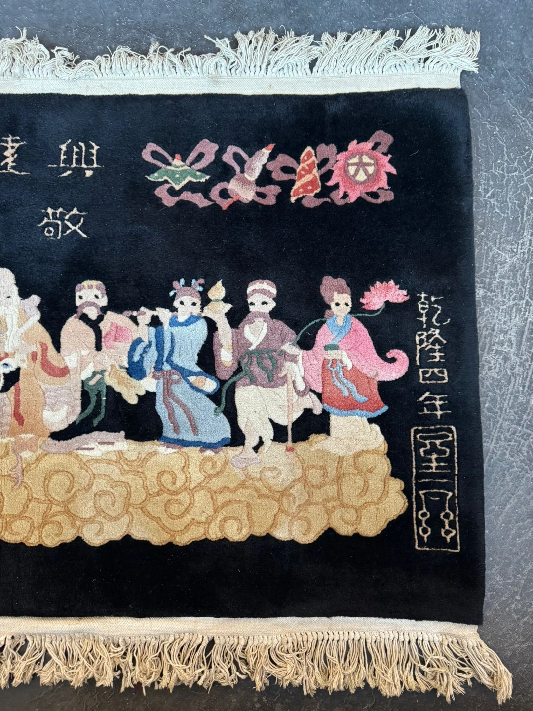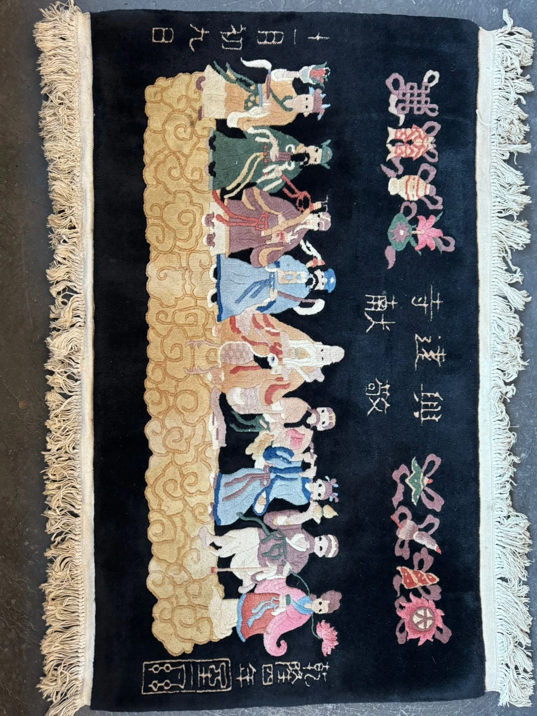 5 reviews. Chinese handmade wool rug with signature. Very good condition. It features a detailed design with figures and Chinese characters. Perfect for adding a touch of culture to your home.