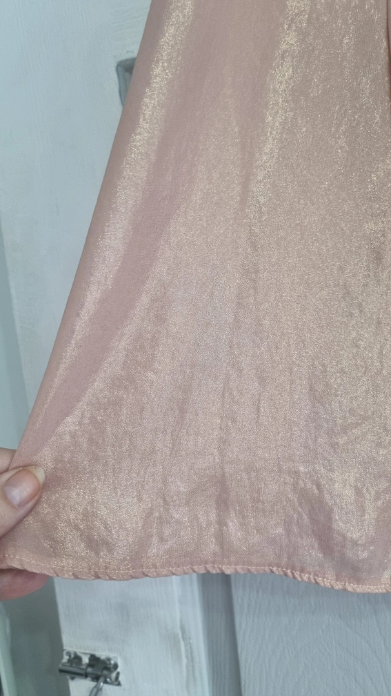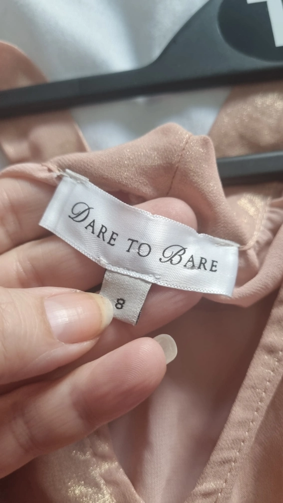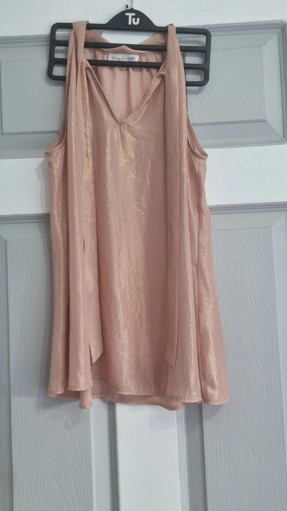 A lovely peachy coloured top from Dare to Bare. It's a size 8 and in great condition. The material has a subtle shimmer to it, making it perfect for dressing up or down. It features tie detailing at the shoulders. A really versatile piece for your wardrobe!