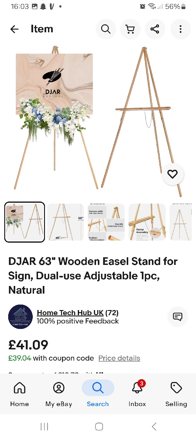 2 reviewsSelling a DJAR 63" wooden easel stand. It's dual-use and adjustable, perfect for signs or artwork. It has a double stabilised chain and rubber feet for extra stability. Originally bought for £41.09