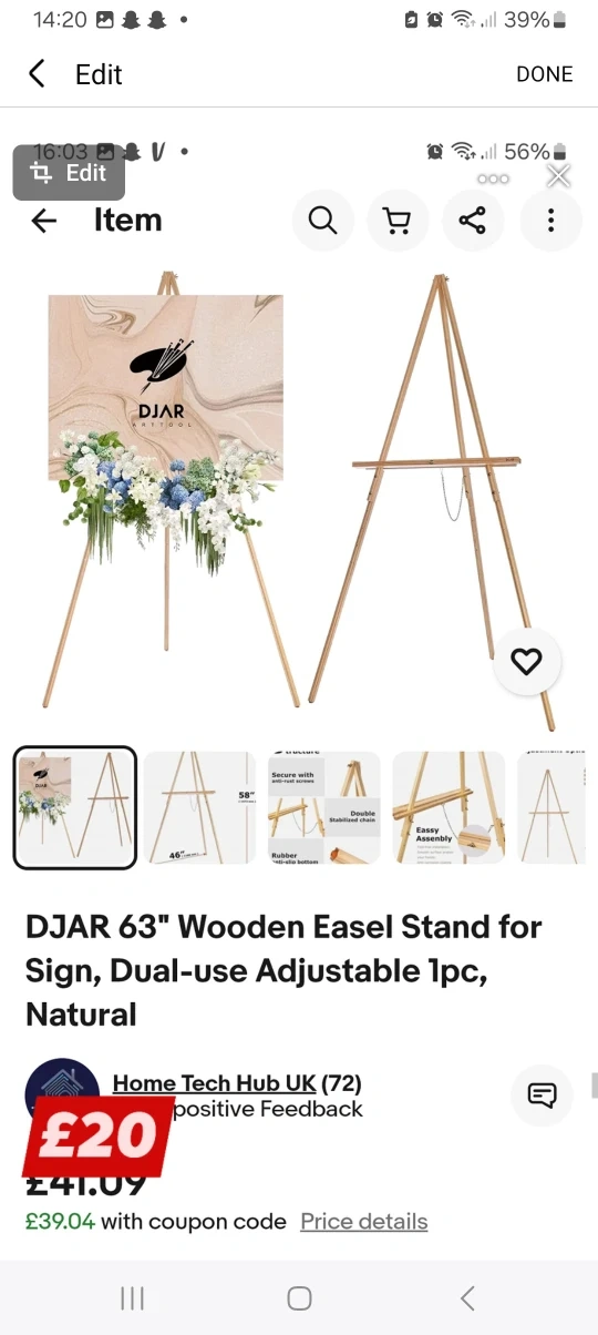2 reviewsSelling a DJAR 63" wooden easel stand. It's a dual-use, adjustable stand in a natural finish. Perfect for signs or artwork!
