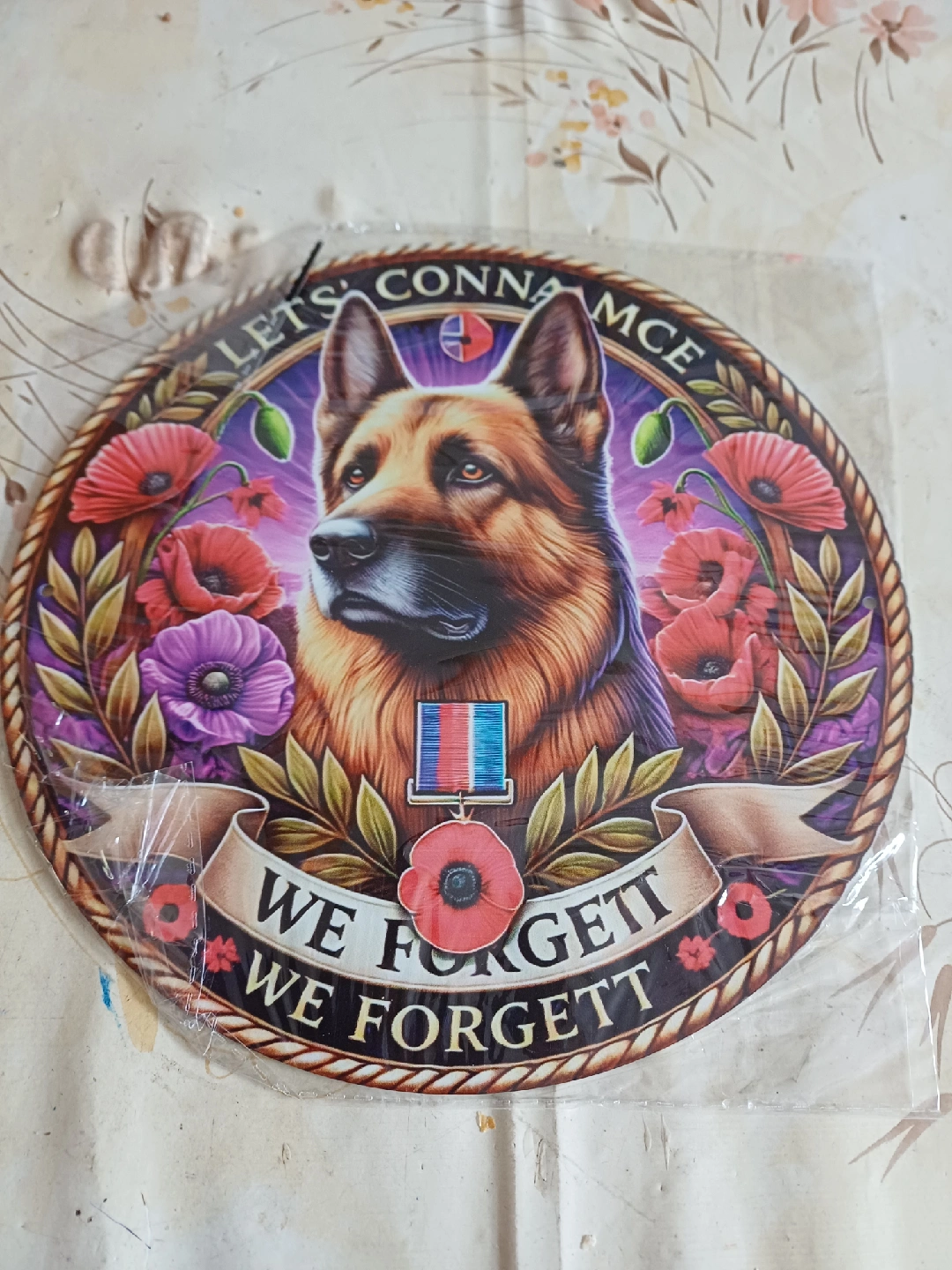 243 reviewsA lovely piece of wall art featuring a German Shepherd dog, poppies, and the phrase 'We Forget'. It's round and appears to be in great condition, ready to add a touch of remembrance to your home
