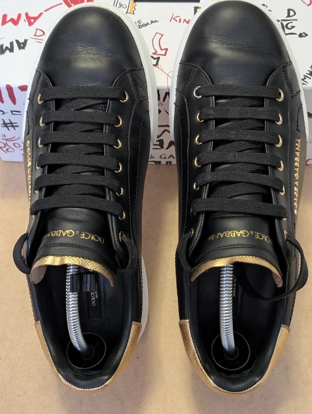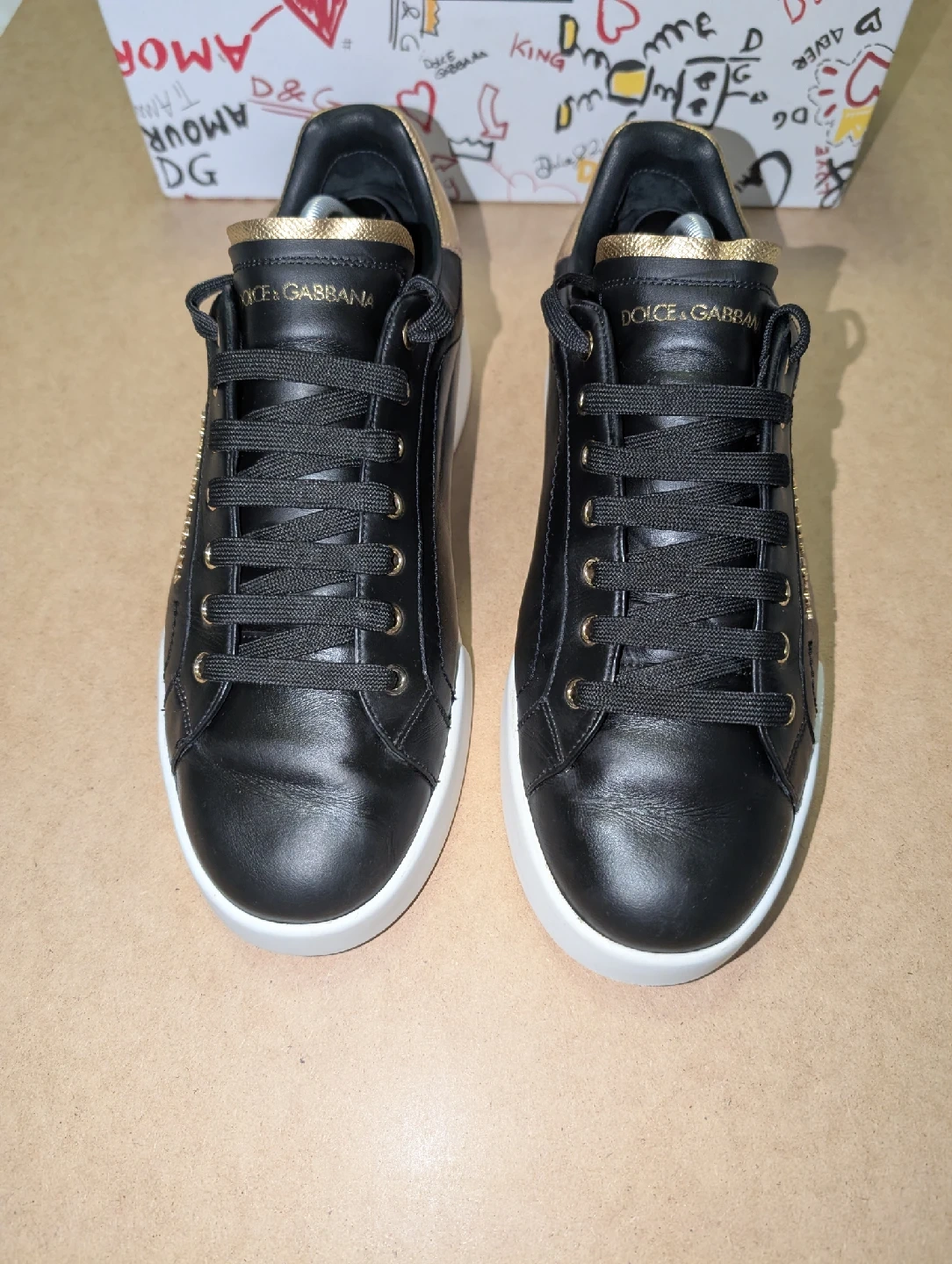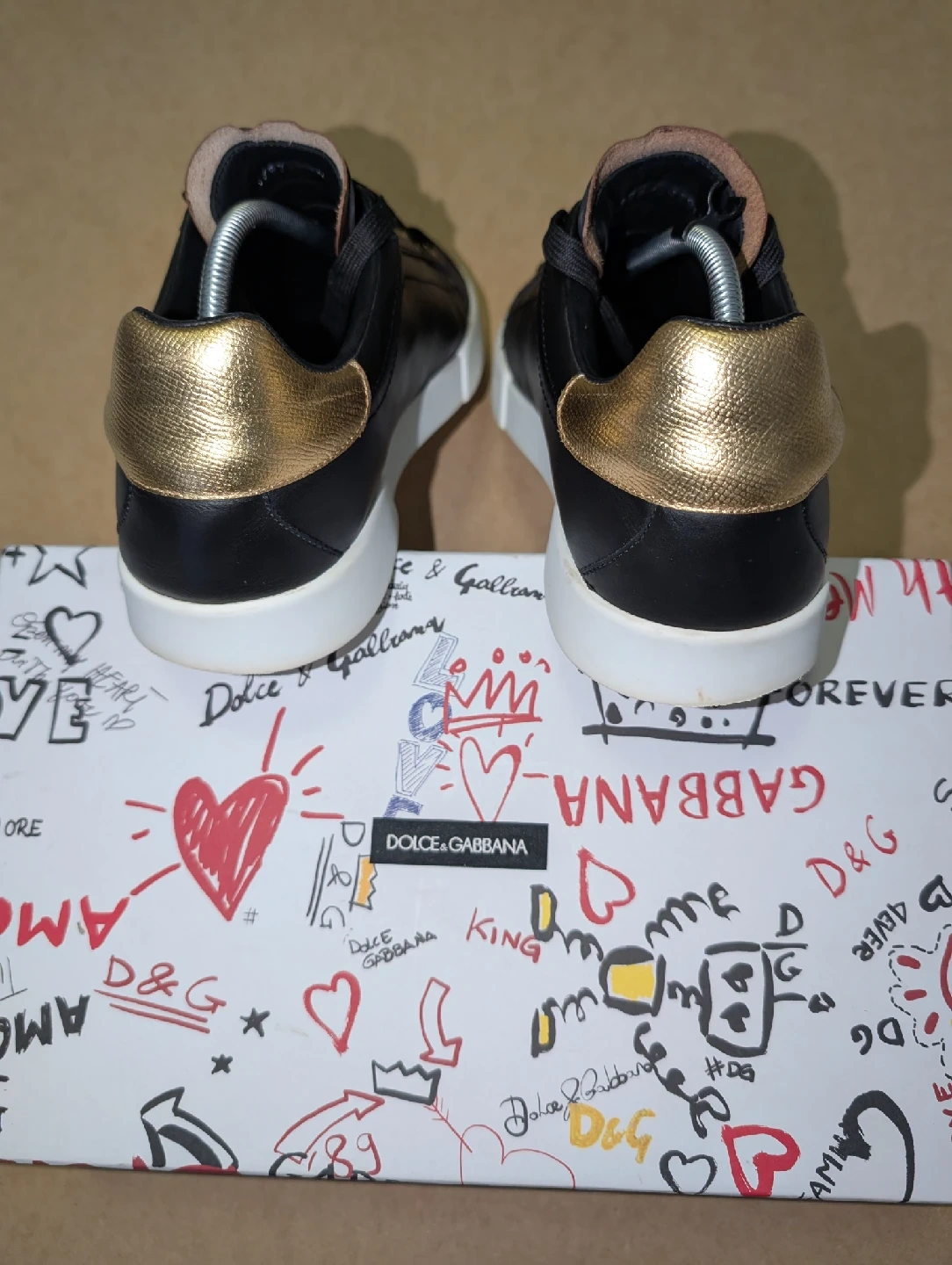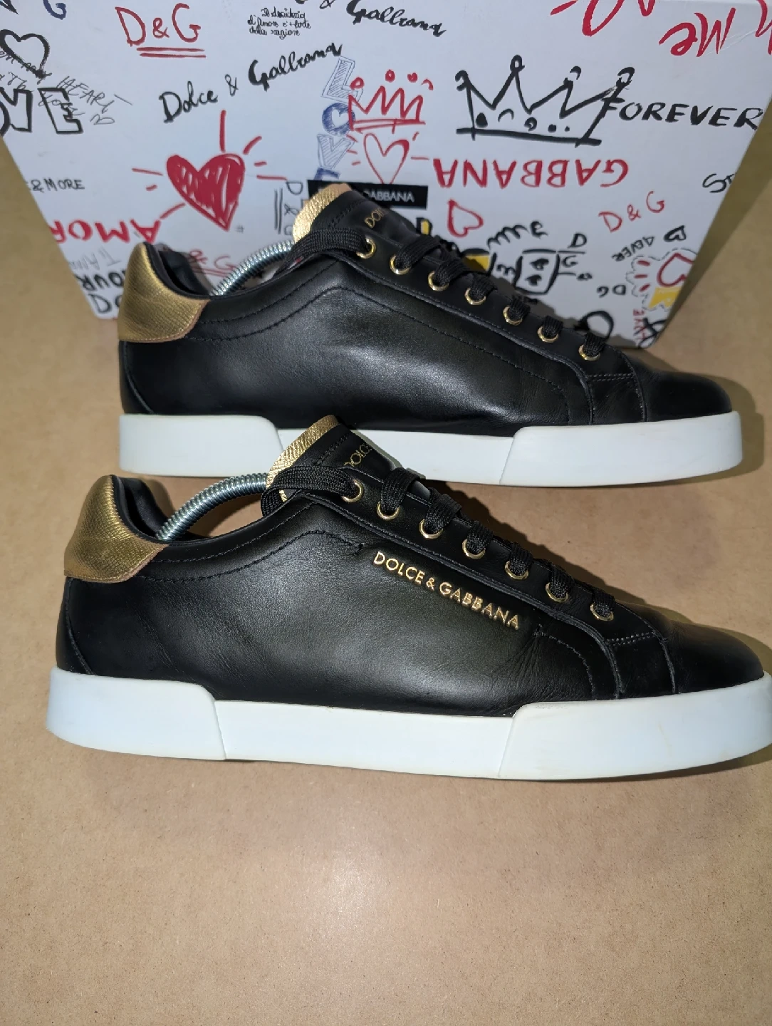 0 reviewsDolce & Gabbana trainers size 9 in black leather with gold detailing. These are in great condition and come with the original box. A stylish addition to any wardrobe!