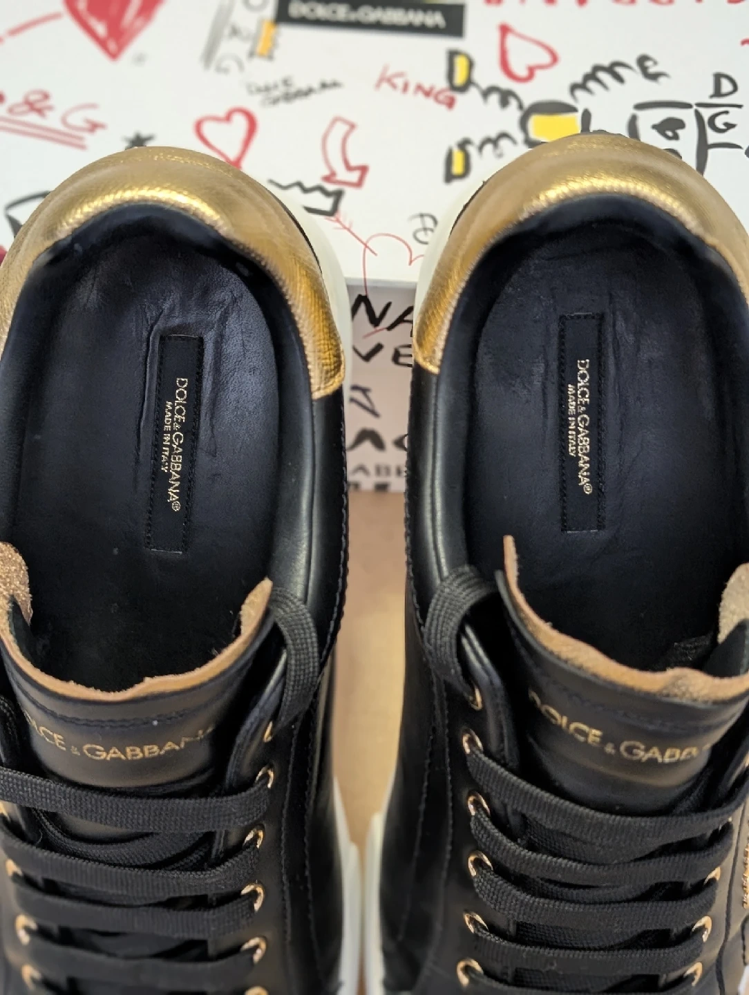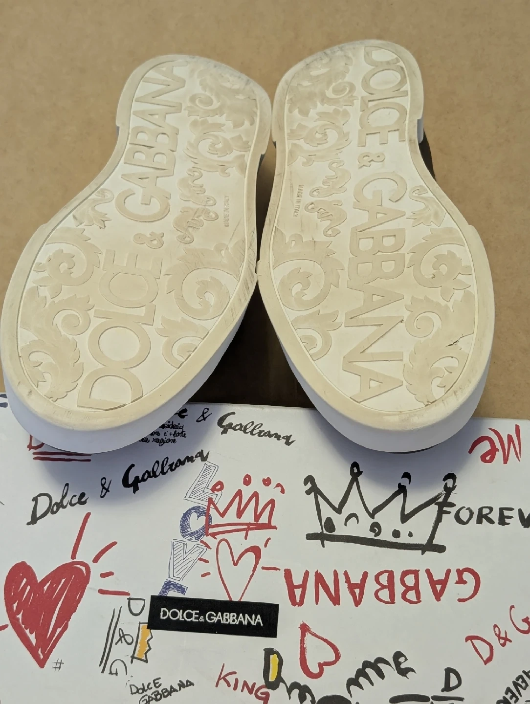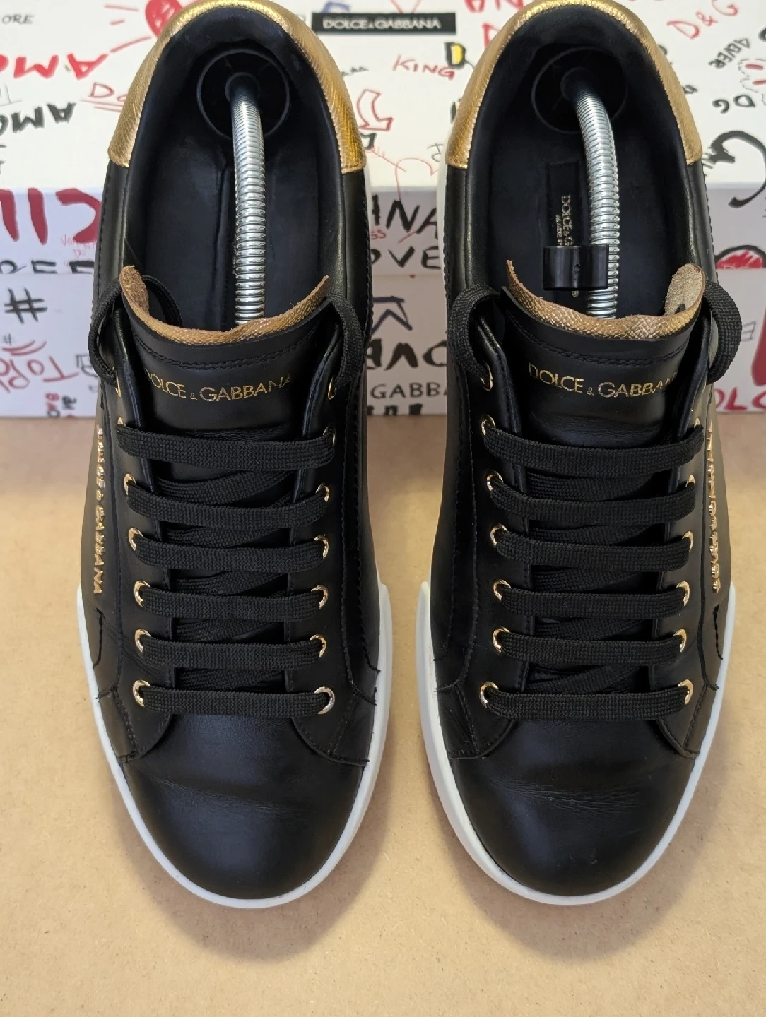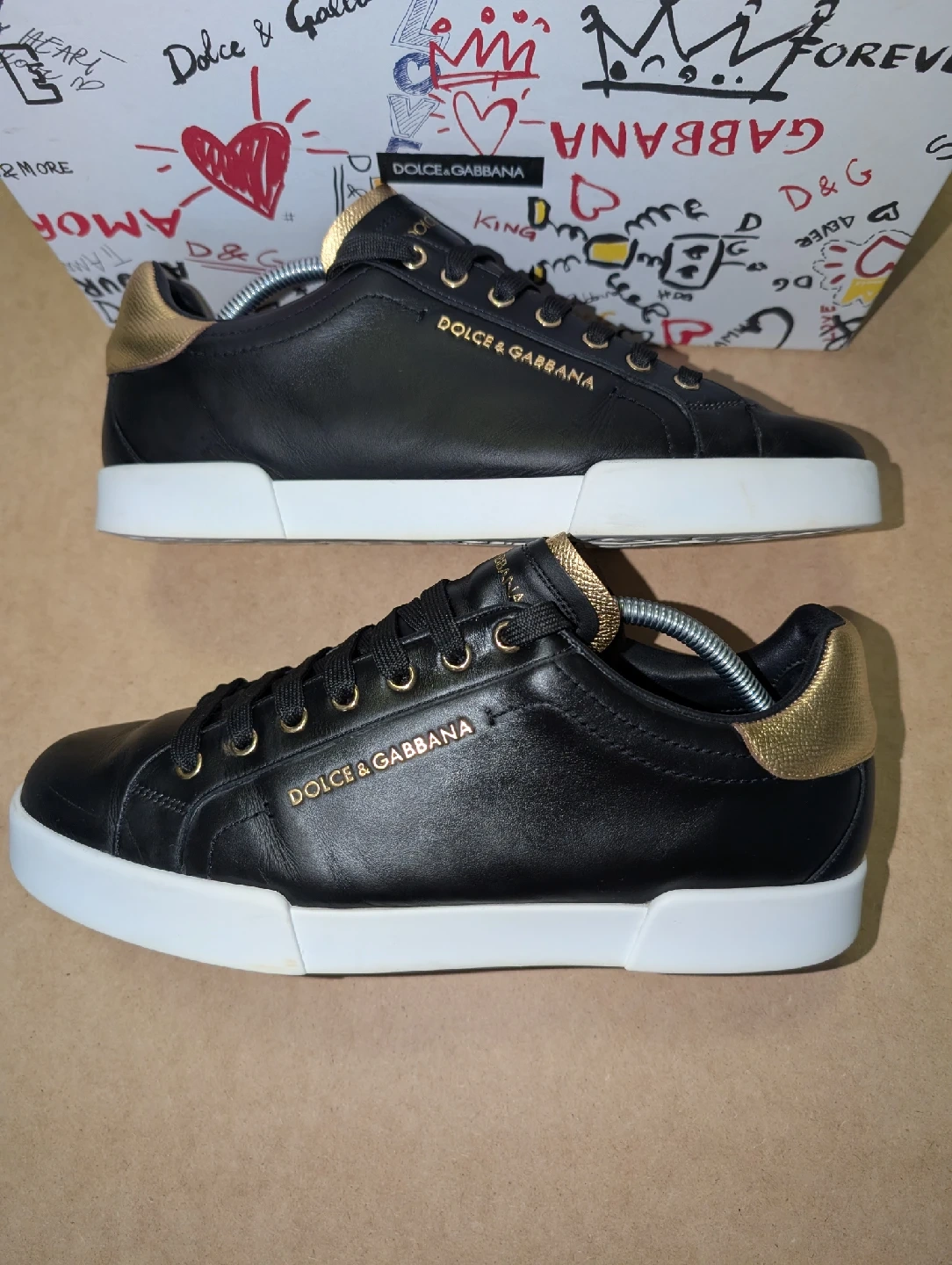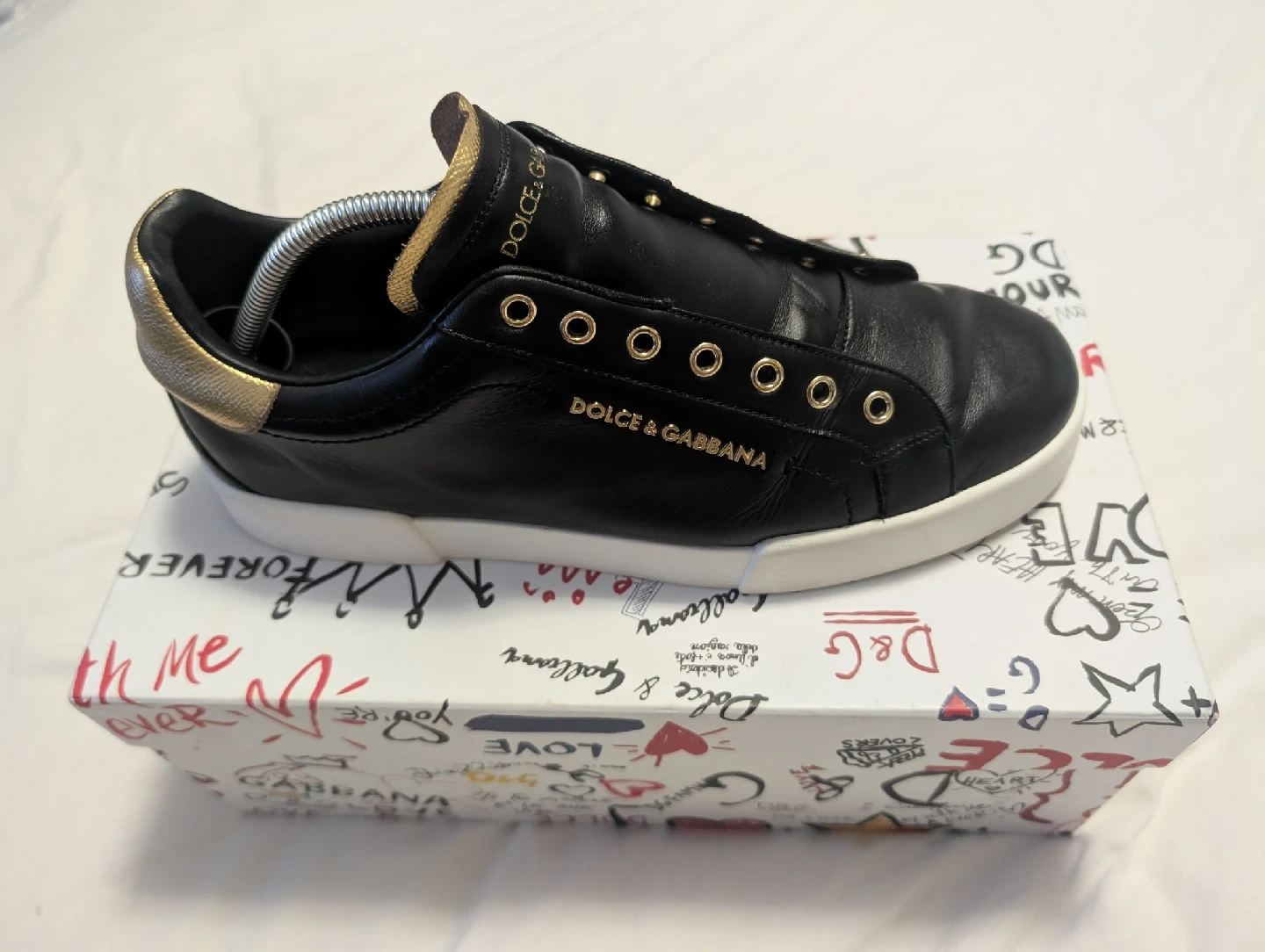 0 reviewsDolce & Gabbana trainers size 9 in black leather with gold detailing. These are in great condition and come with the original box. A stylish addition to any wardrobe!