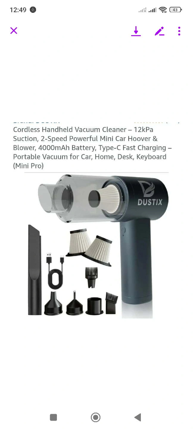 3 reviewsCordless handheld vacuum cleaner with 12kPa suction. It's a 2-speed powerful mini car hoover and blower. The battery is 4000mAh with type-C fast charging. It is a portable vacuum for car, home, desk, and keyboard use (Mini Pro). It also comes with accessories, including a USB cable and multiple attachments