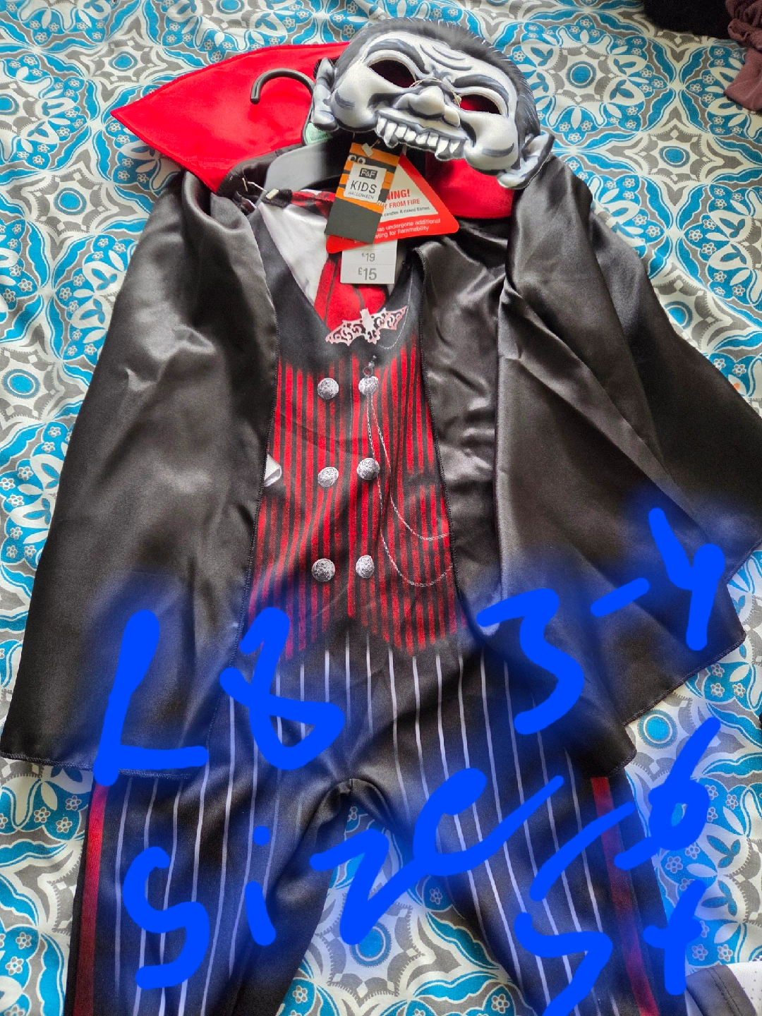 30 reviewsVampire costume for kids, perfect for Halloween! Size 3-4 years. Features a mask, cape, and detailed waistcoat. From F&F Kids.