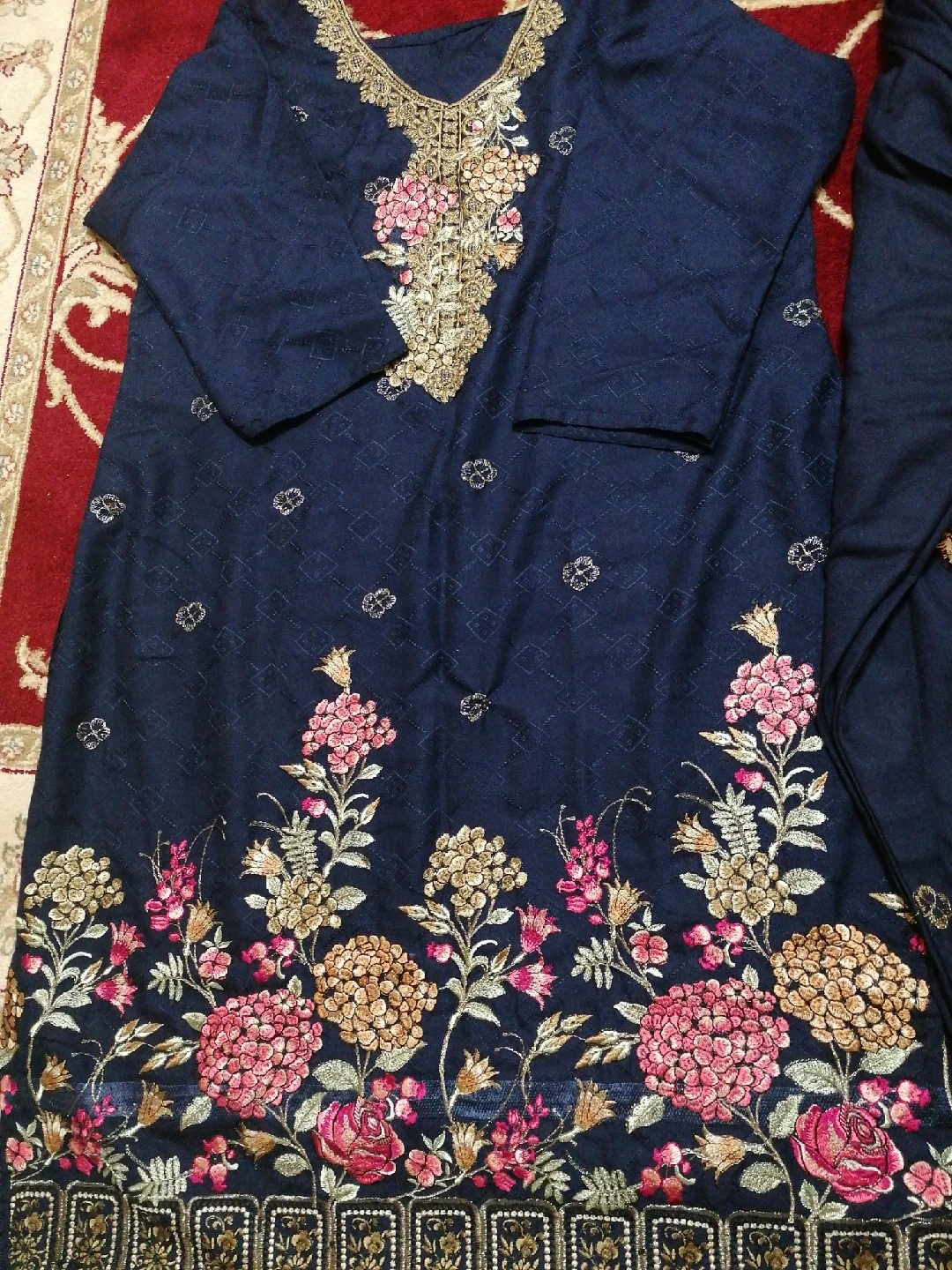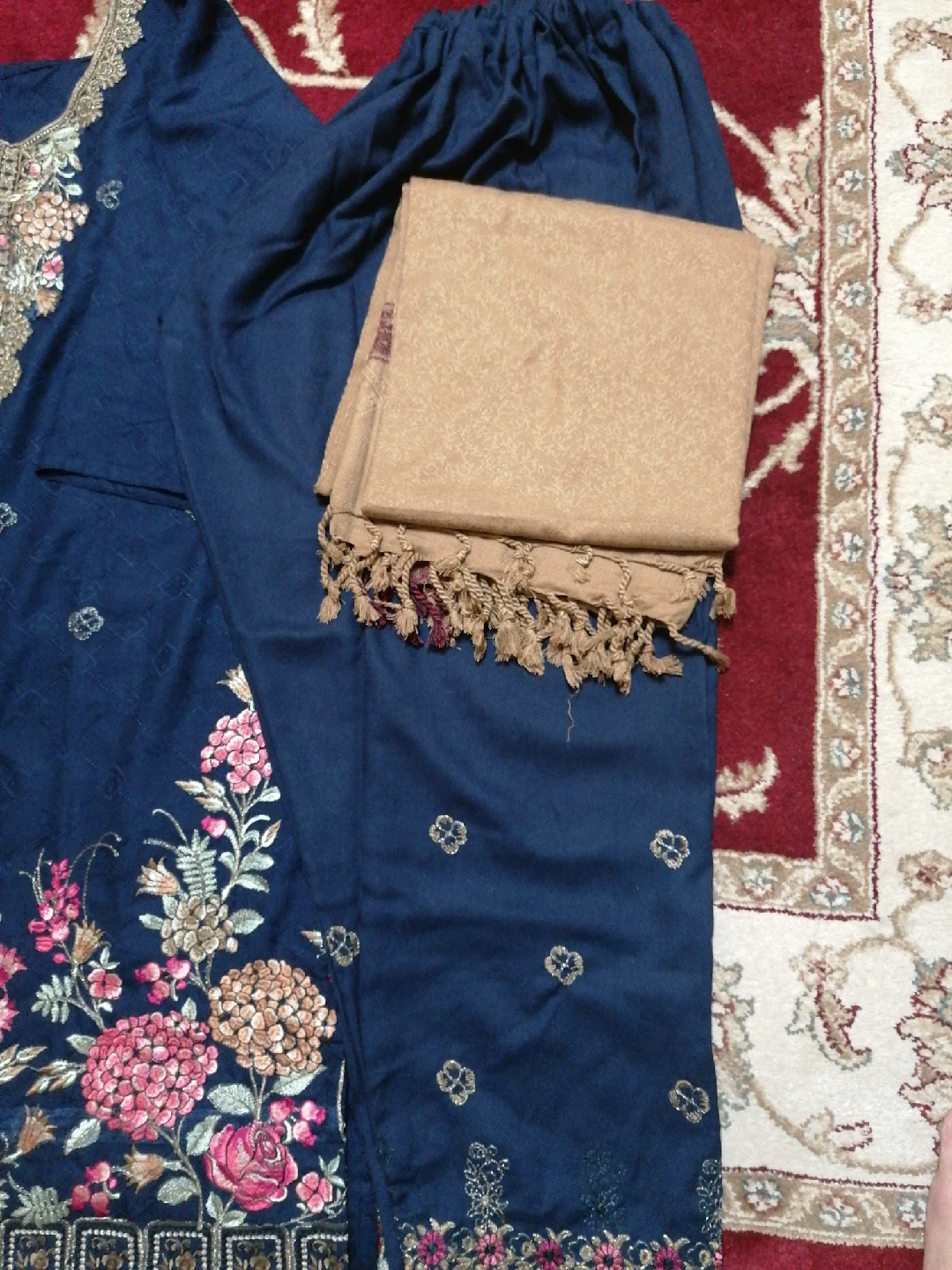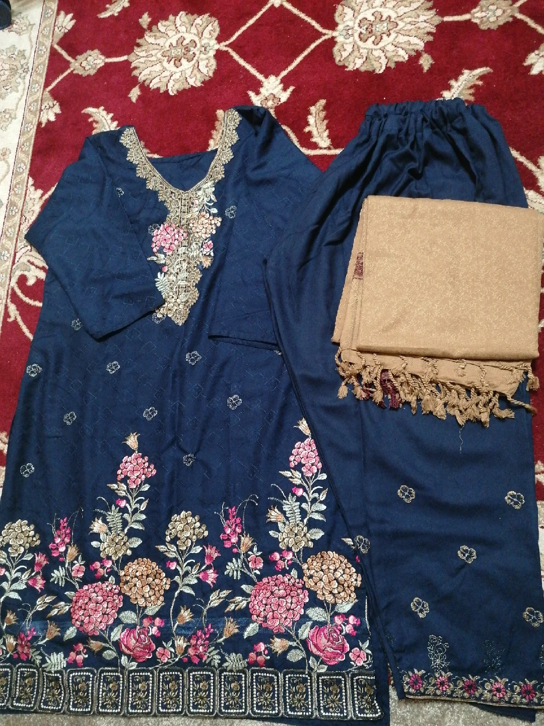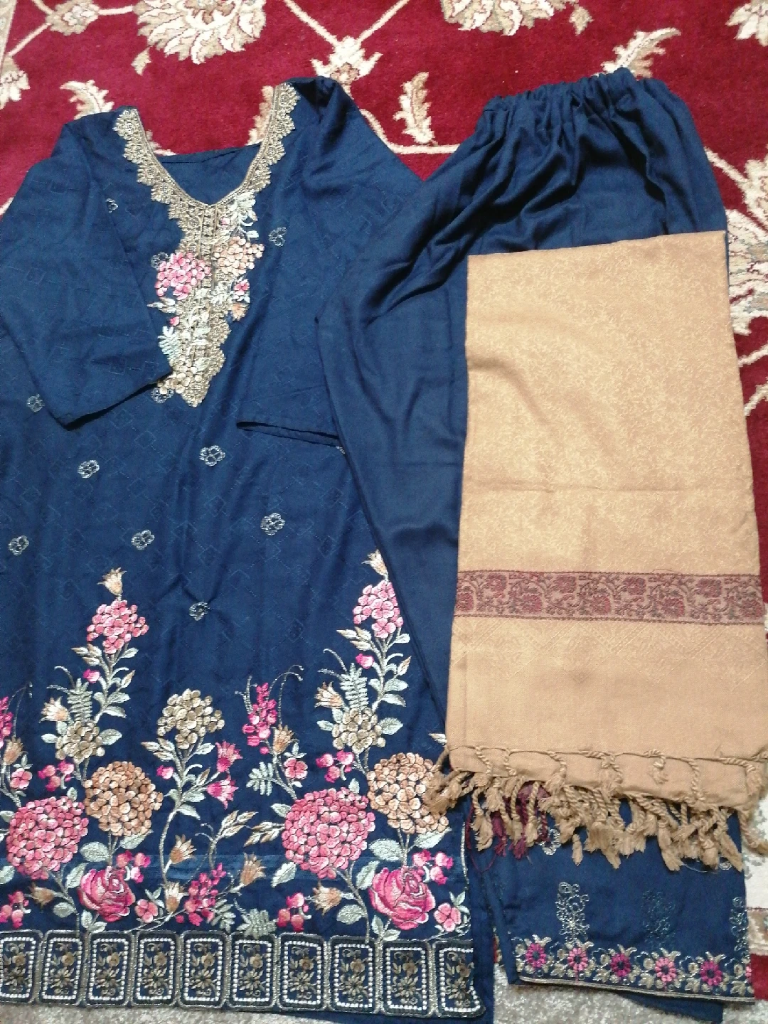20 reviewsA lovely shalwar kameez set featuring a beautiful floral embroidery design. The set includes a shirt, trousers, and a coordinating shawl. The material appears to be a comfortable fabric, perfect for various occasions. A stylish and complete outfit!