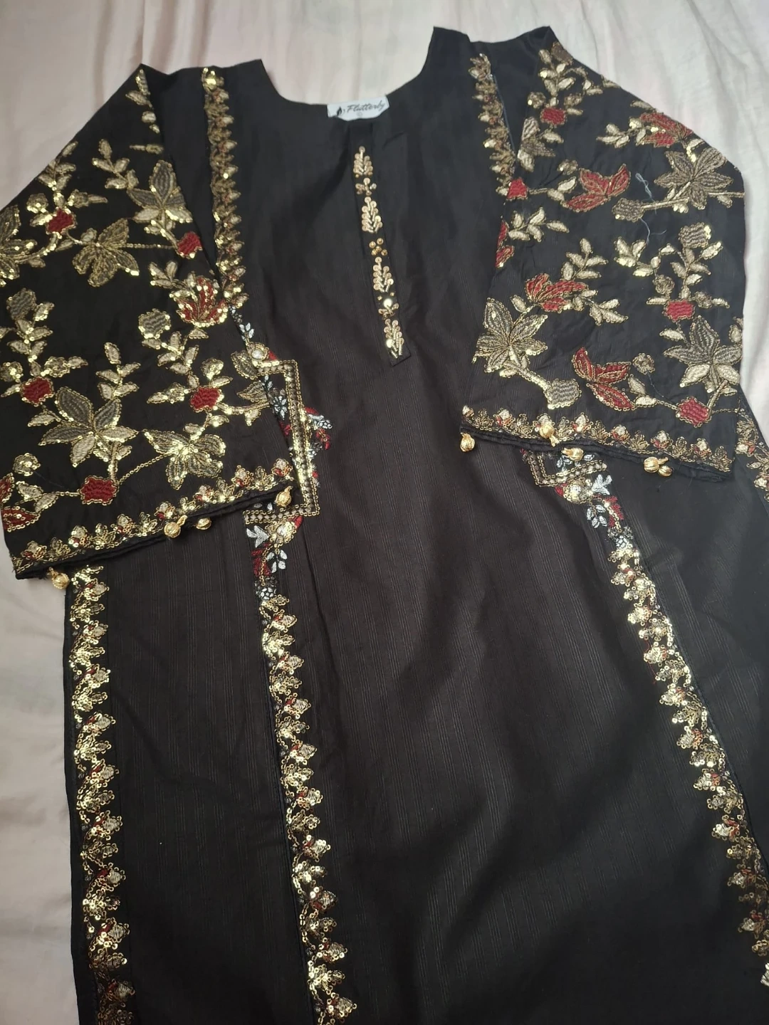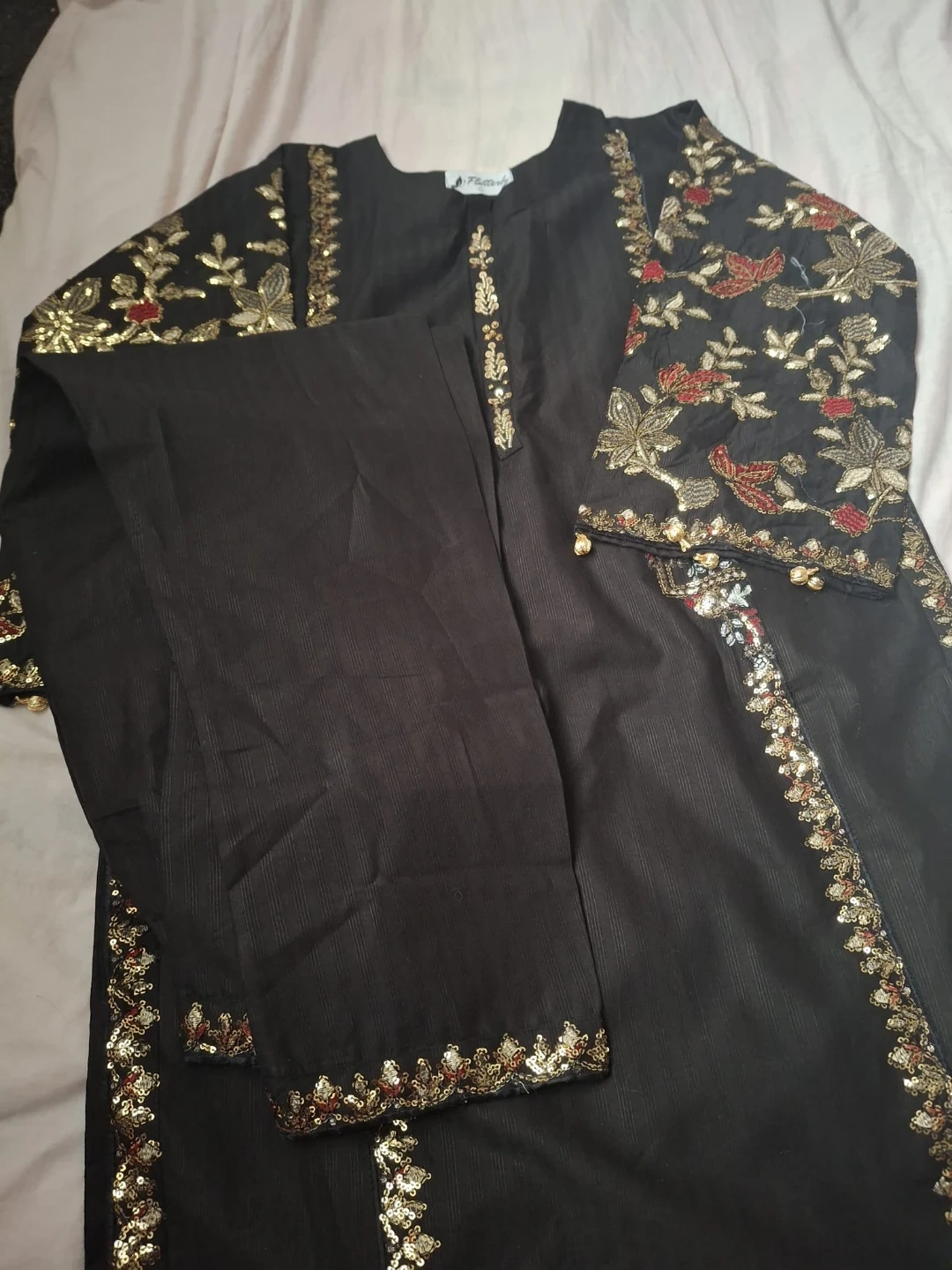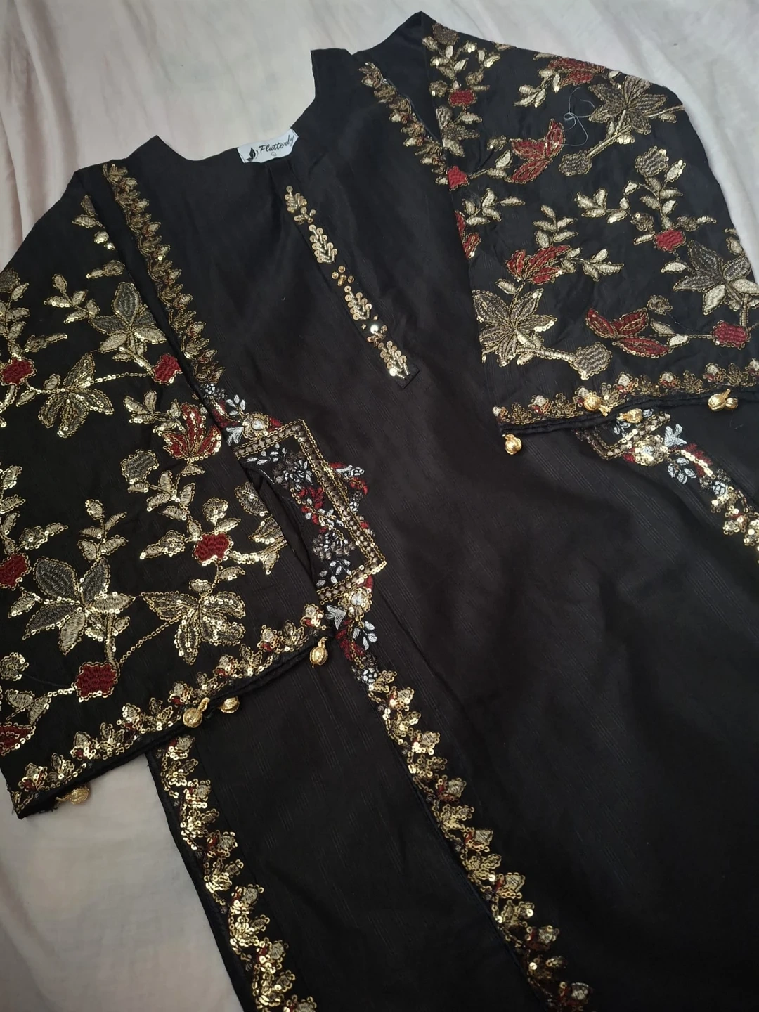 0 reviewsLovely black suit from Flutterby, size L. It features beautiful gold and red embroidery. In great condition and ready for a new home!