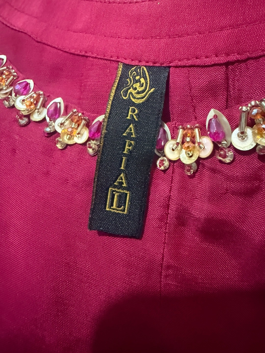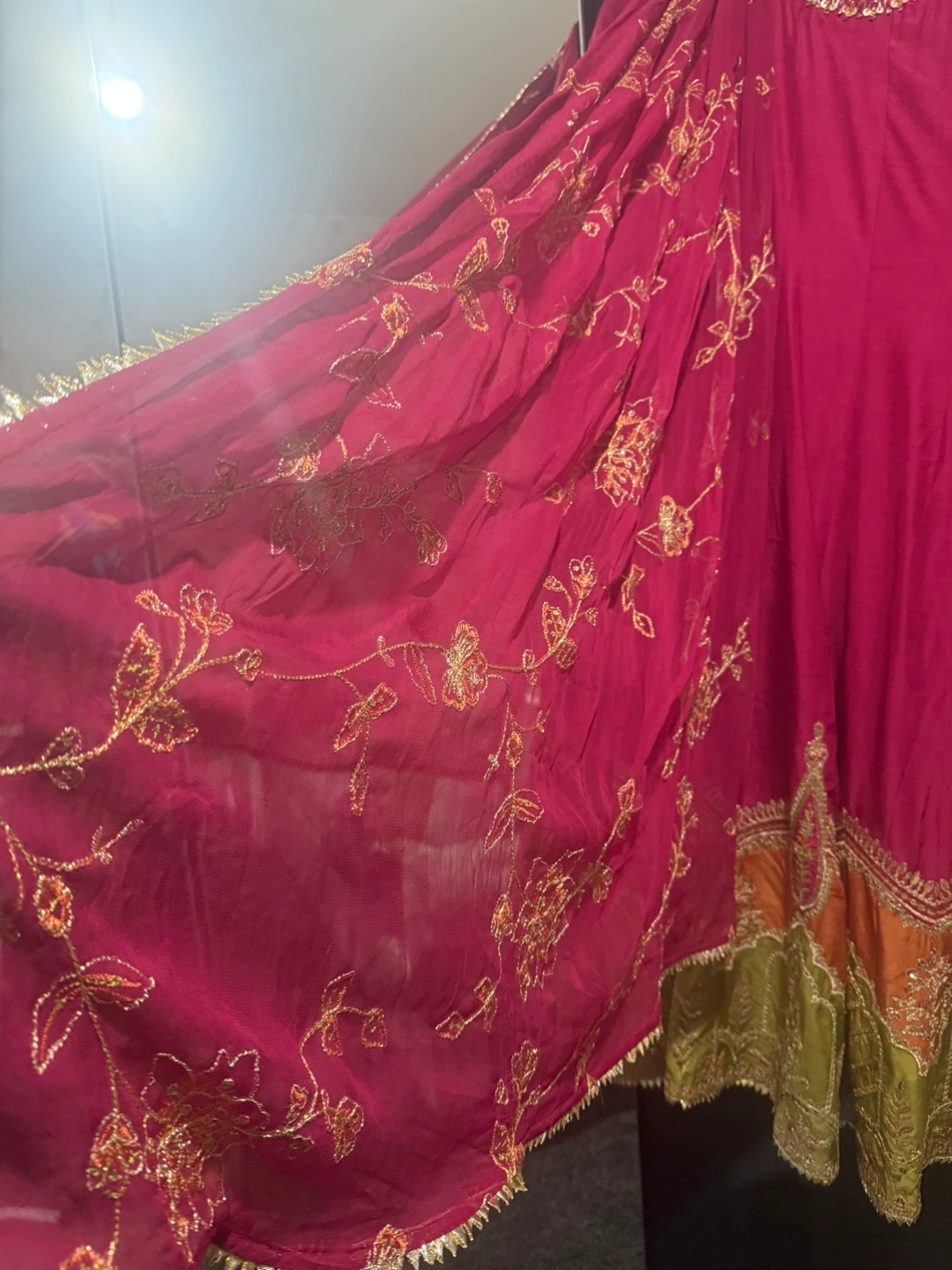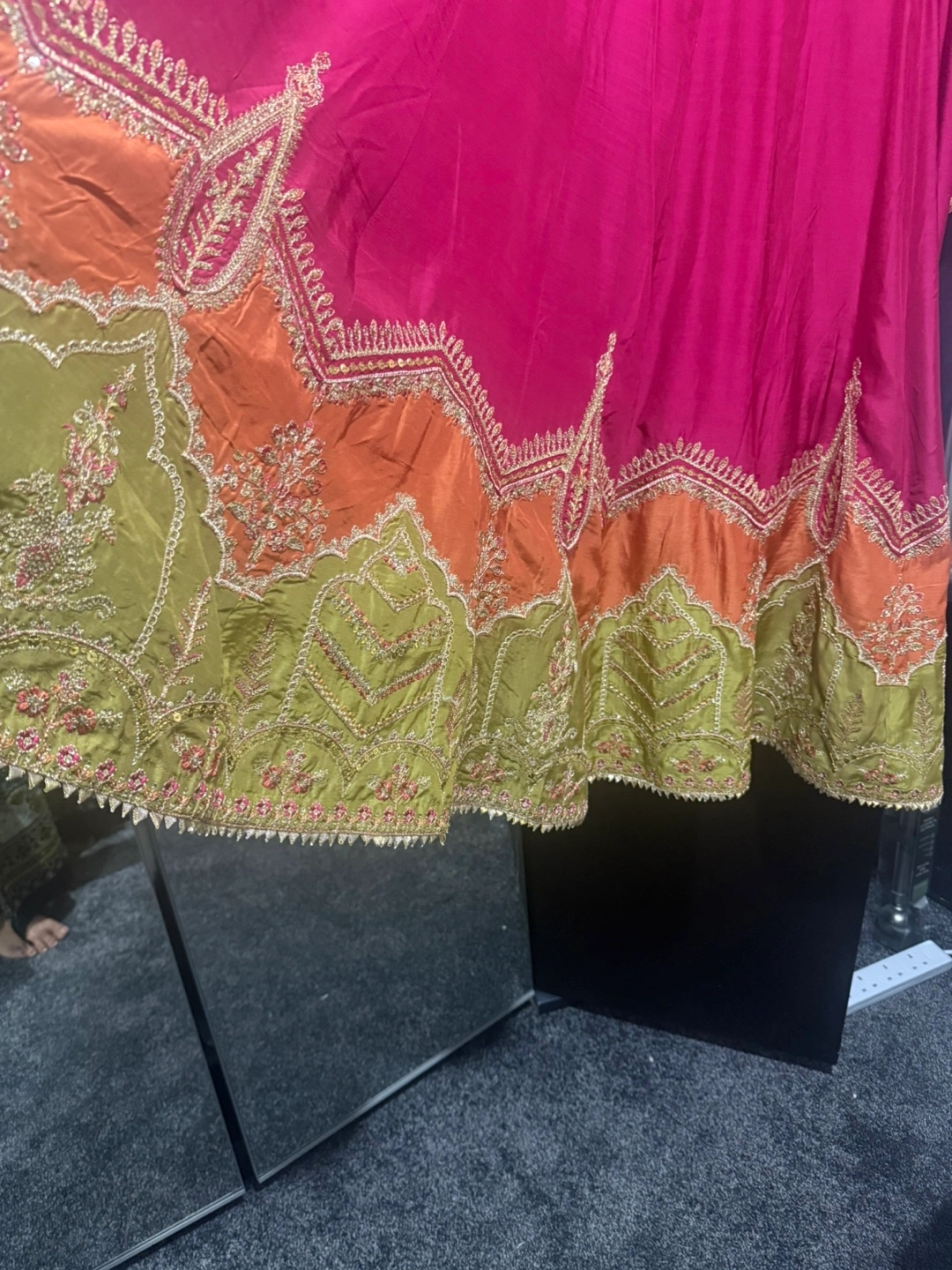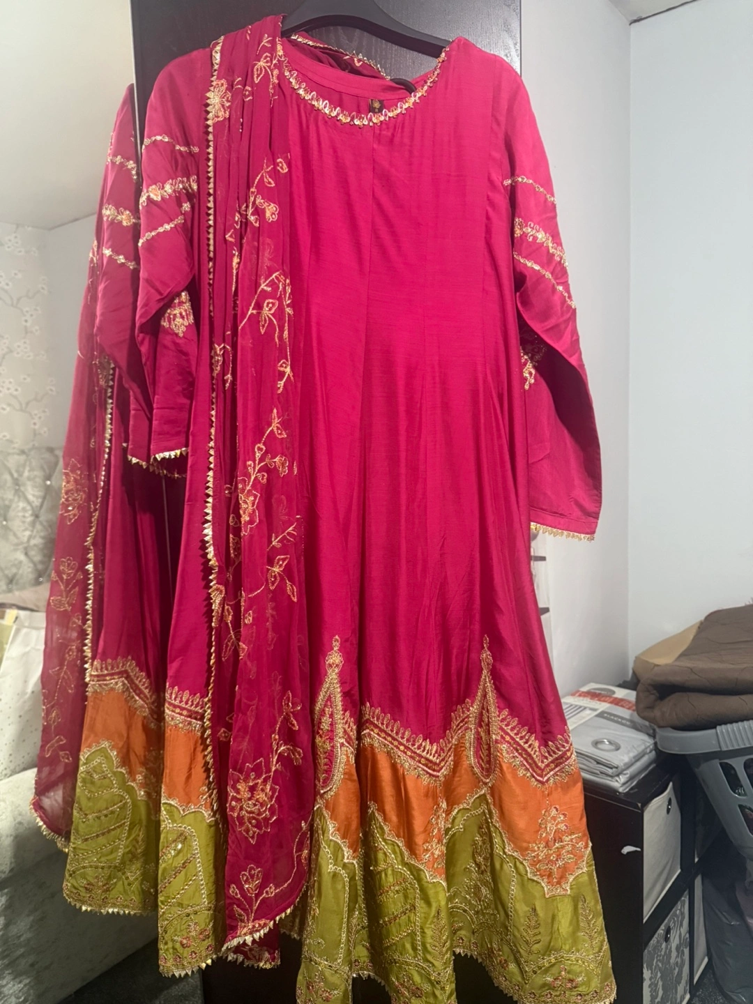4 reviewsBeautiful three-piece suit. Features intricate gold embroidery. Comes with a matching dupatta. Stunning magenta pink, orange and olive green colour scheme. A-line silhouette. Long sleeves. Round neck.